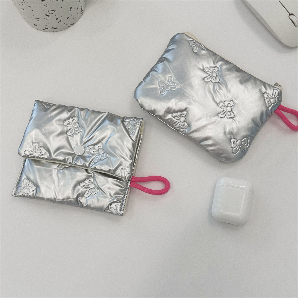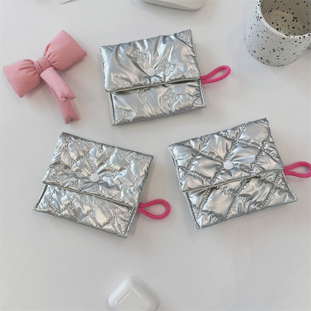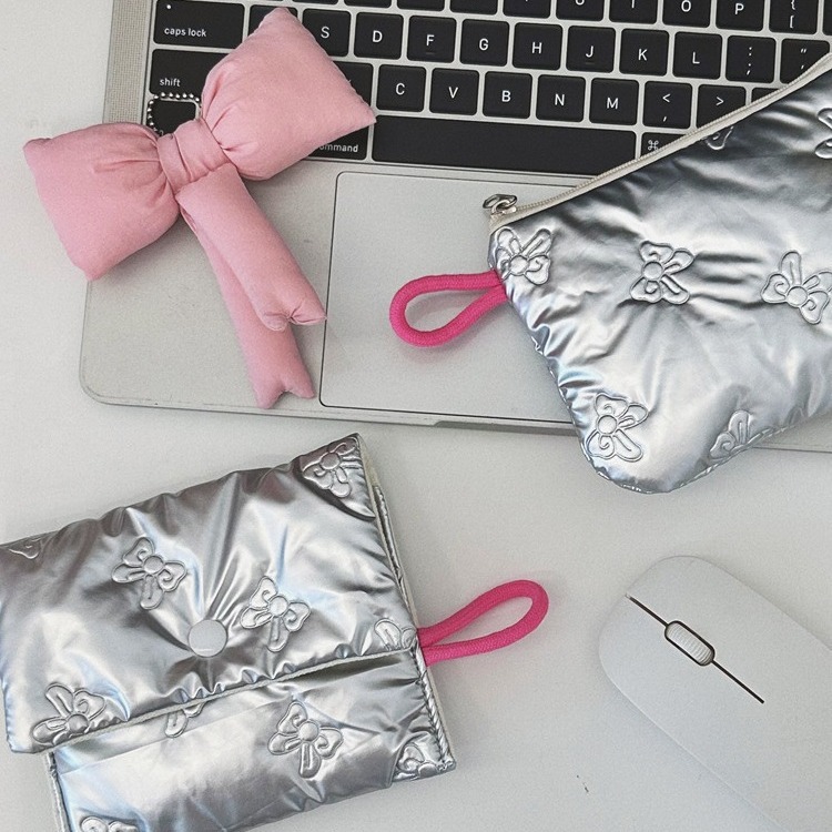 きらきらと輝くシルバーカラーに、立体感のあるハート型キルティングが施されたミニクラッチポーチ。