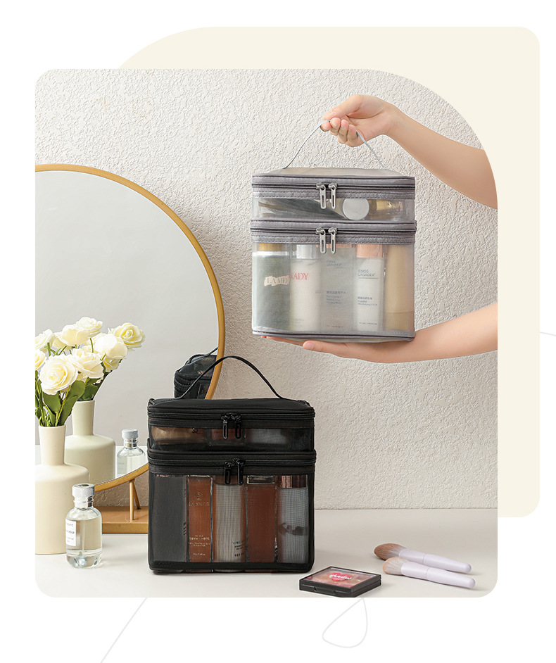 ナイロンメッシュ×二重層大容量トラベルコスメバッグ 洗えるナイロンメイク収納バッグ