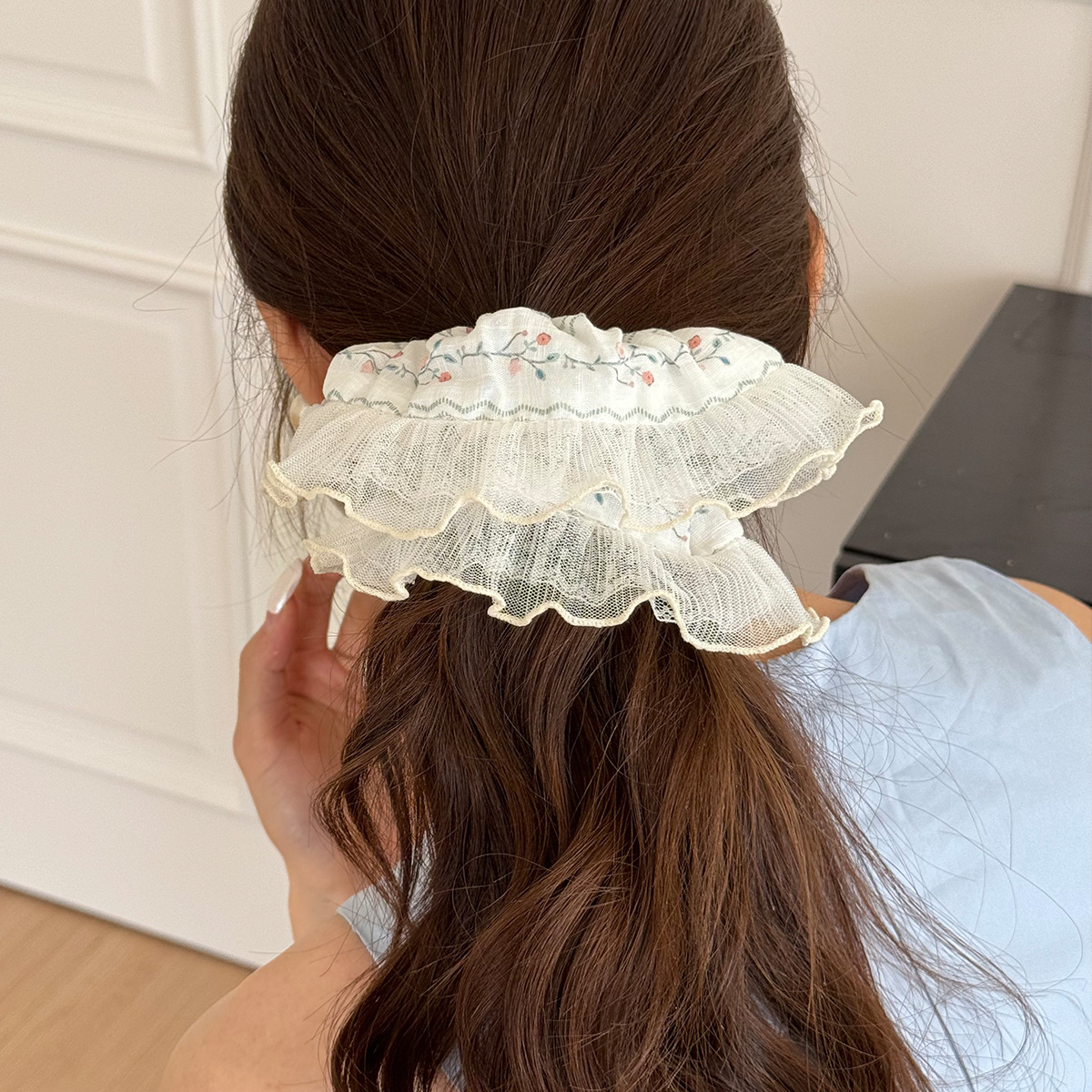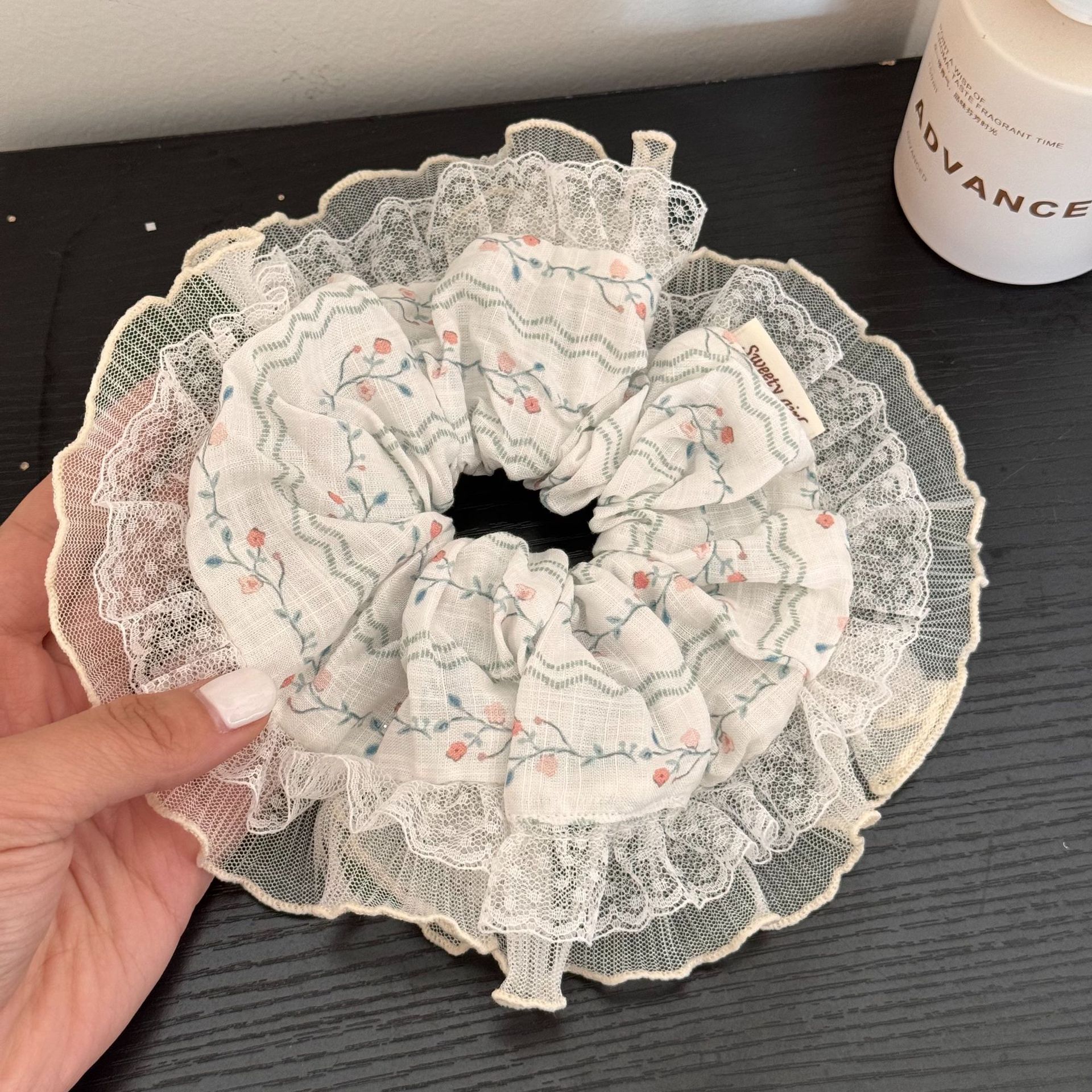 繊細なピンクフローラルプリントとたっぷりのレースフリルが可愛らしい大ぶりシュシュ。