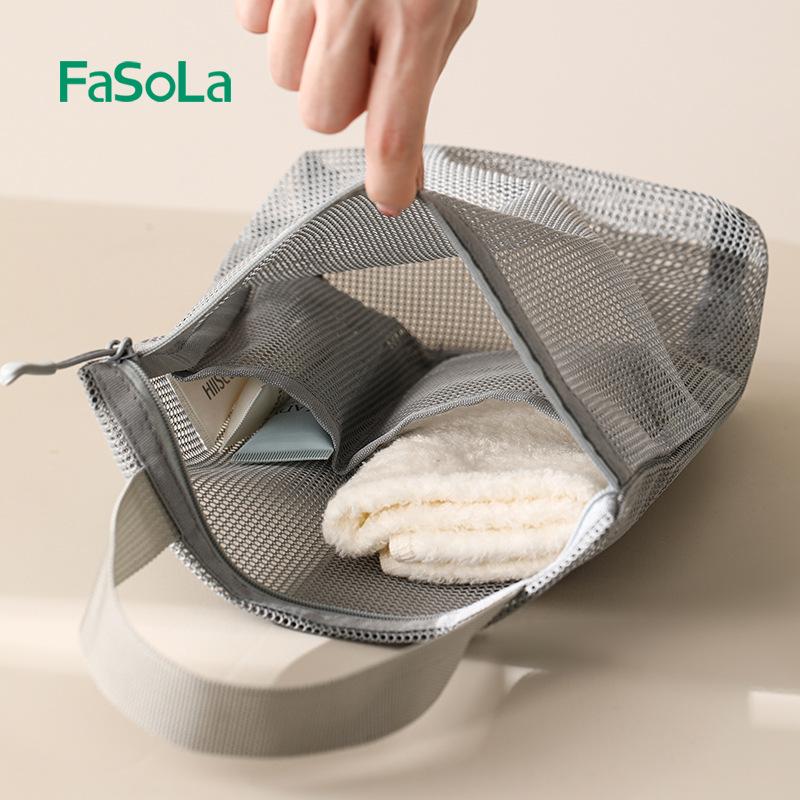 清潔感あるシンプルなデザインのメッシュトイレタリーバッグ。