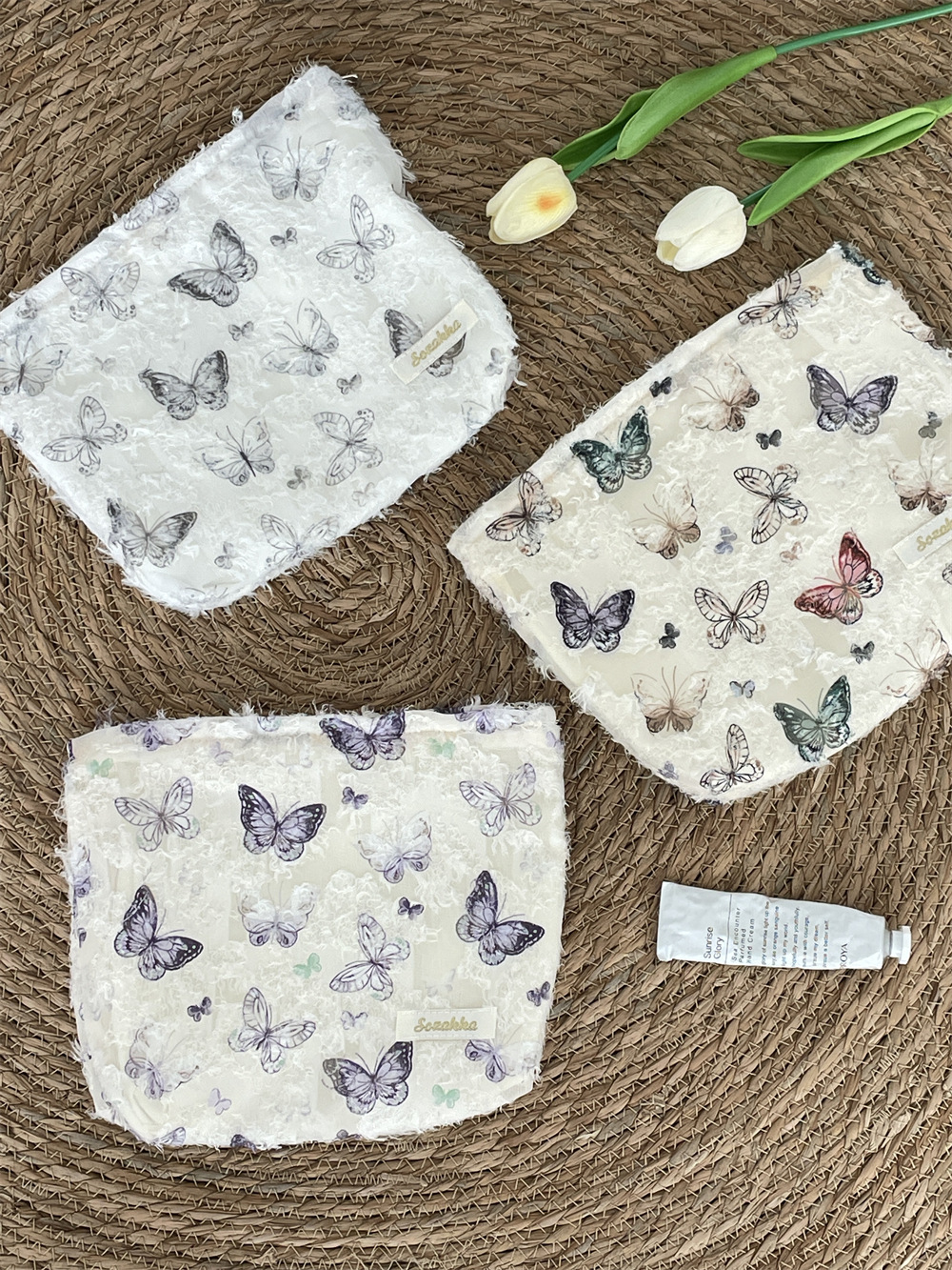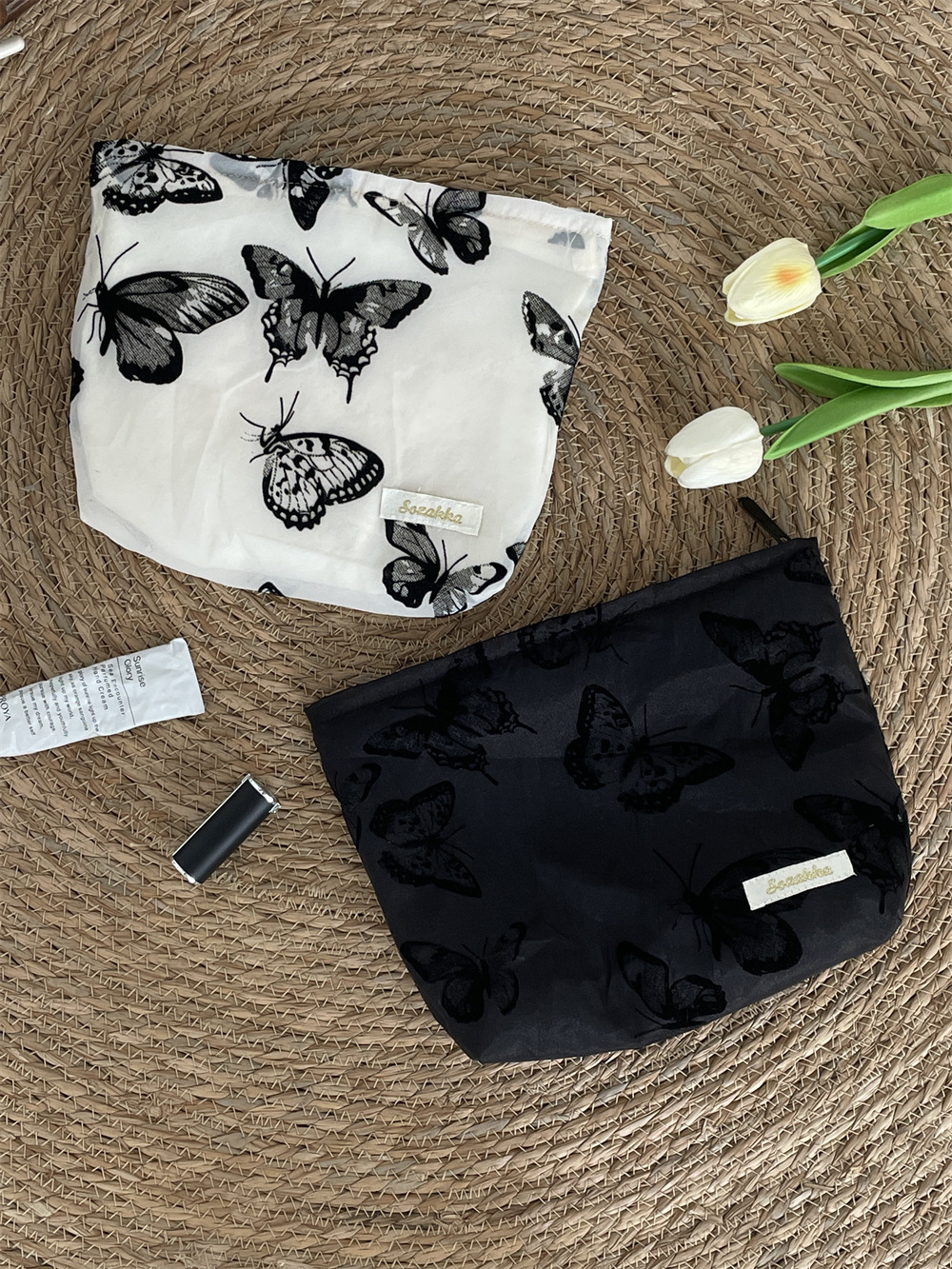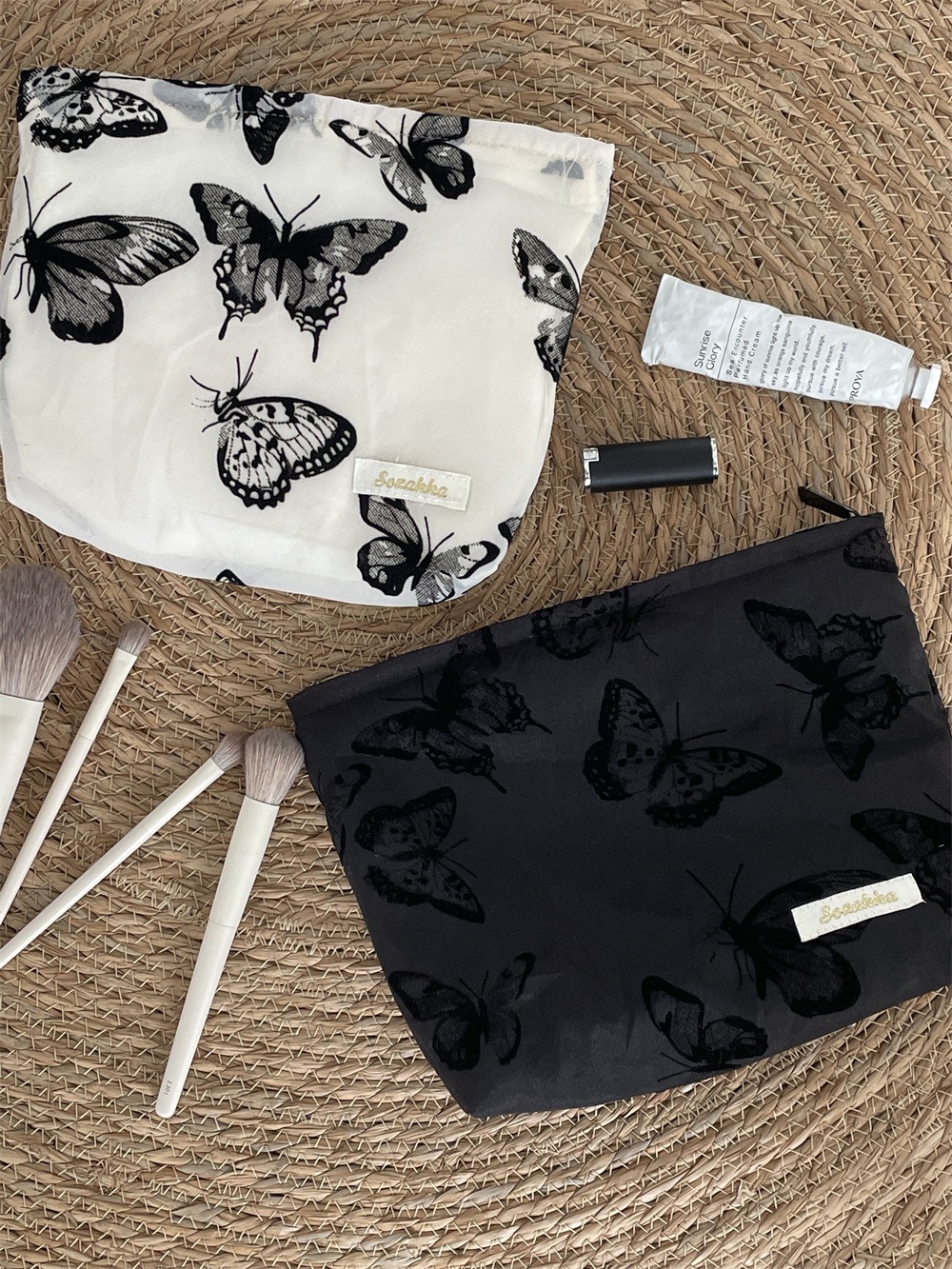 ふんわりとしたレース素材に、繊細なバタフライプリントをあしらった感性派コスメポーチ。