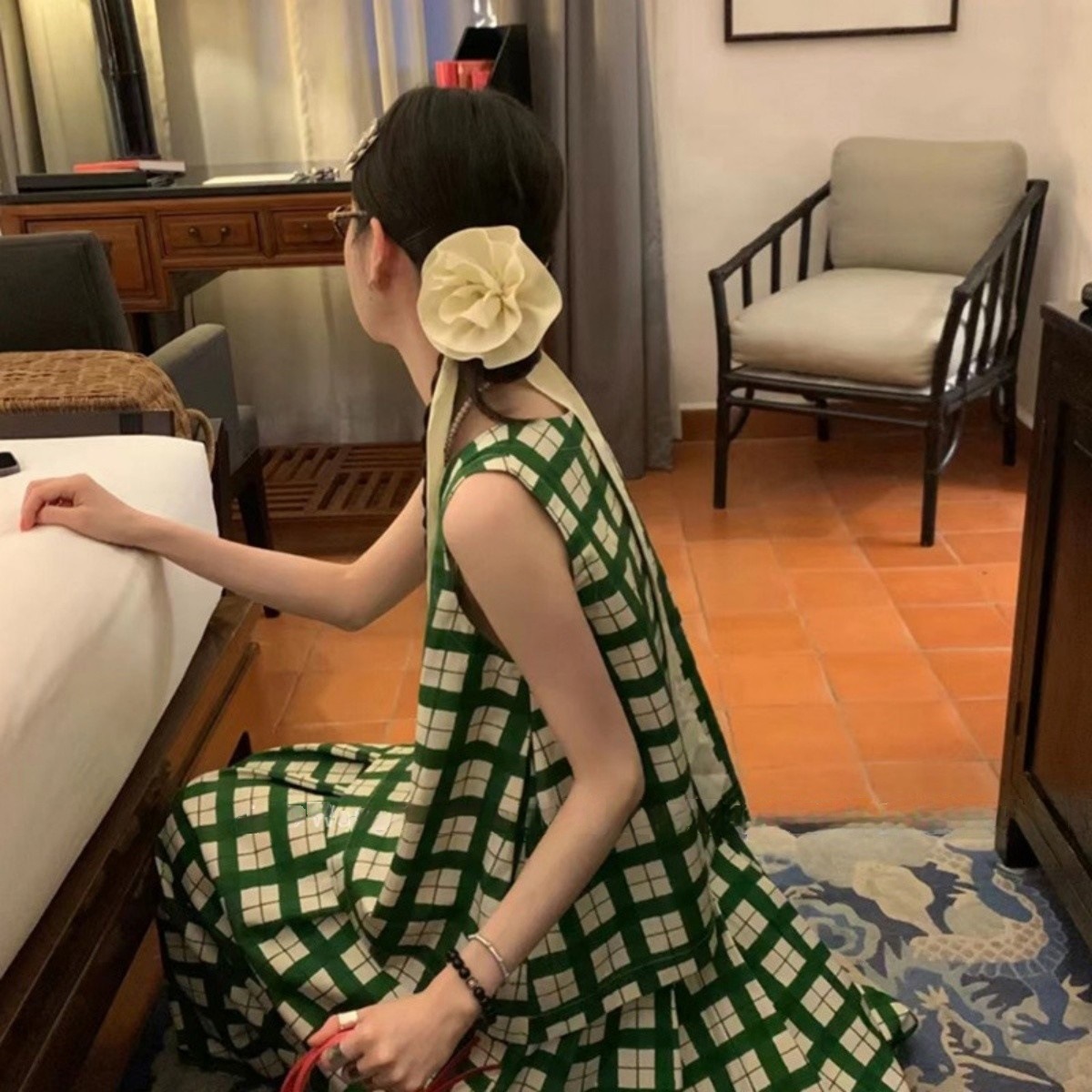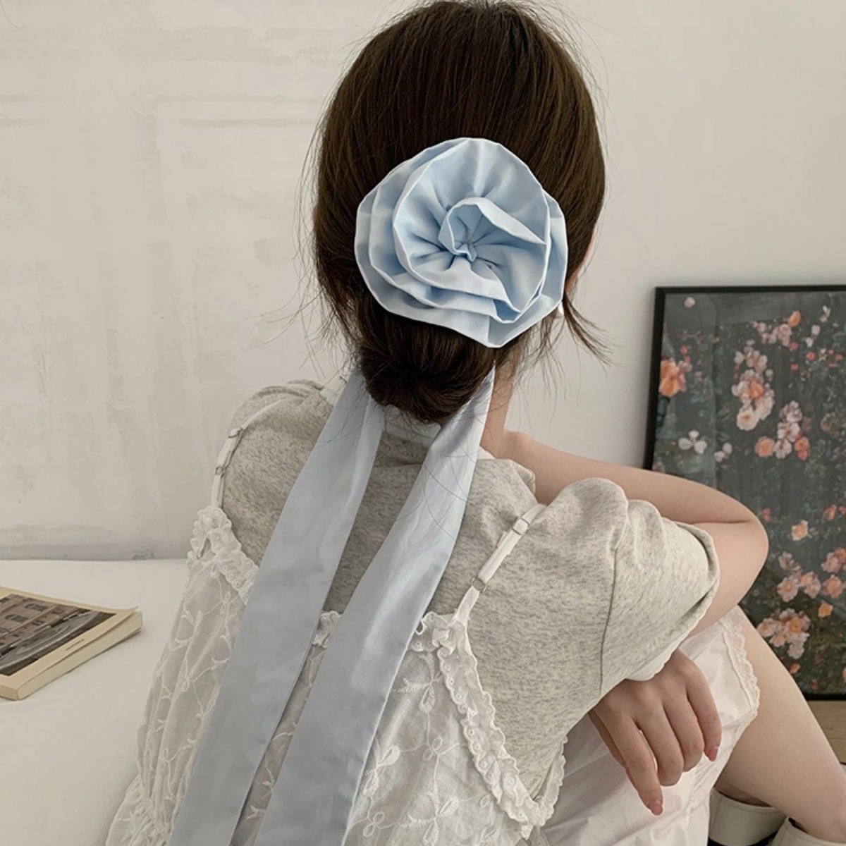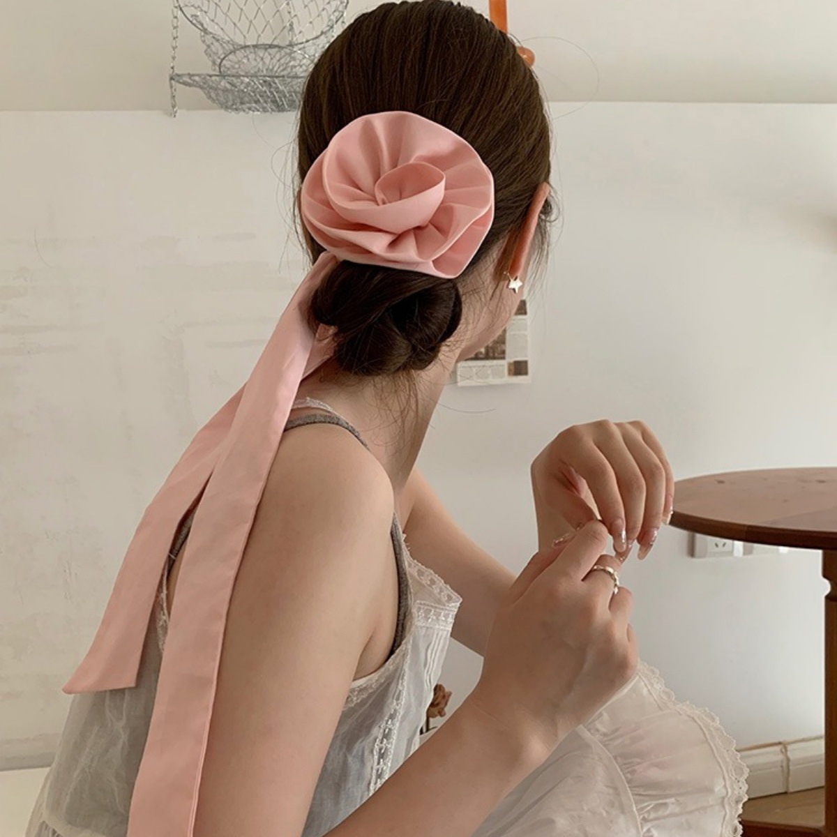 大きなローズデザインコイルヘアタイ&ロングリボンヘッドバンド