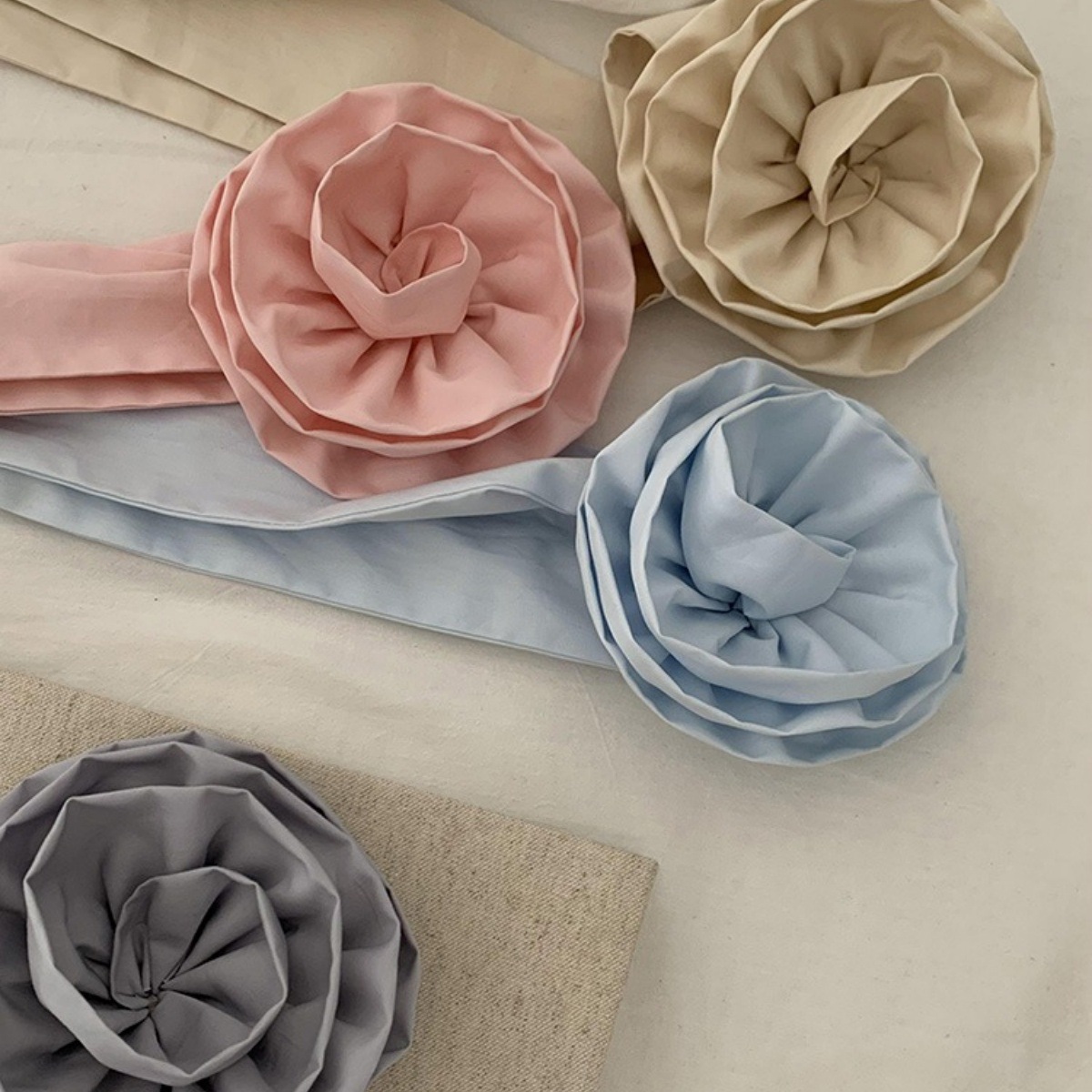大きなローズのように見えるデザインが魅力のコイルヘアタイ&ロングリボンヘッドバンド。