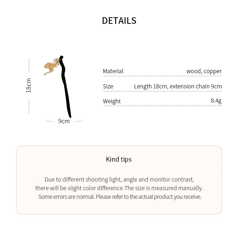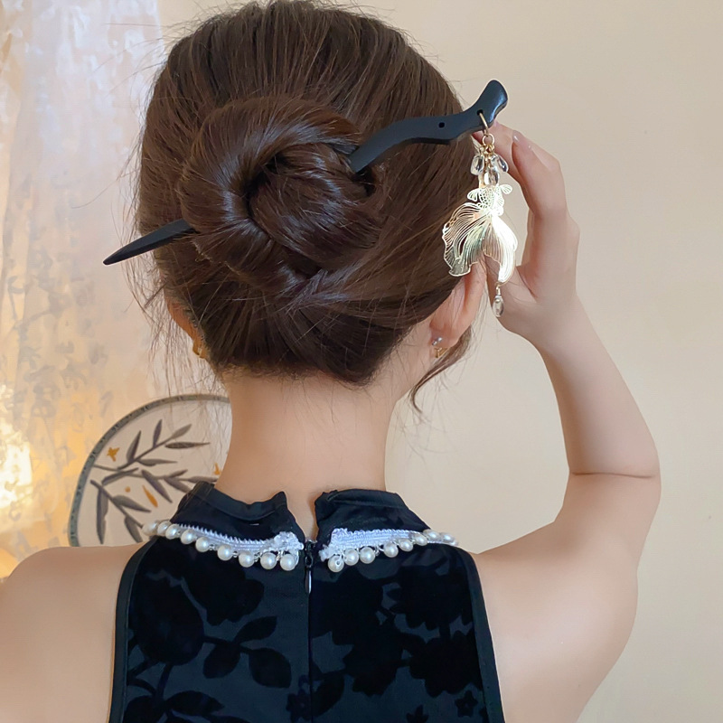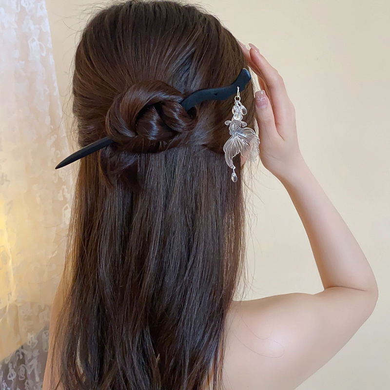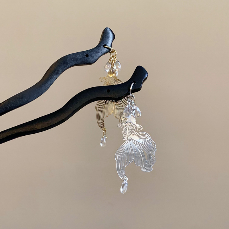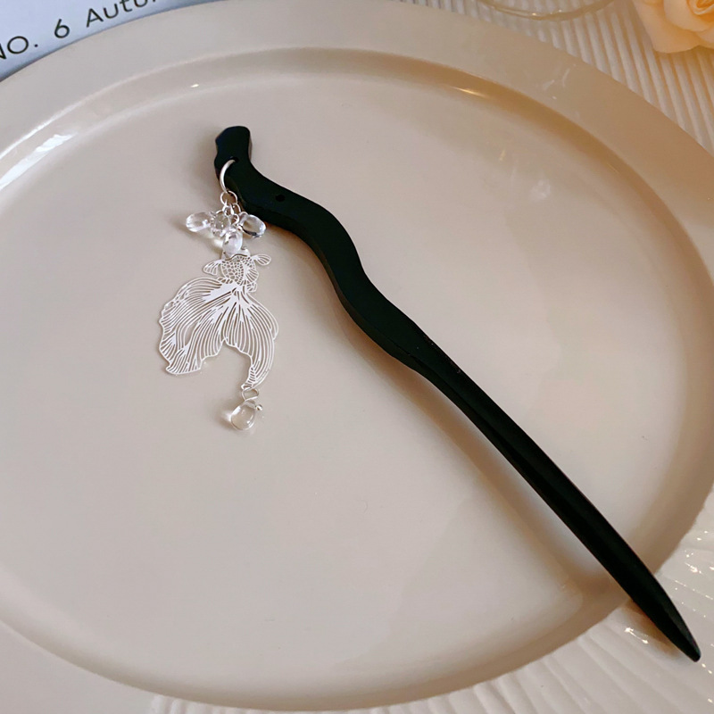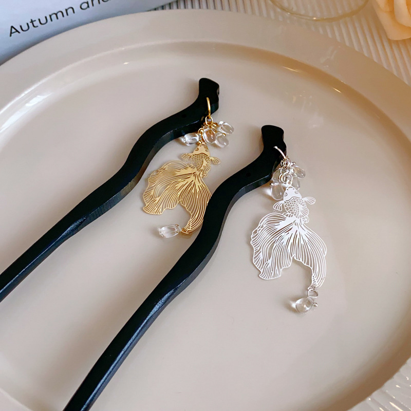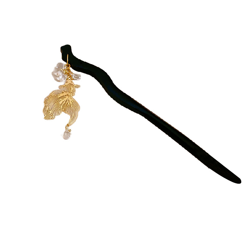 This wooden hairpin features an elegant carp motif charm , resembling a fish swimming in a tranquil pond. The charm sways lightly between your hair, adding a sophisticated charm to your movements.