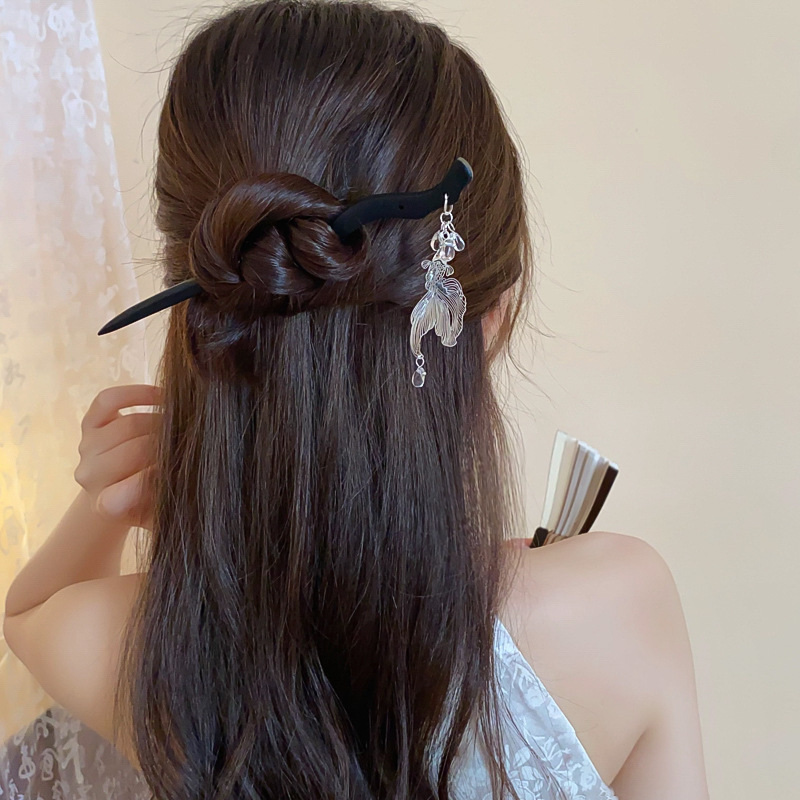Wooden hairpin with carp motif and charm, dangling Chinese-style hair stick🌿✨