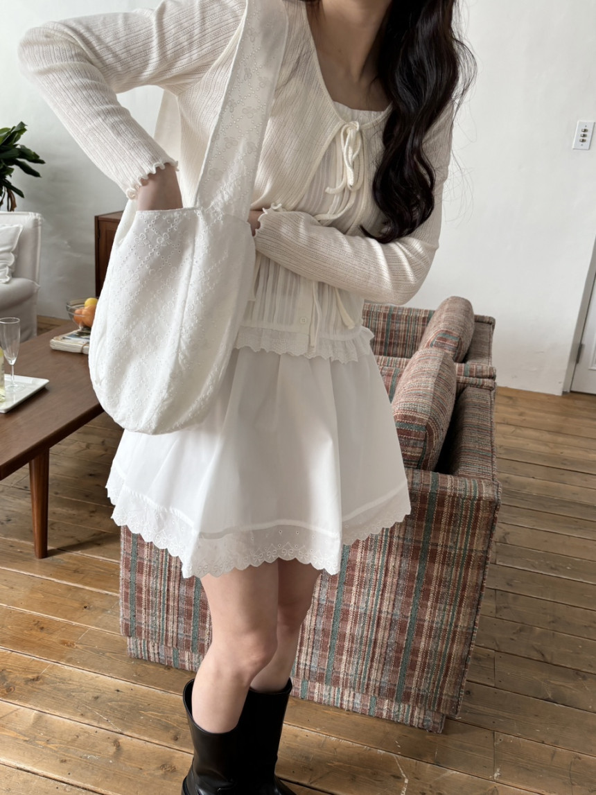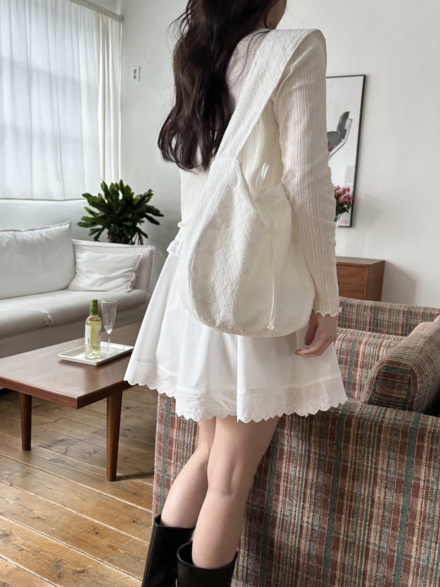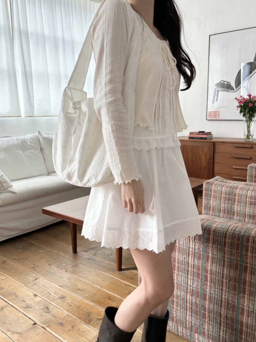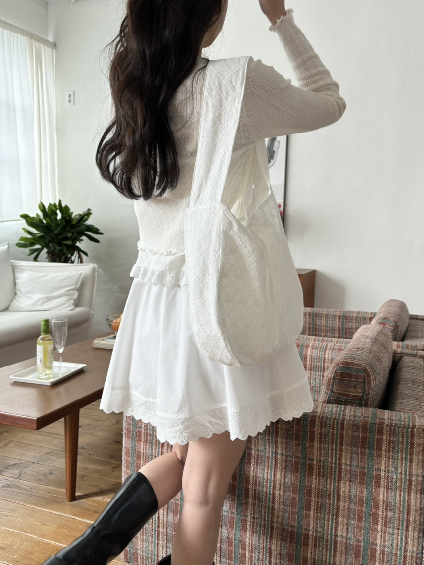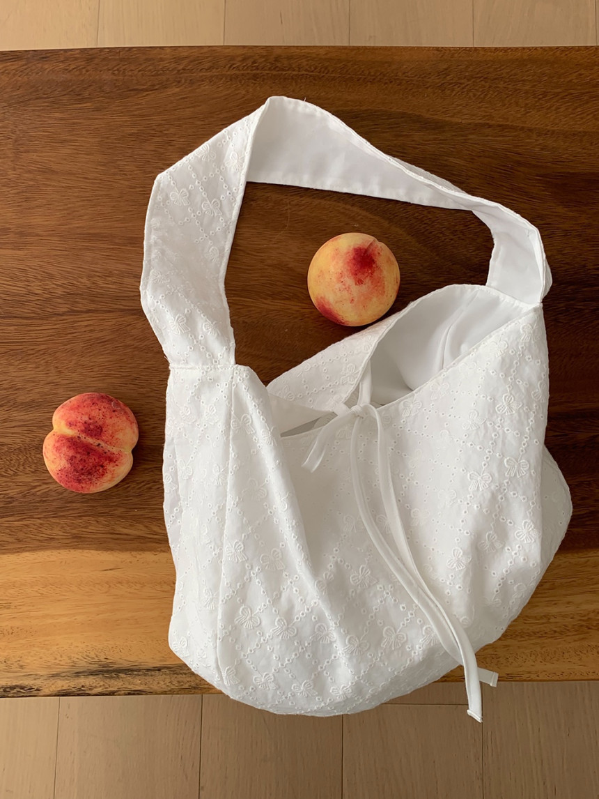 清楚なコットンレースとリボンアップディテールが女性らしいミニトートバッグ。