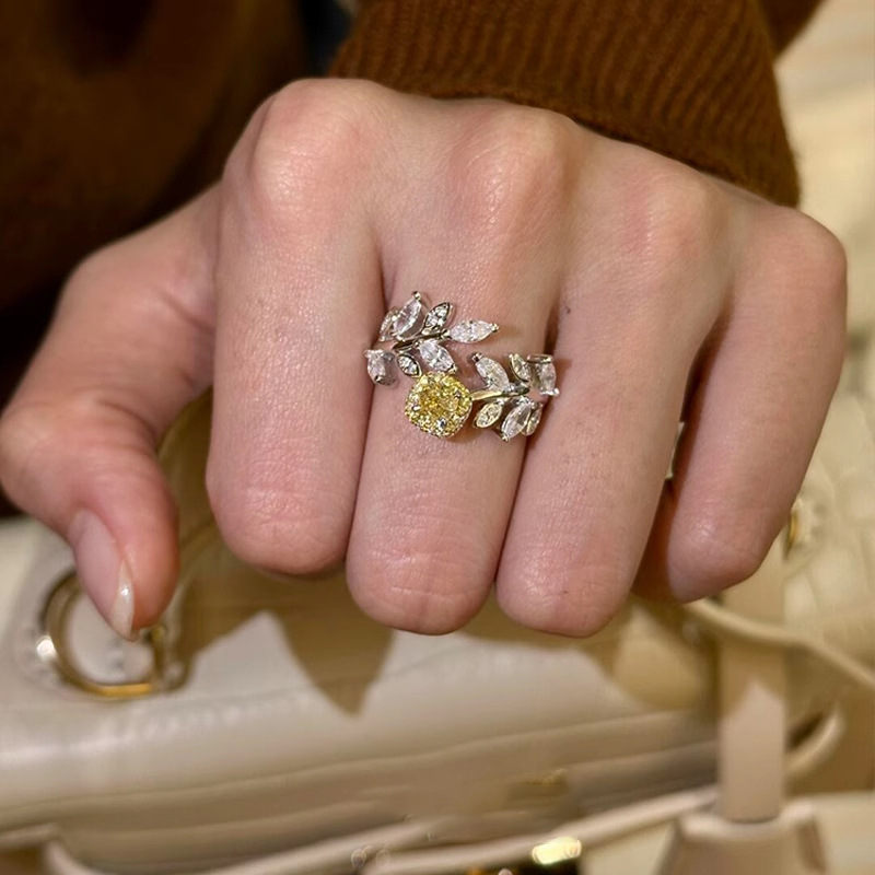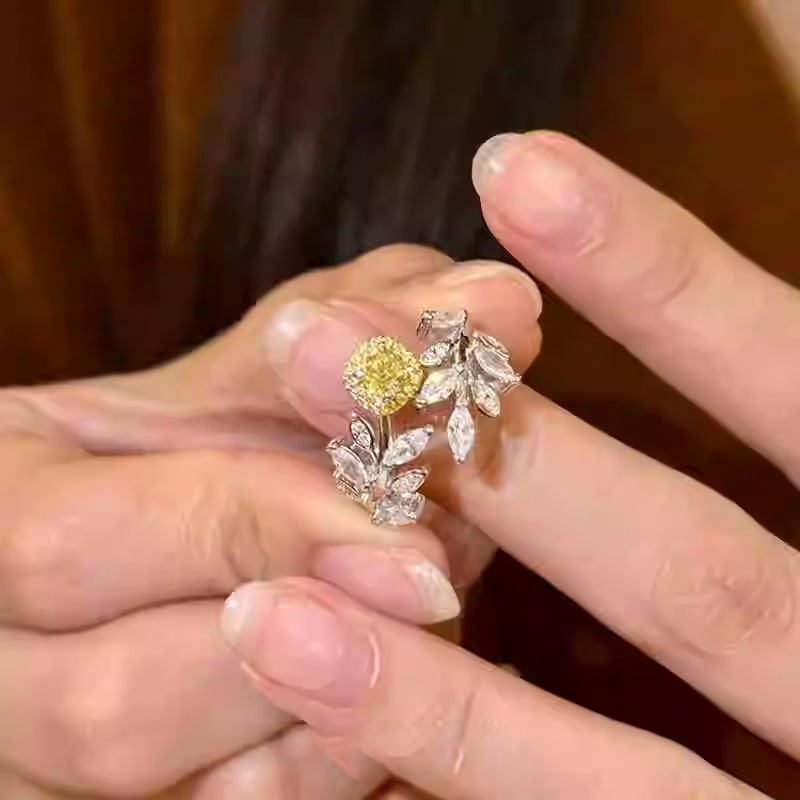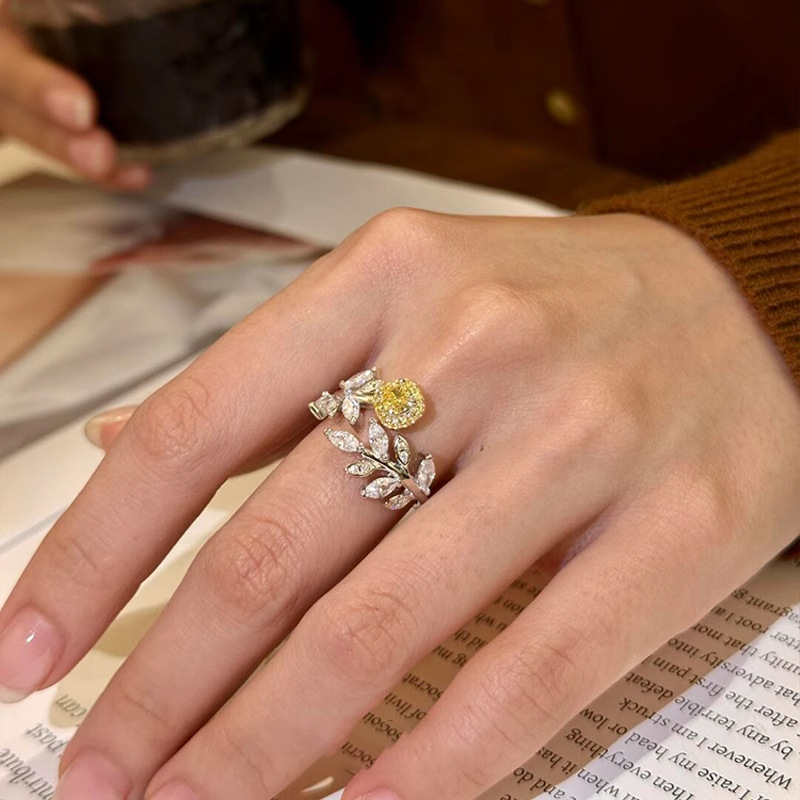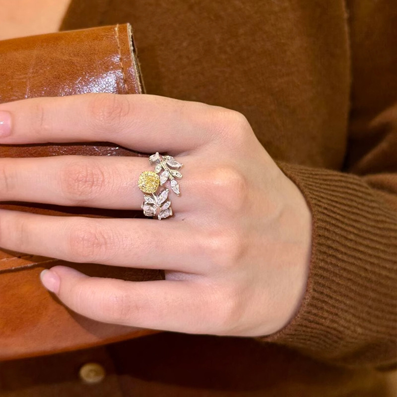 A small garden blooming on your finger! This open ring features a wheat ear (or leaf) motif with clear cubic zirconia (cz) set around a dazzling yellow cubic zirconia (cz ) that gently wraps around your finger.
