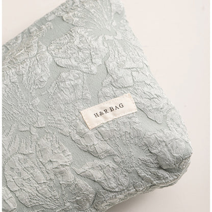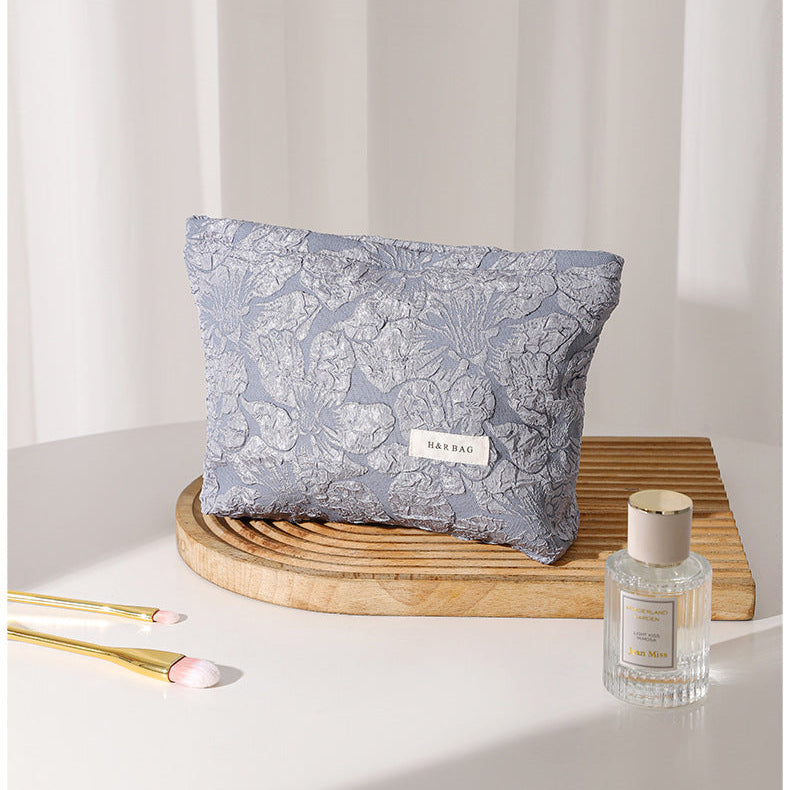 エンボス加工のフラワーデザインが特徴的な、柔らかいキャンバス素材の大容量収納ポーチ。