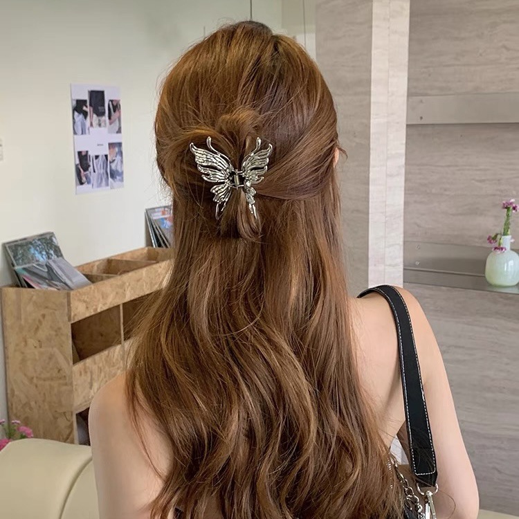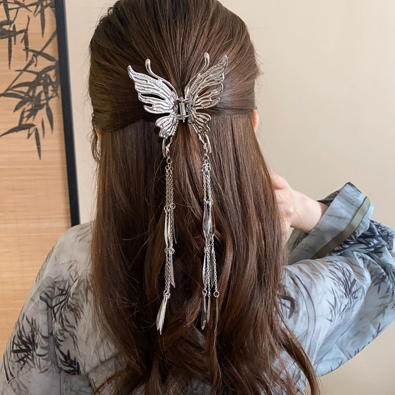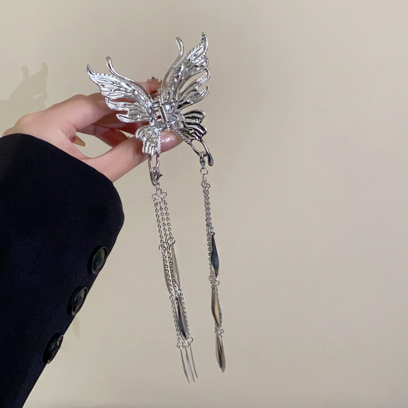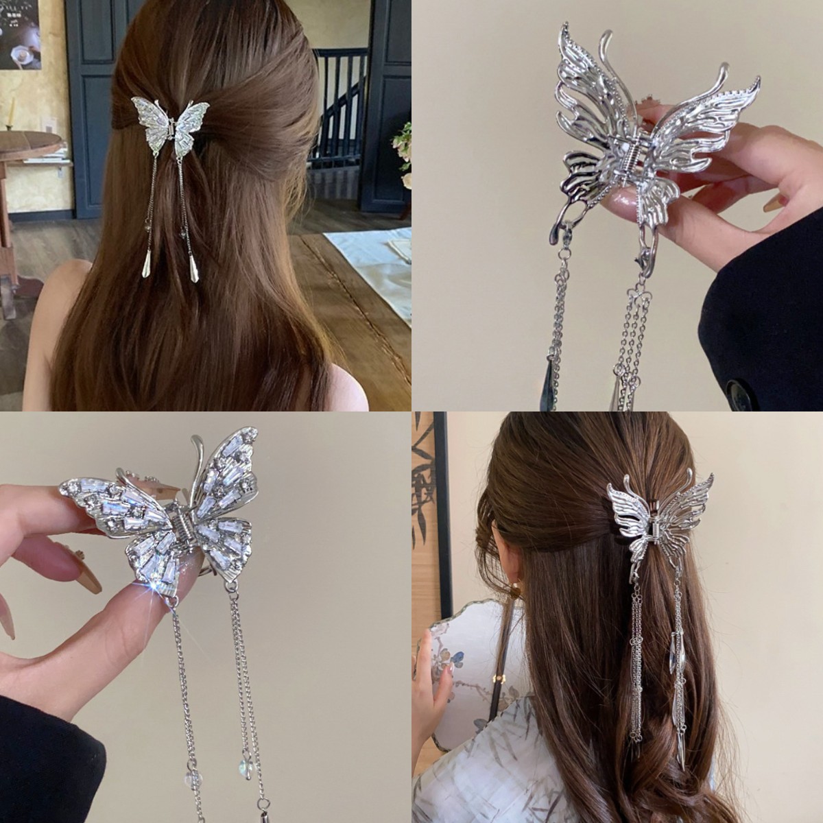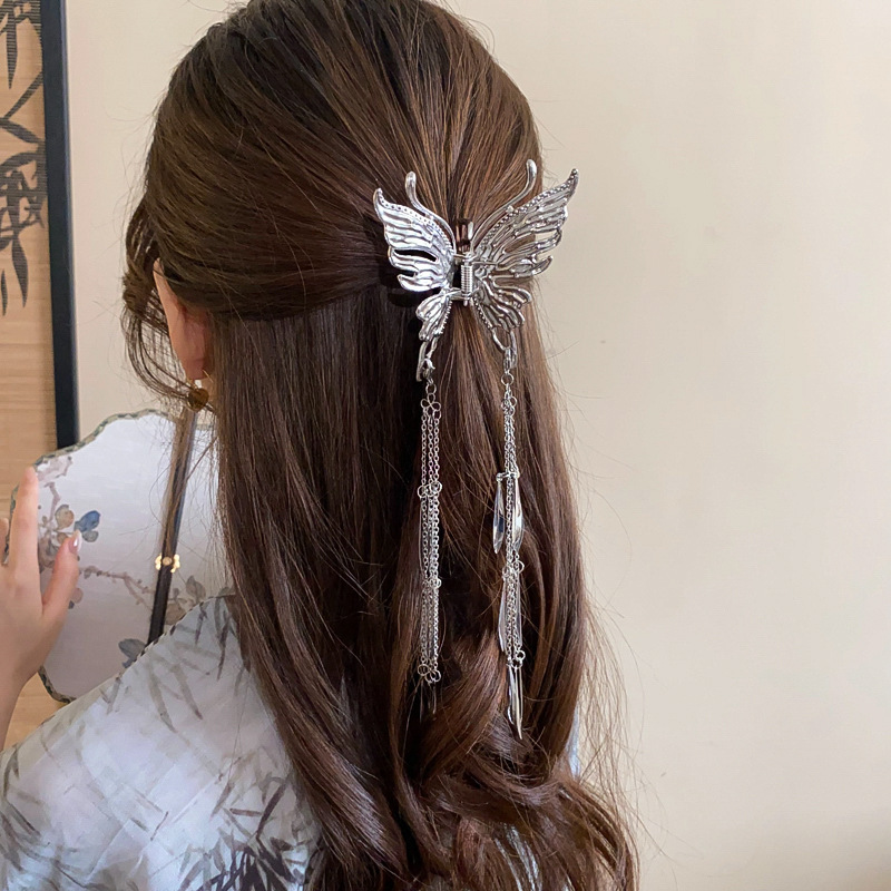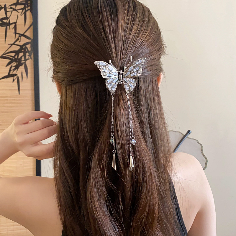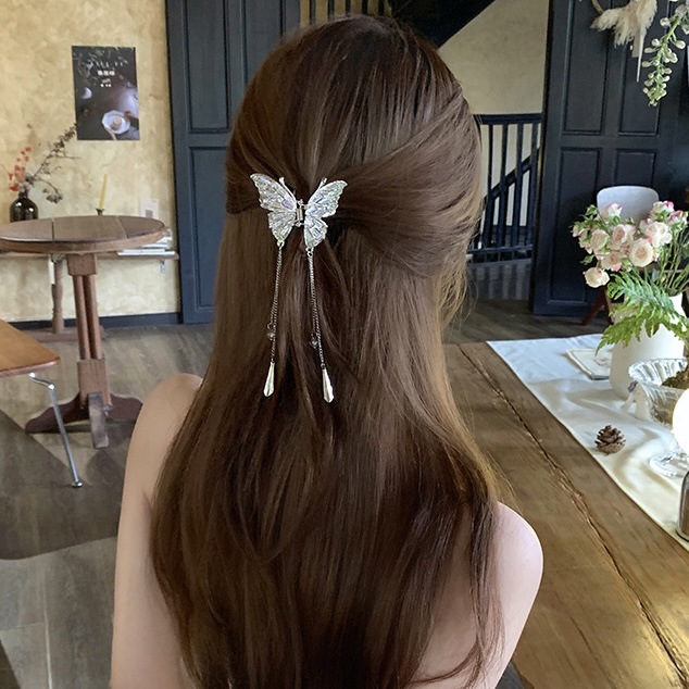 視線を集める、特別なヘアクリップはいかがですか? キラキラ輝く蝶々の下で、優雅に揺れるタッセルが動きに合わせて魅力を振りまくバンスクリップです。