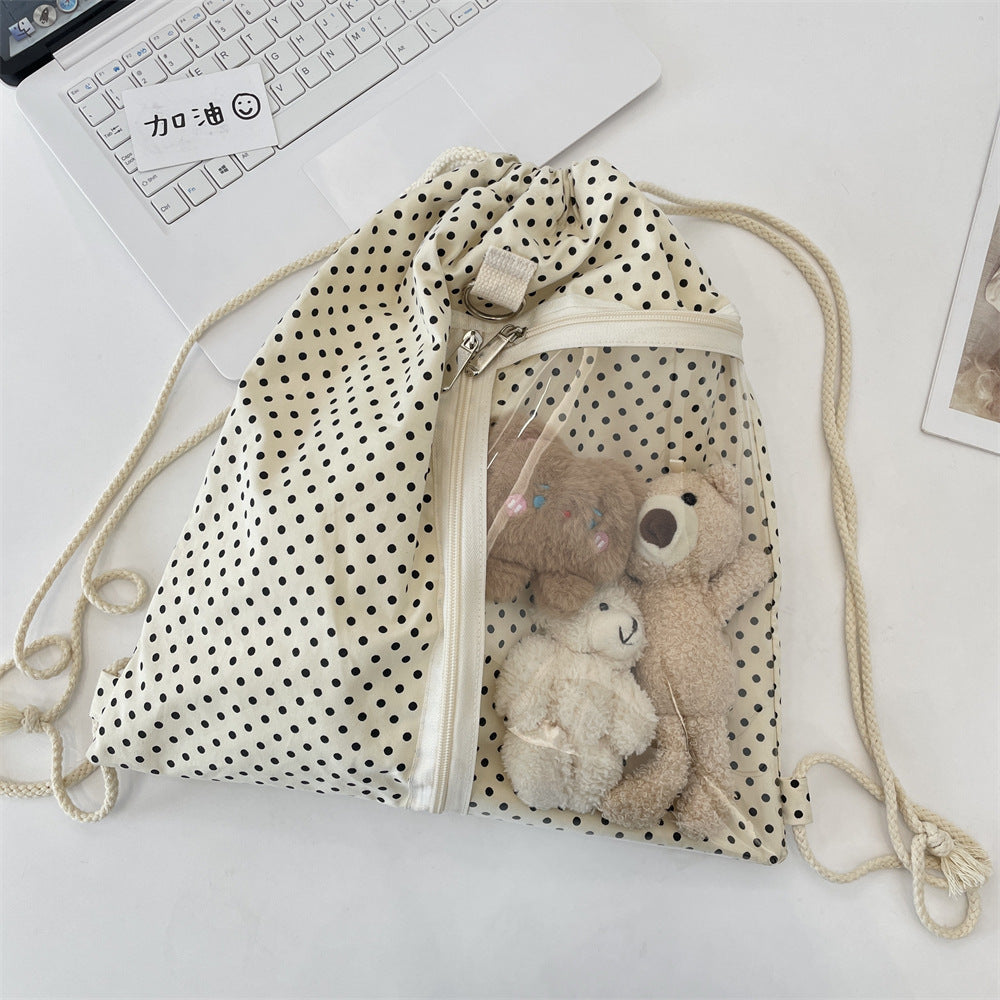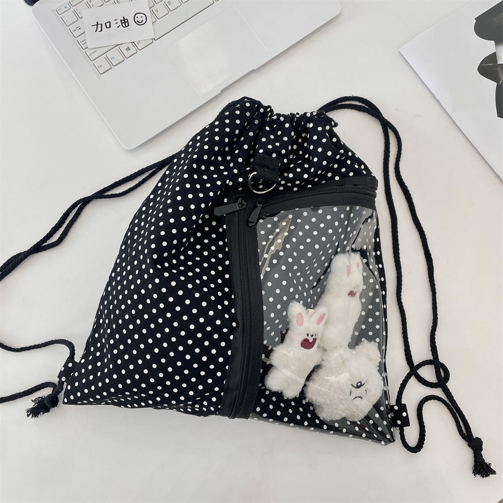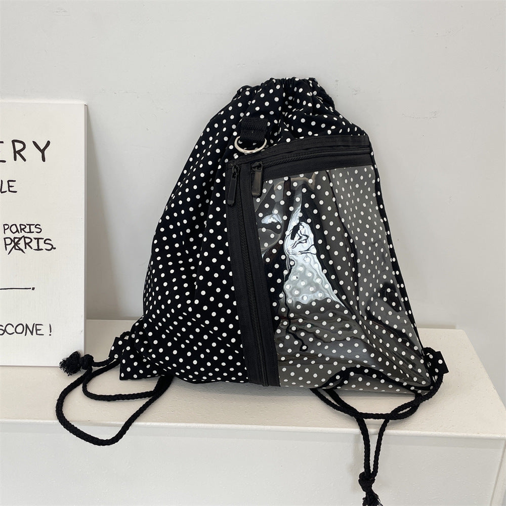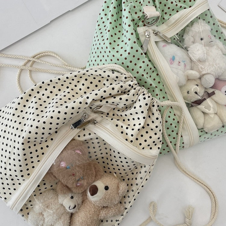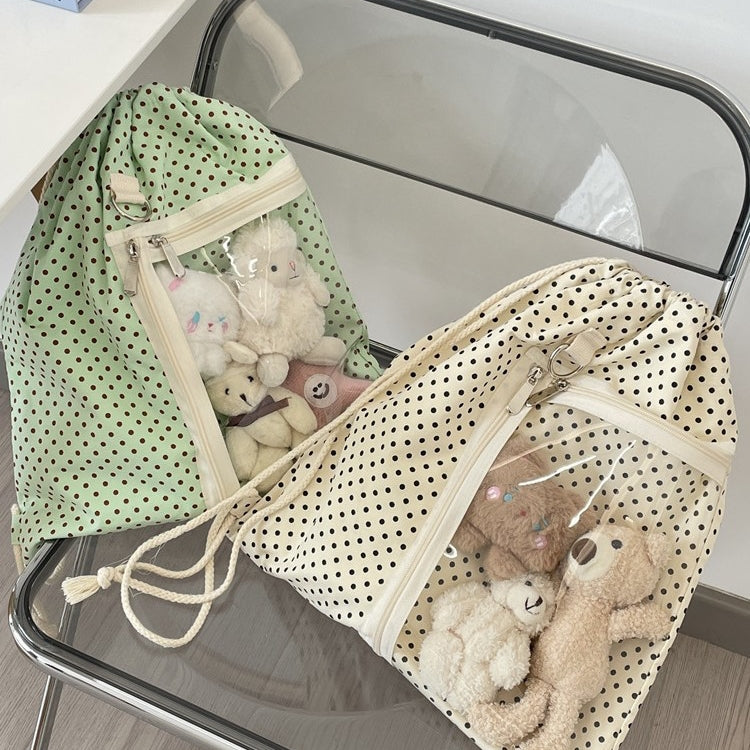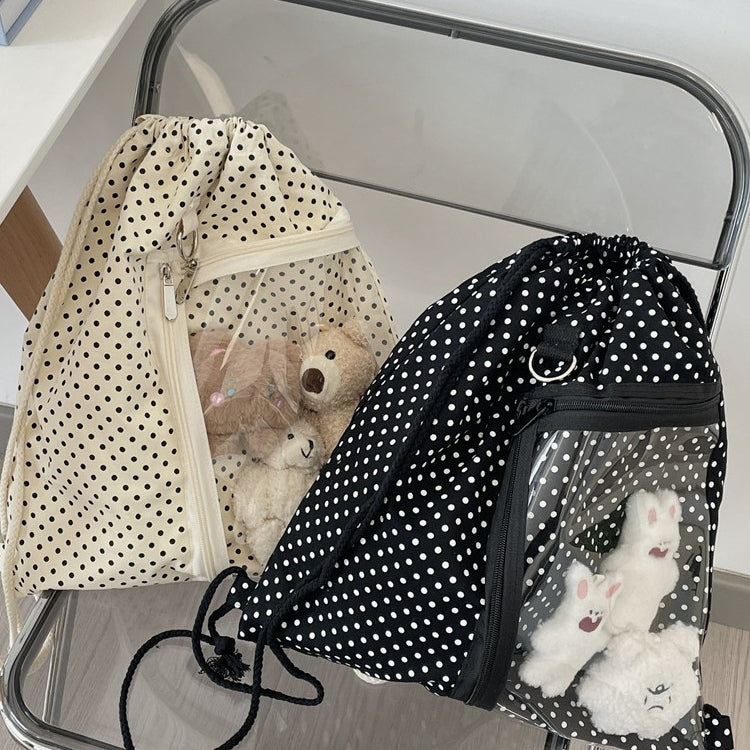 🎒 ドット柄のキャンバスにPVCクリアポケットがほど良いアクセントを添える、遊び心あるバックパックです。