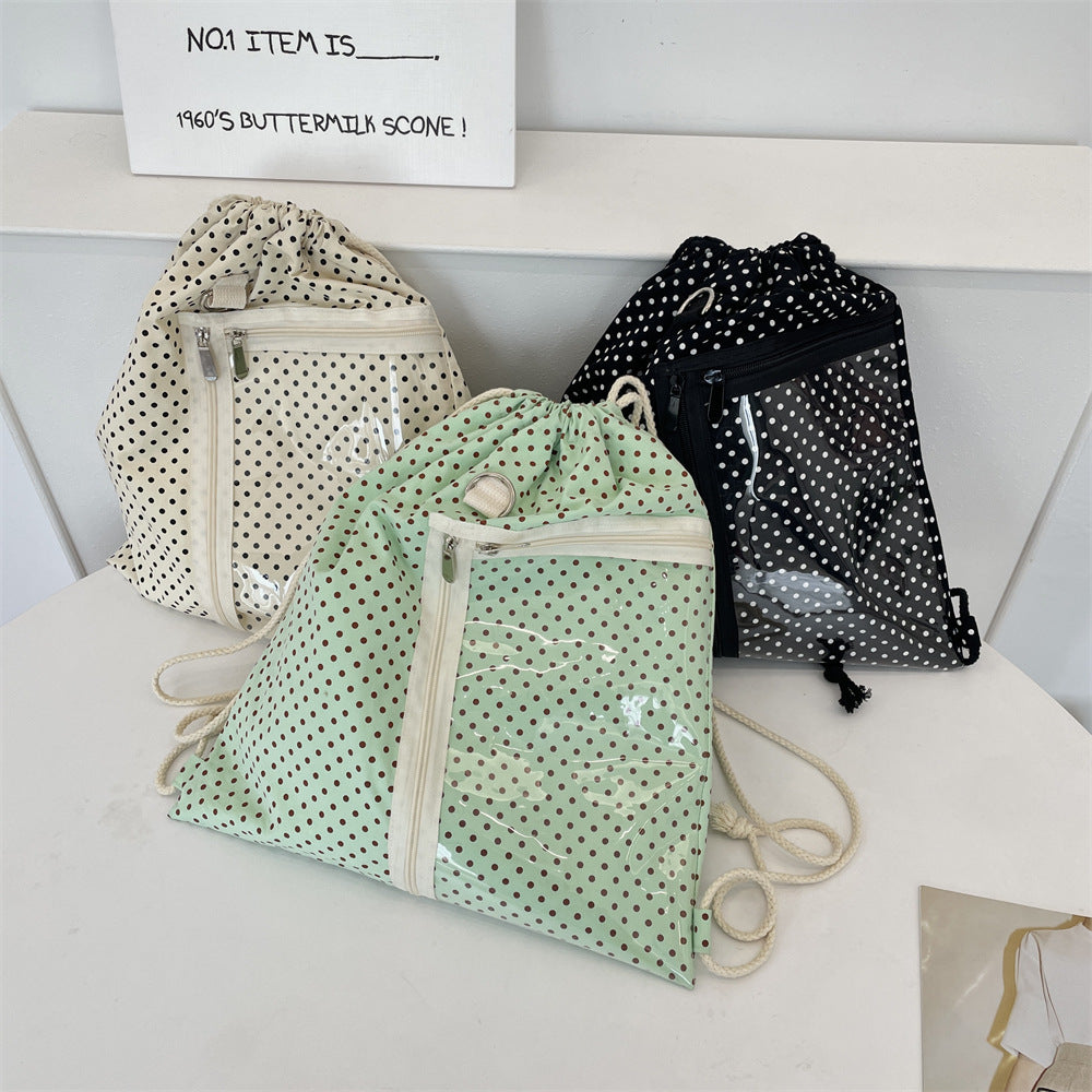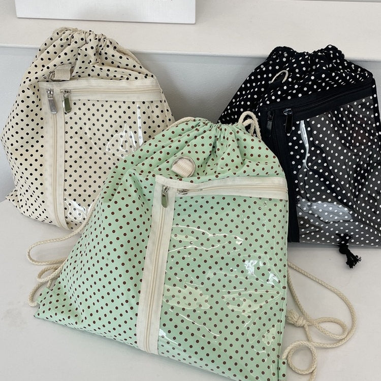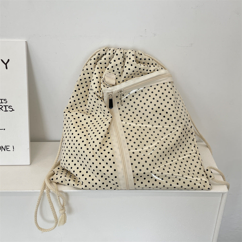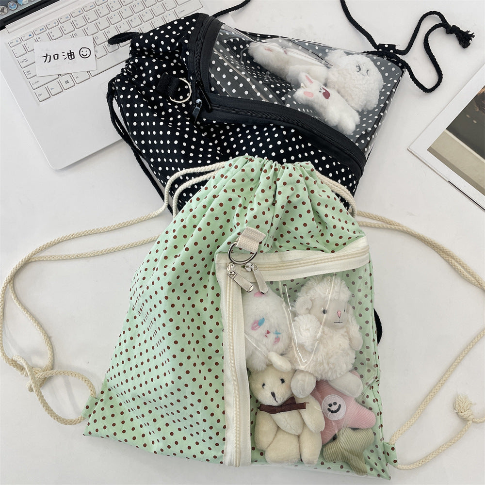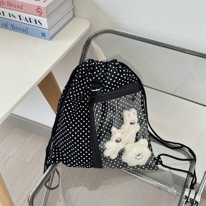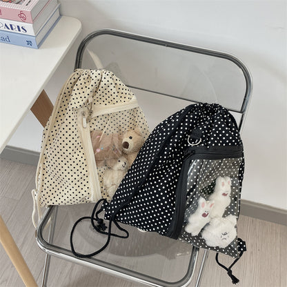 🎒 ドット柄のキャンバスにPVCクリアポケットがほど良いアクセントを添える、遊び心あるバックパックです。
