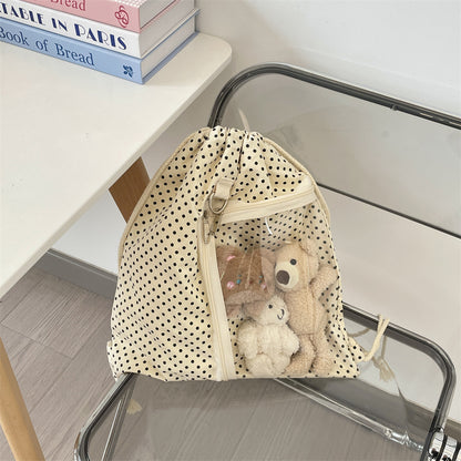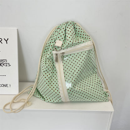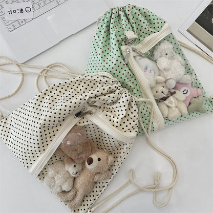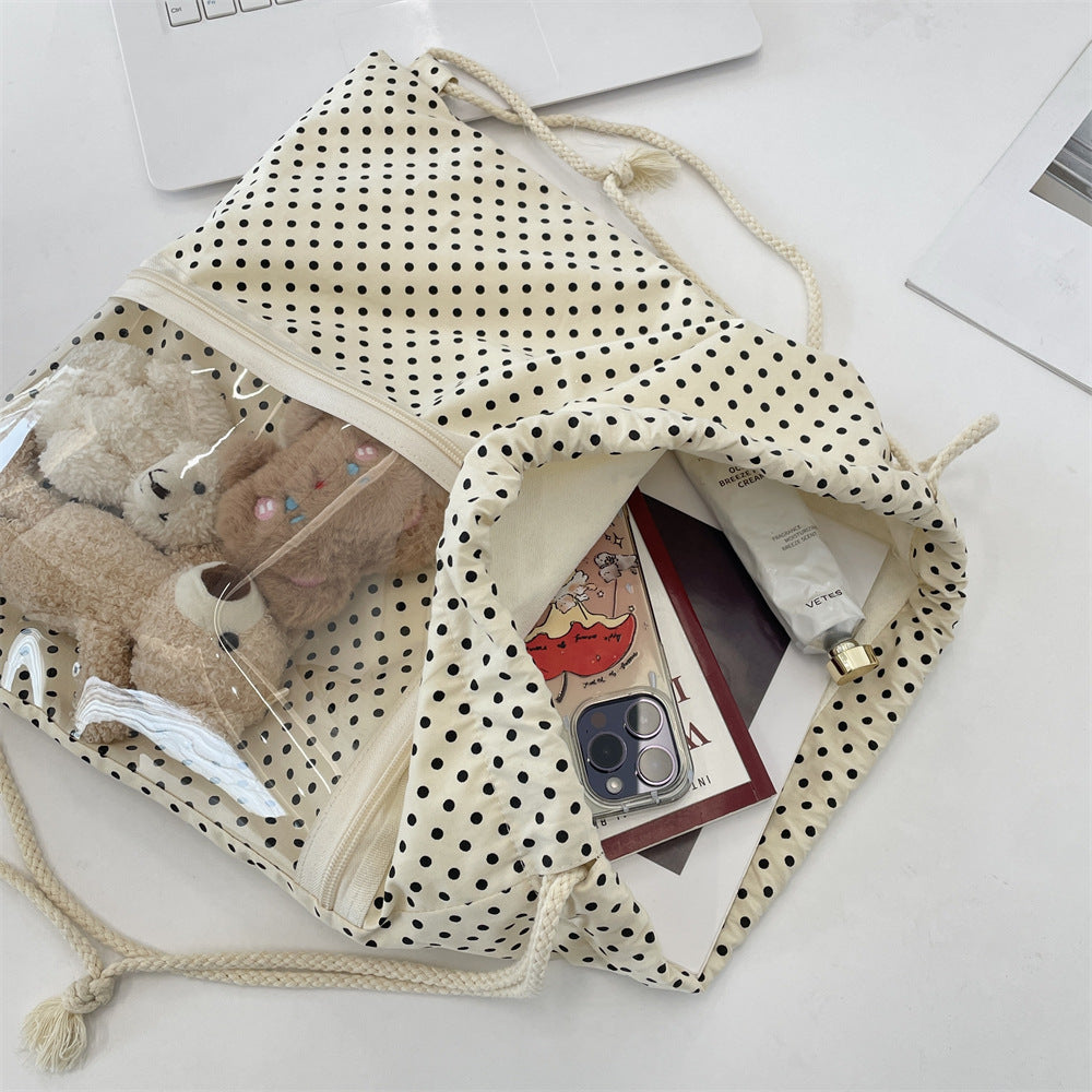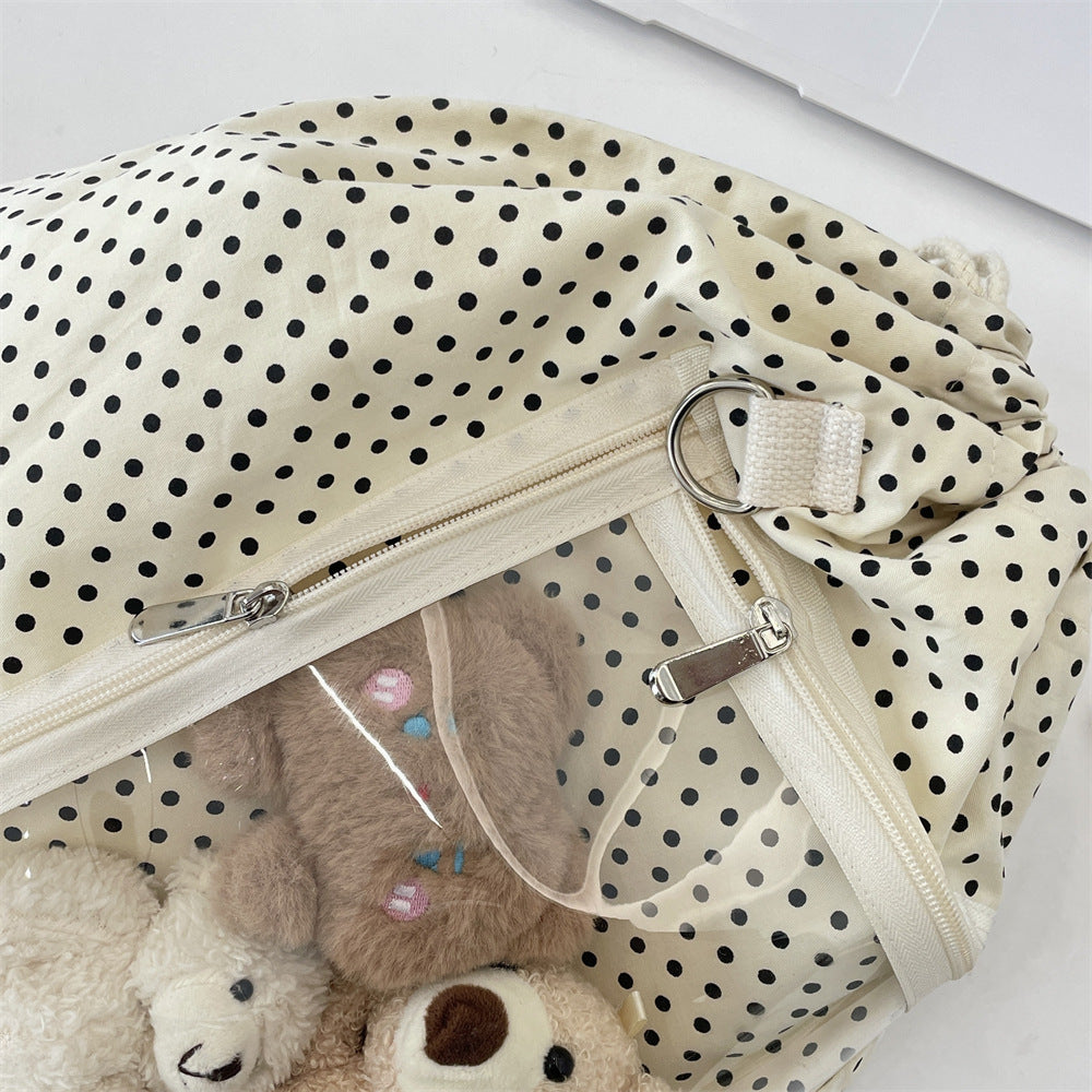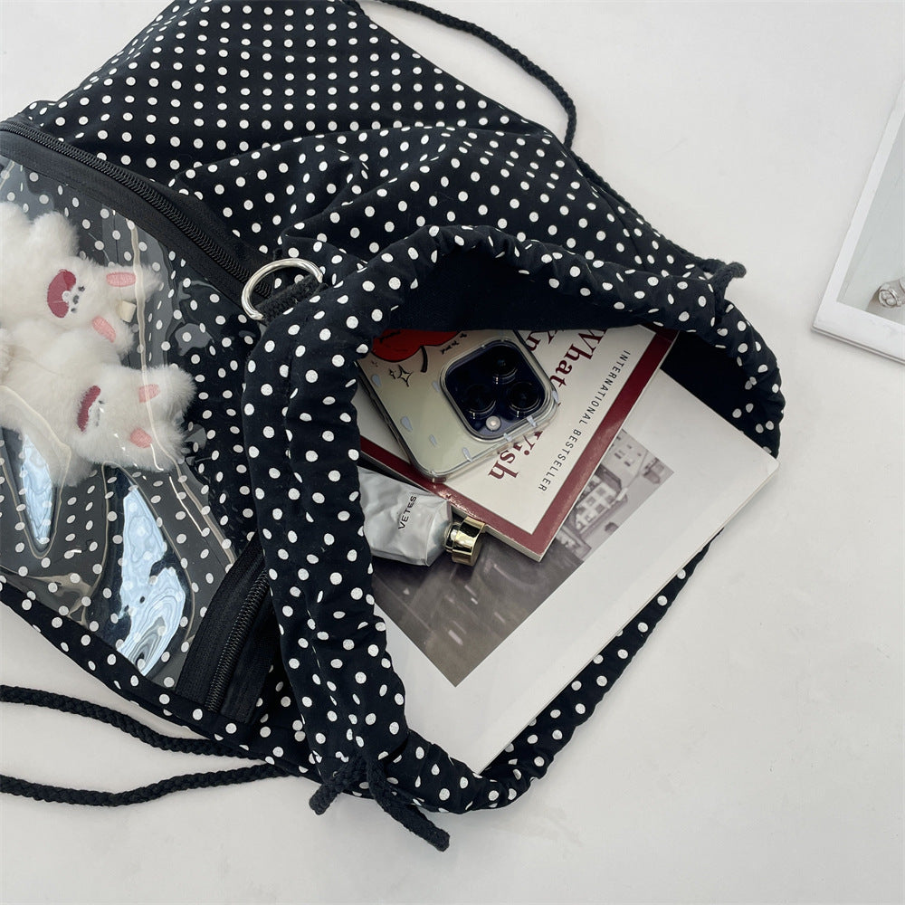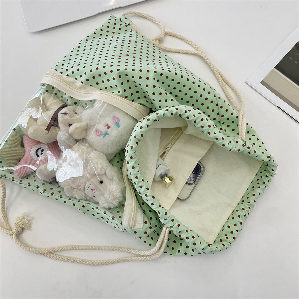🎒 ドット柄のキャンバスにPVCクリアポケットがほど良いアクセントを添える、遊び心あるバックパックです。