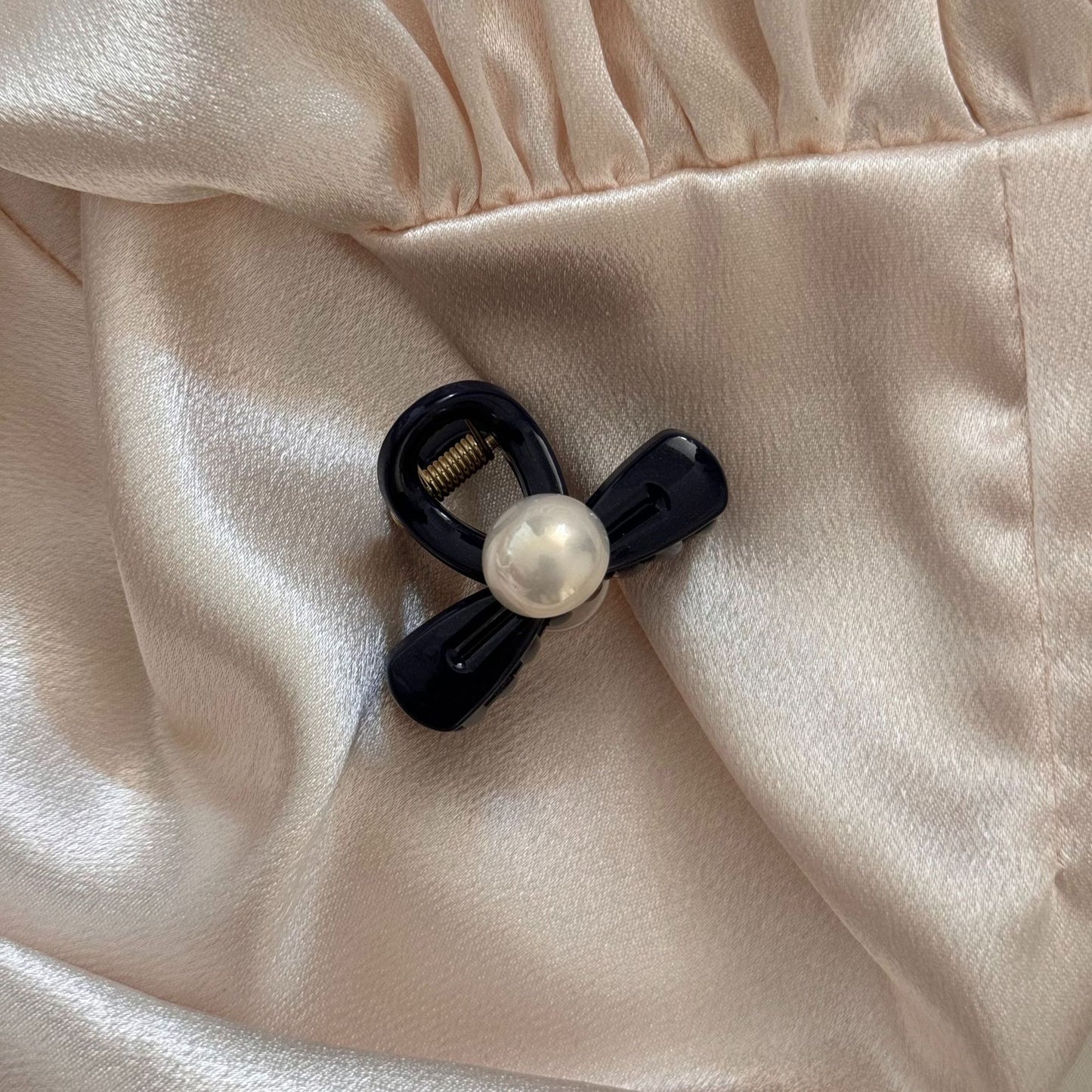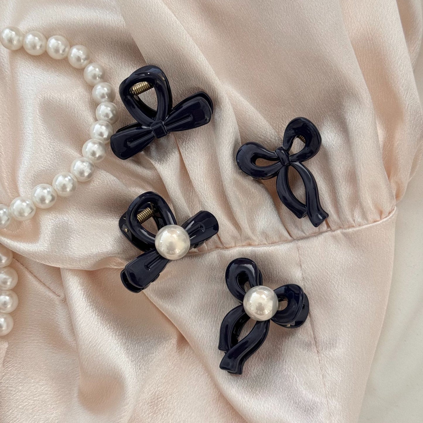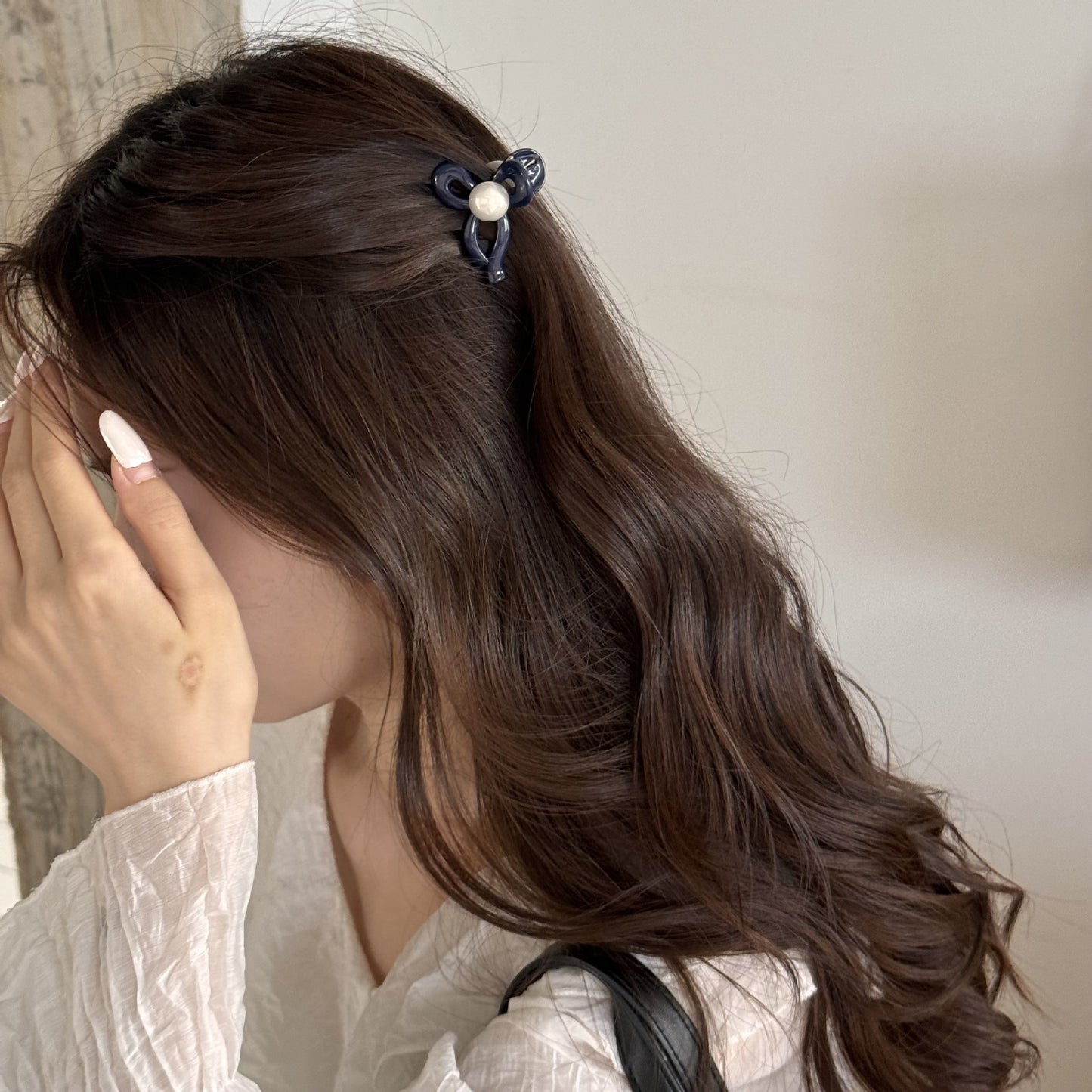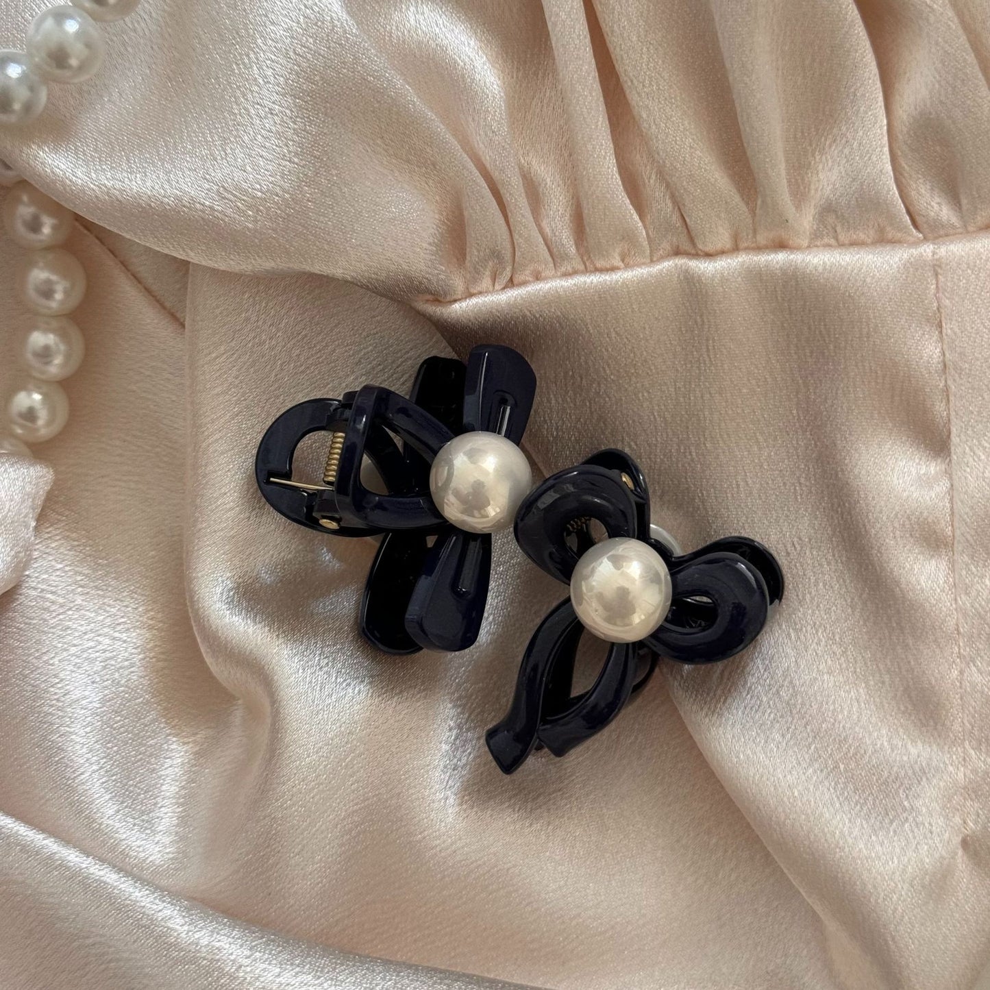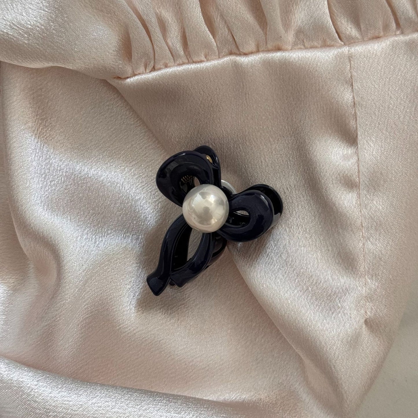 ネイビーブルーの光沢感あるリボンフォルムに、中央の大きめパールが上品さを際立たせるグラブクリップ。