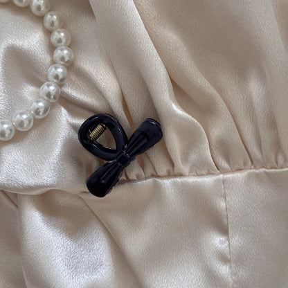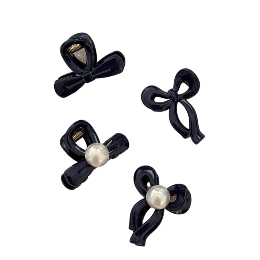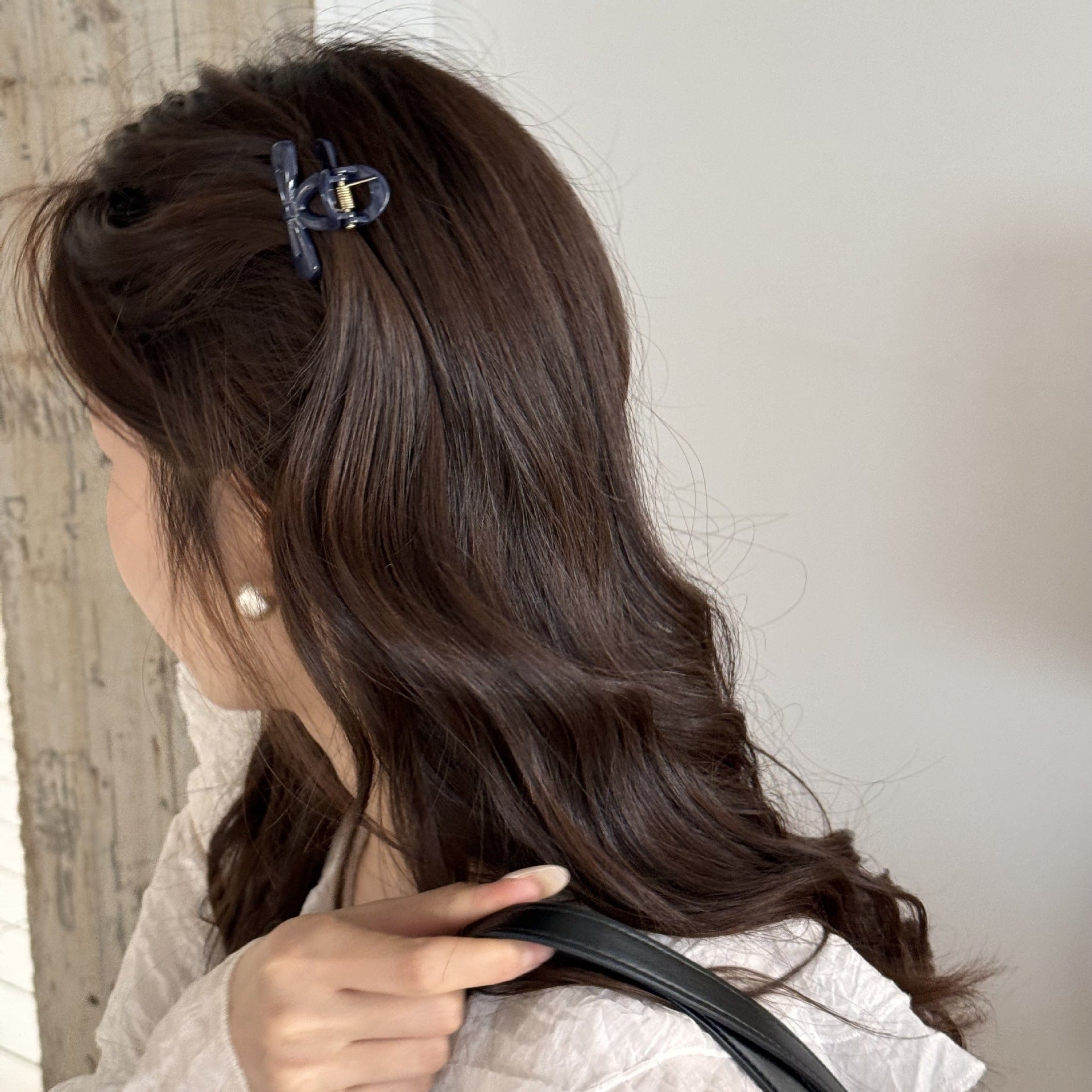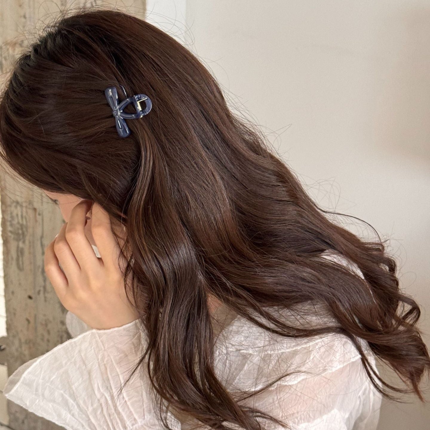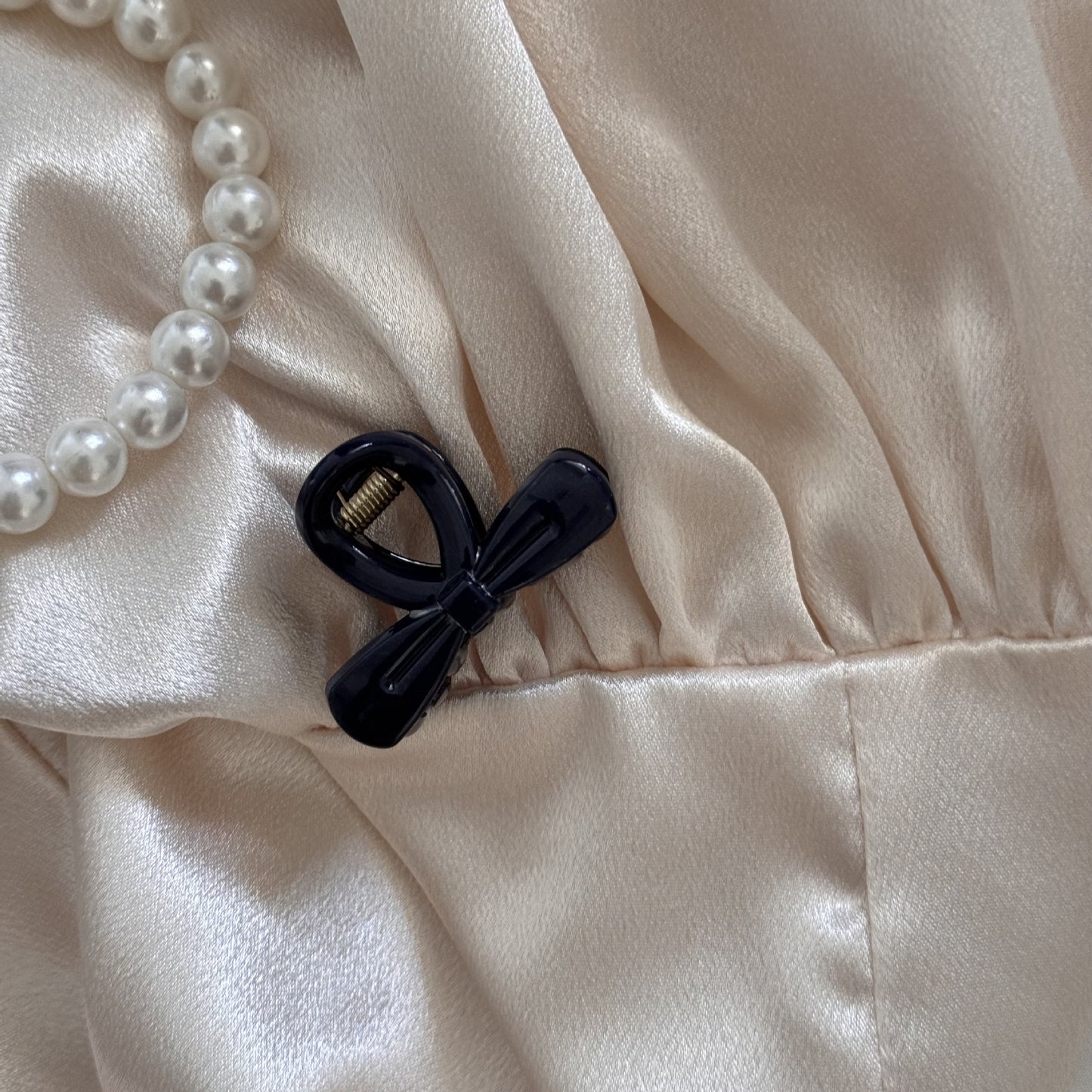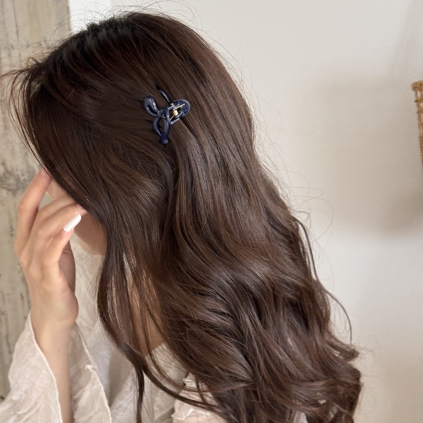ネイビーブルーの光沢感あるリボンフォルムに、中央の大きめパールが上品さを際立たせるグラブクリップ。