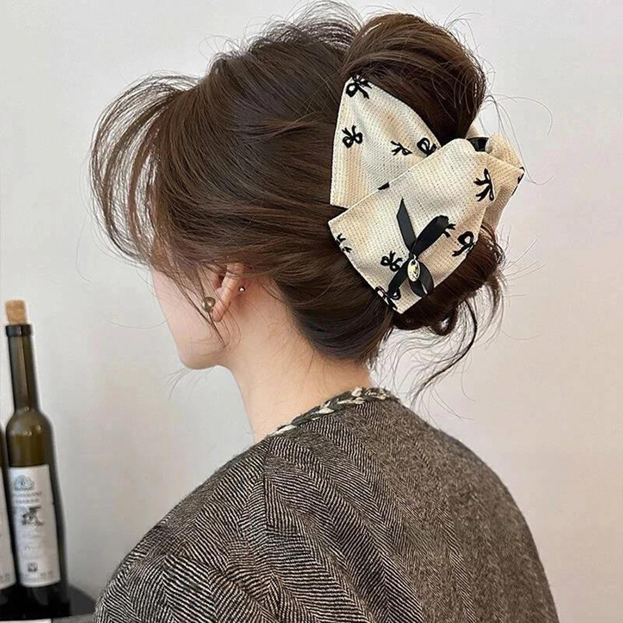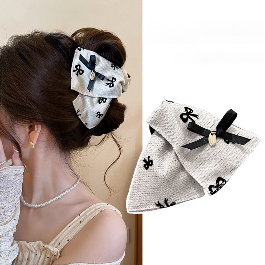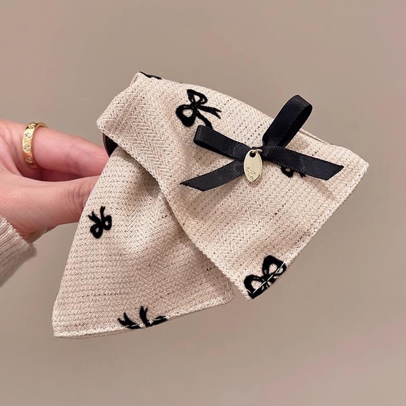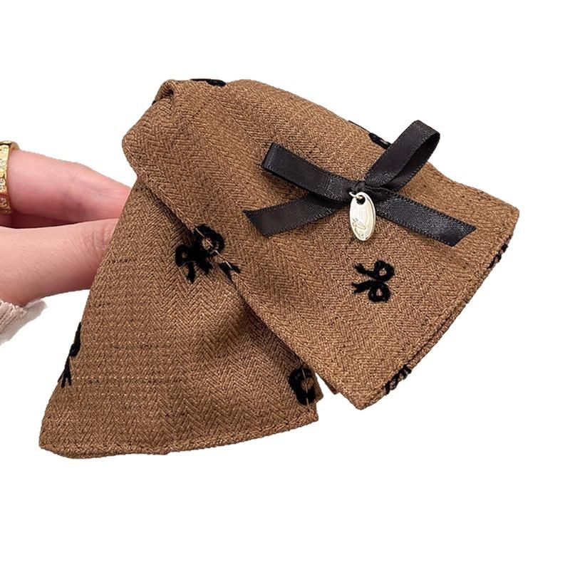 落ち着いたブラウンカラーの布製クリップに、キュートなブラックリボンでアクセントをつけた上品なバンスクリップです。独特のテクスチャーを持つファブリックと、小さなリボンチャームが出会い、上品でありながらも愛らしい雰囲気を演出します。