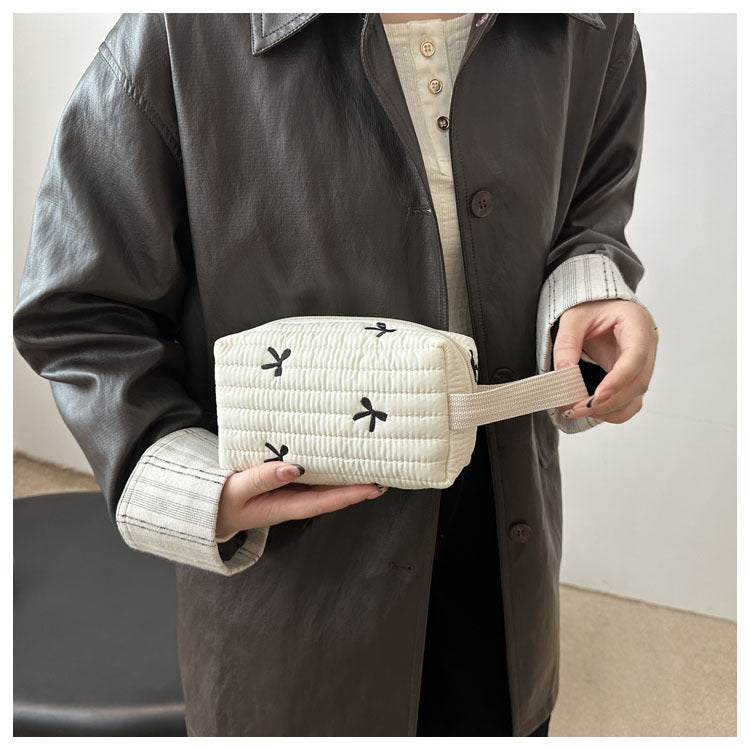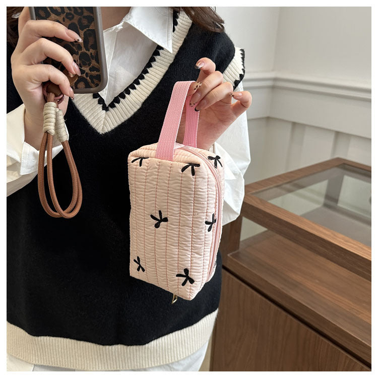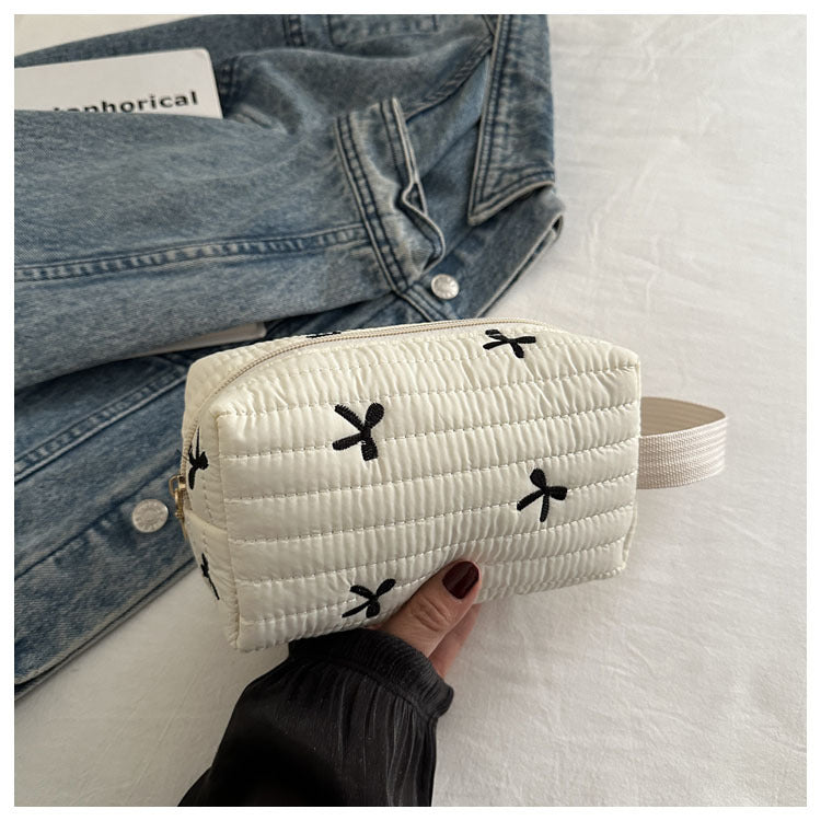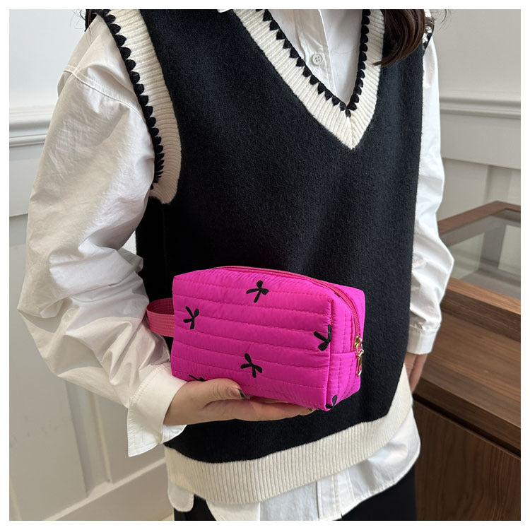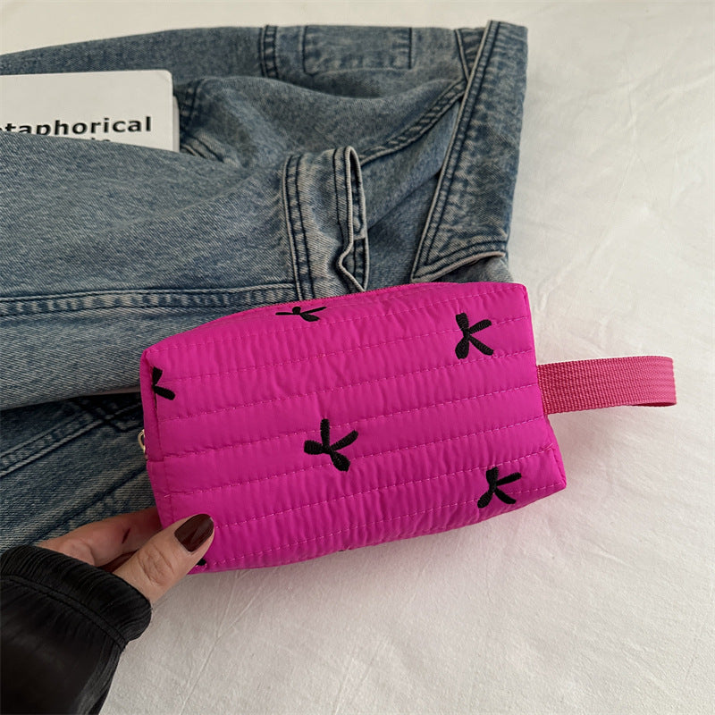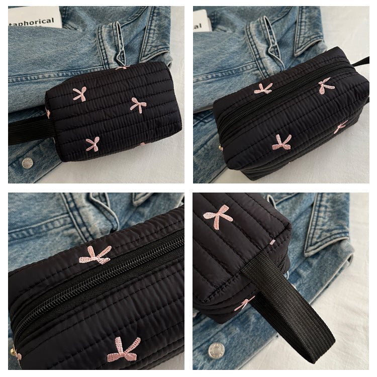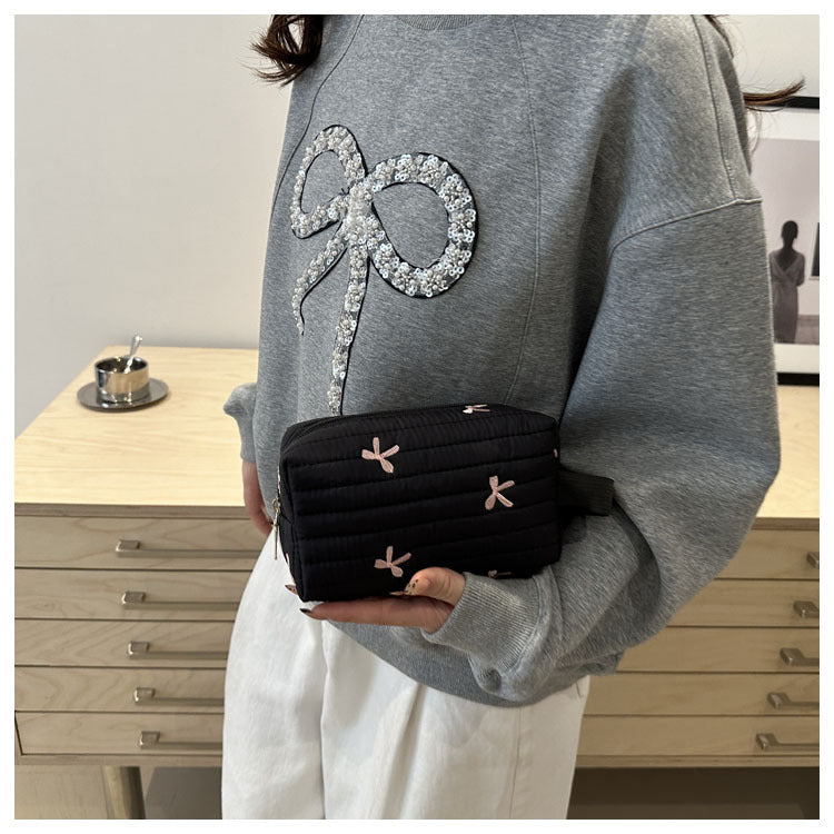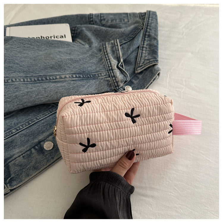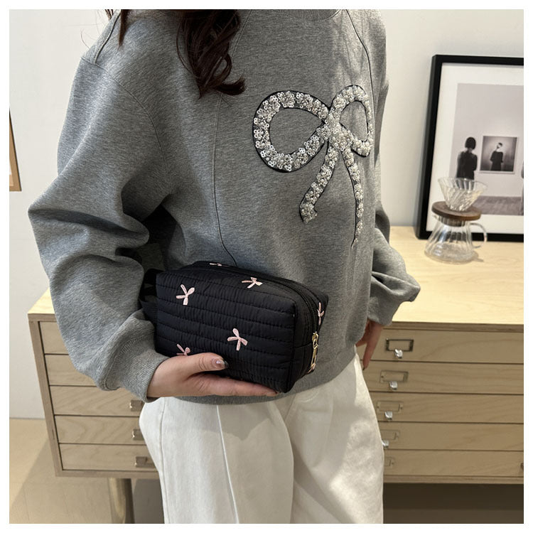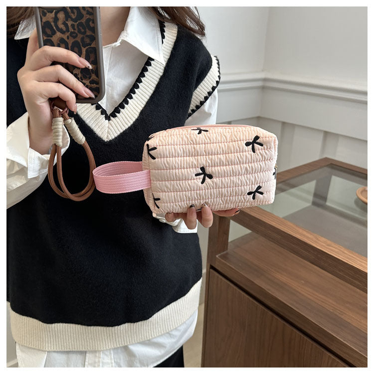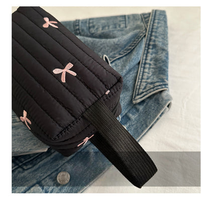 🎀 リボン刺繍がキュートなアクセントになった、しっかりキルティング加工のメイクポーチです。