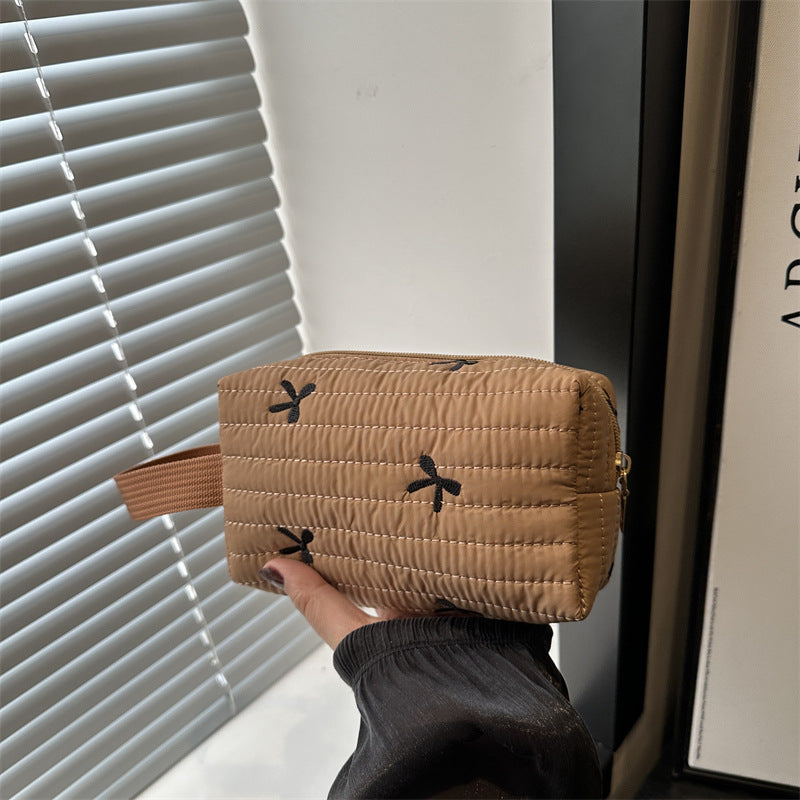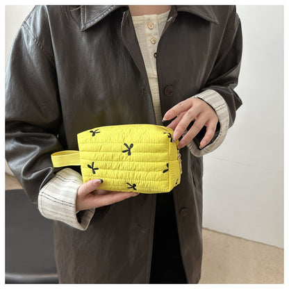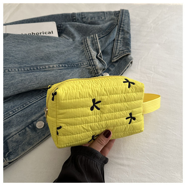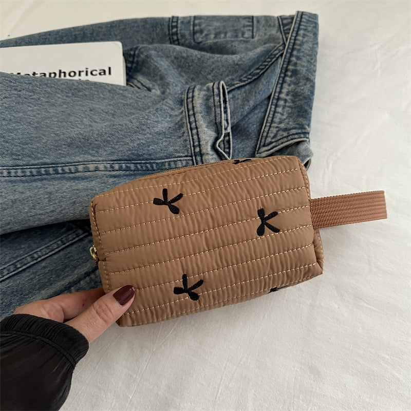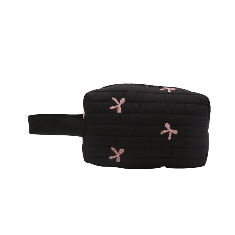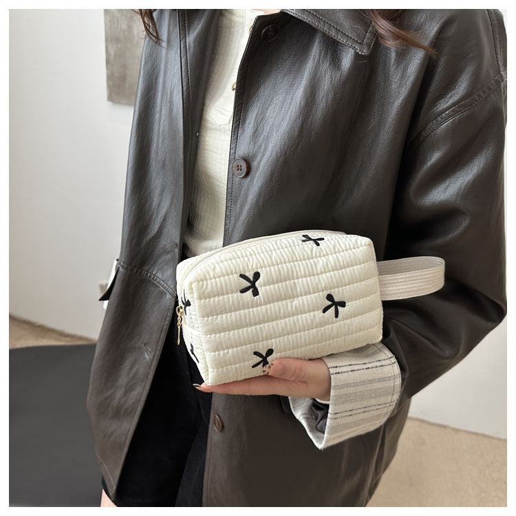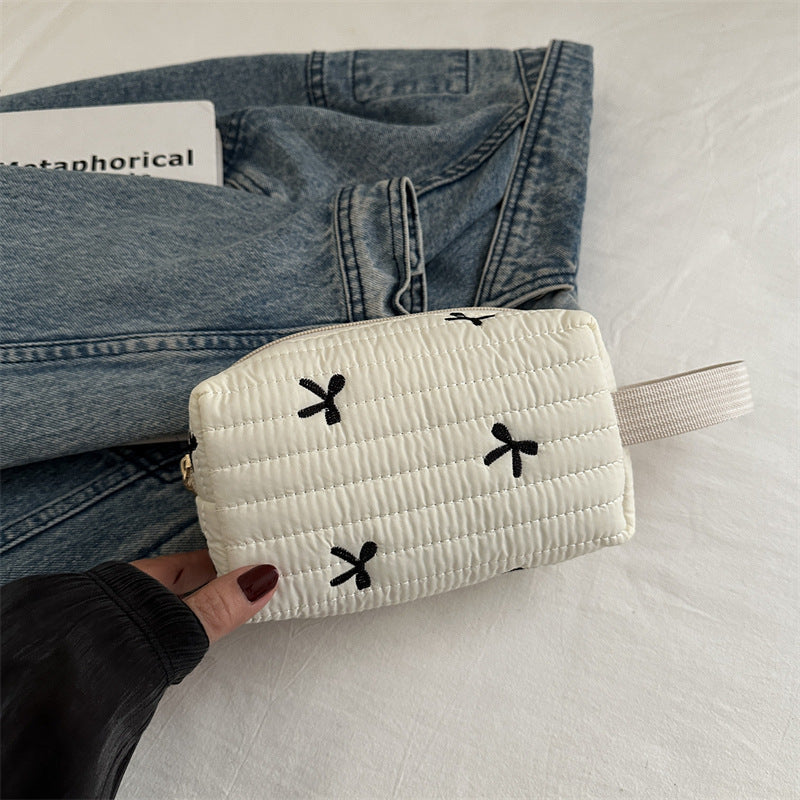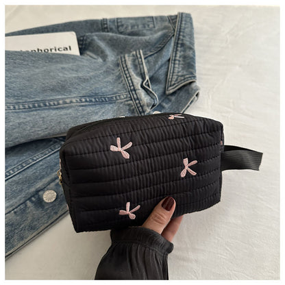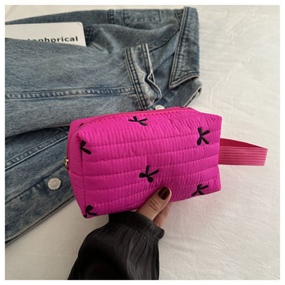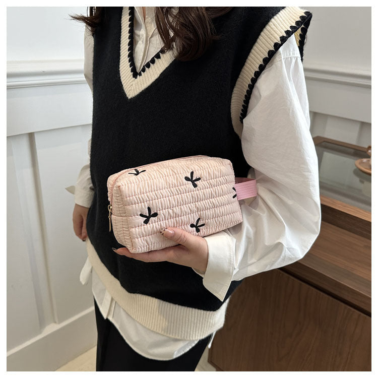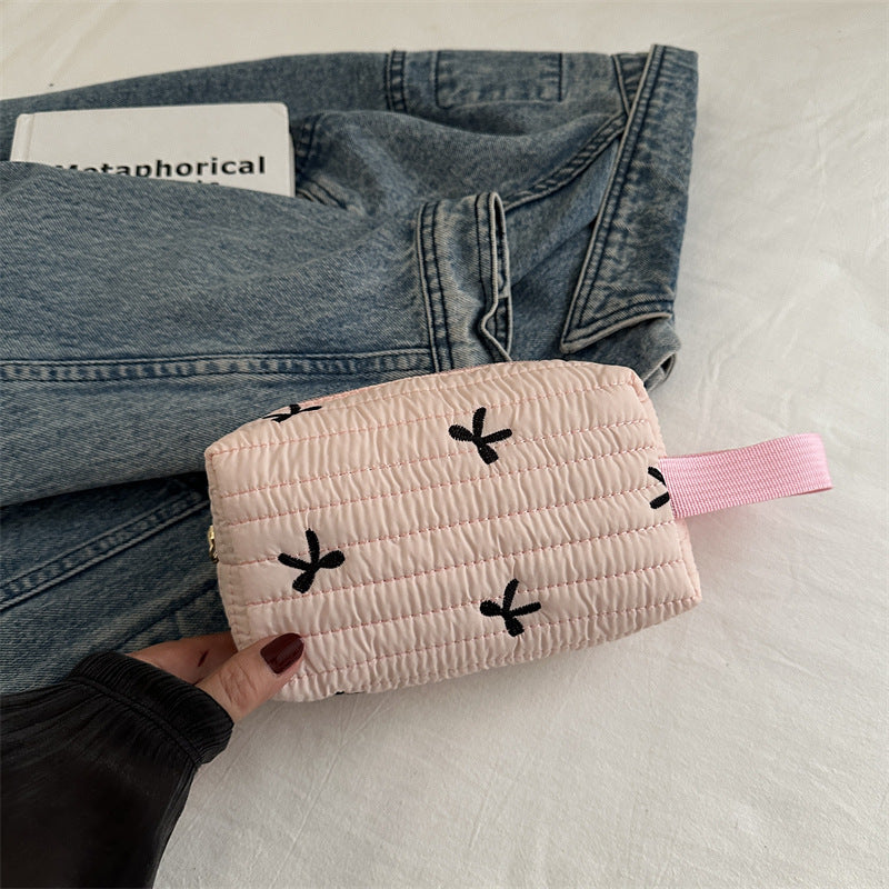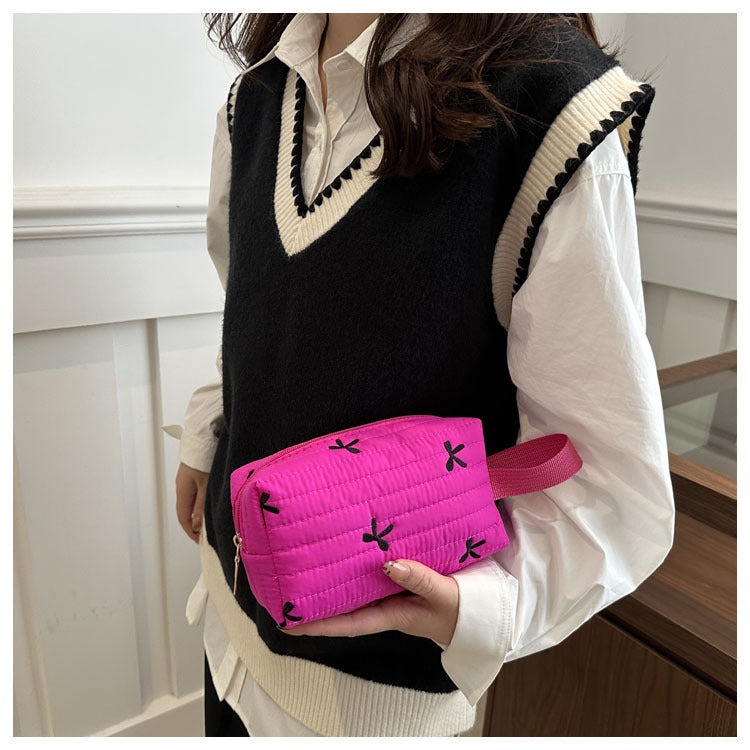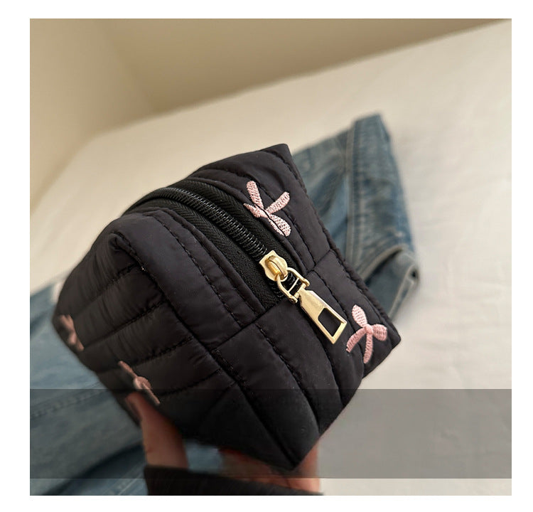 🎀 リボン刺繍がキュートなアクセントになった、しっかりキルティング加工のメイクポーチです。