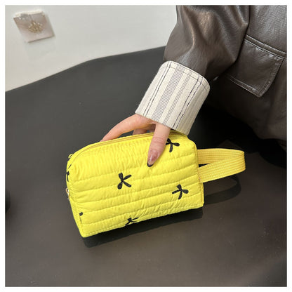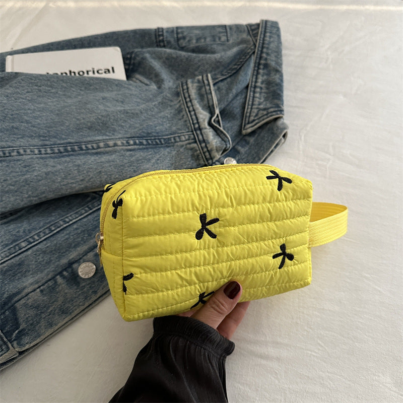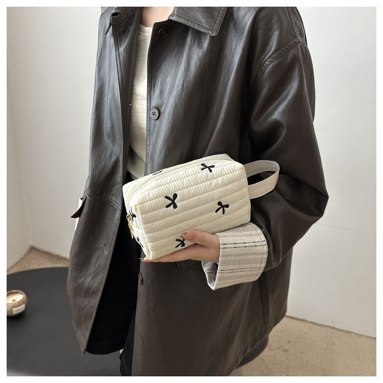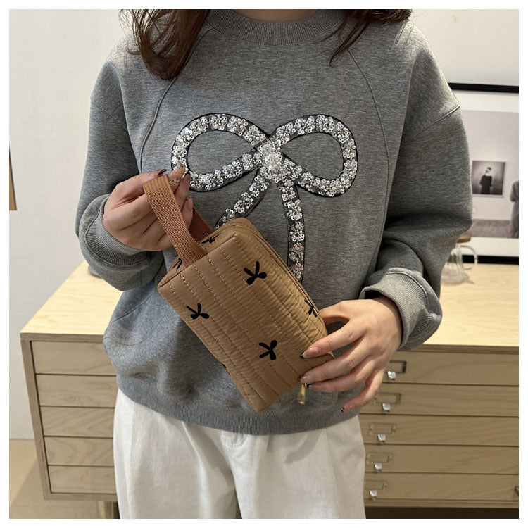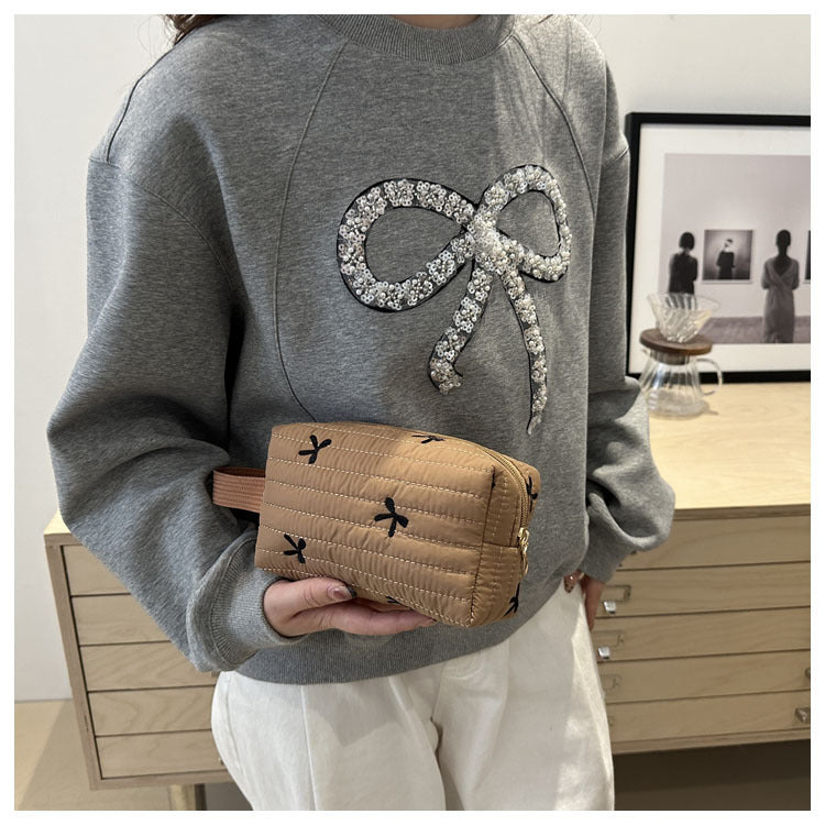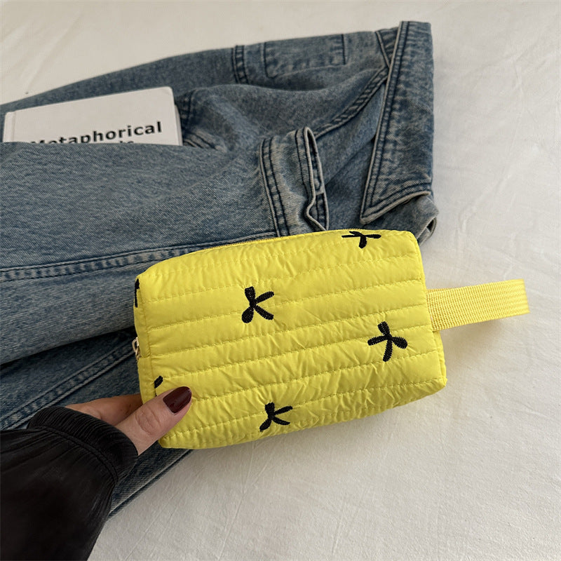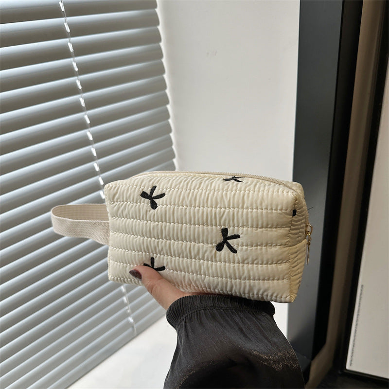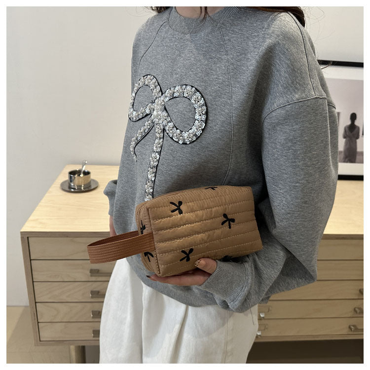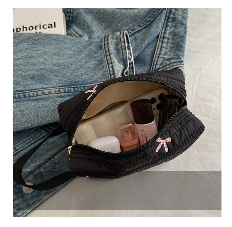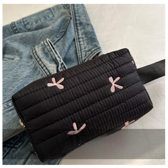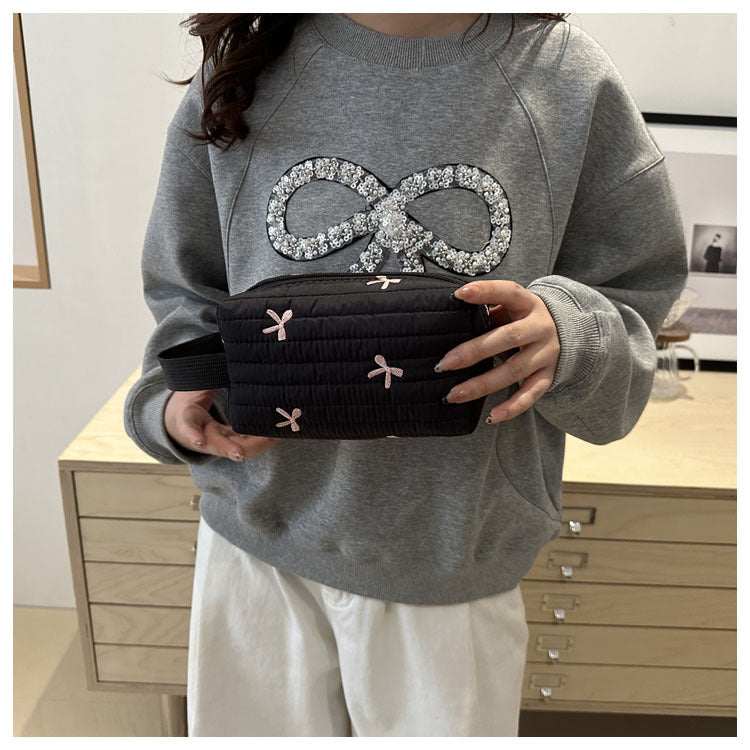 🎀 リボン刺繍がキュートなアクセントになった、しっかりキルティング加工のメイクポーチです。