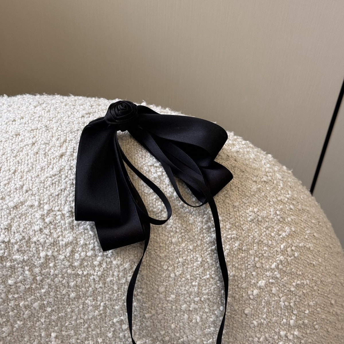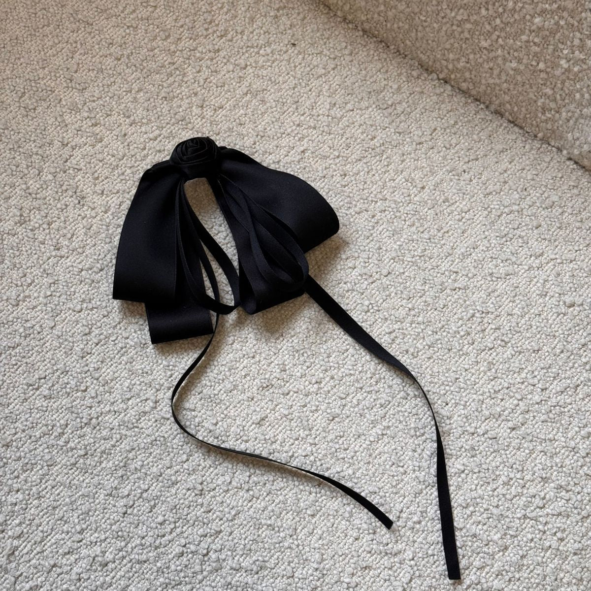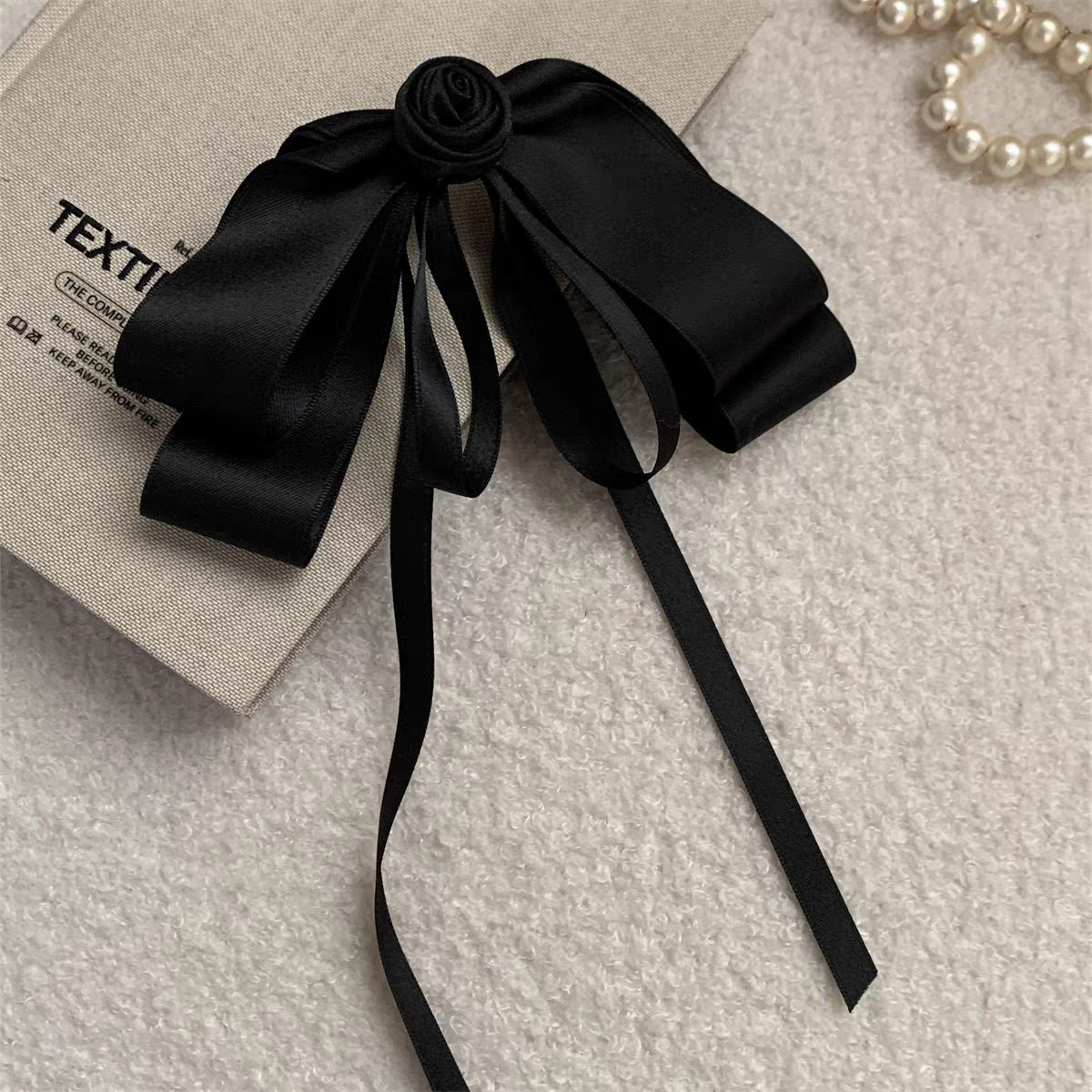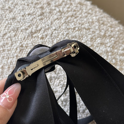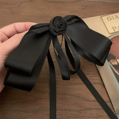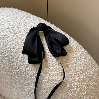 フェミニンで優雅な印象を与える、バラモチーフのブラックロングリボンヘアピン。