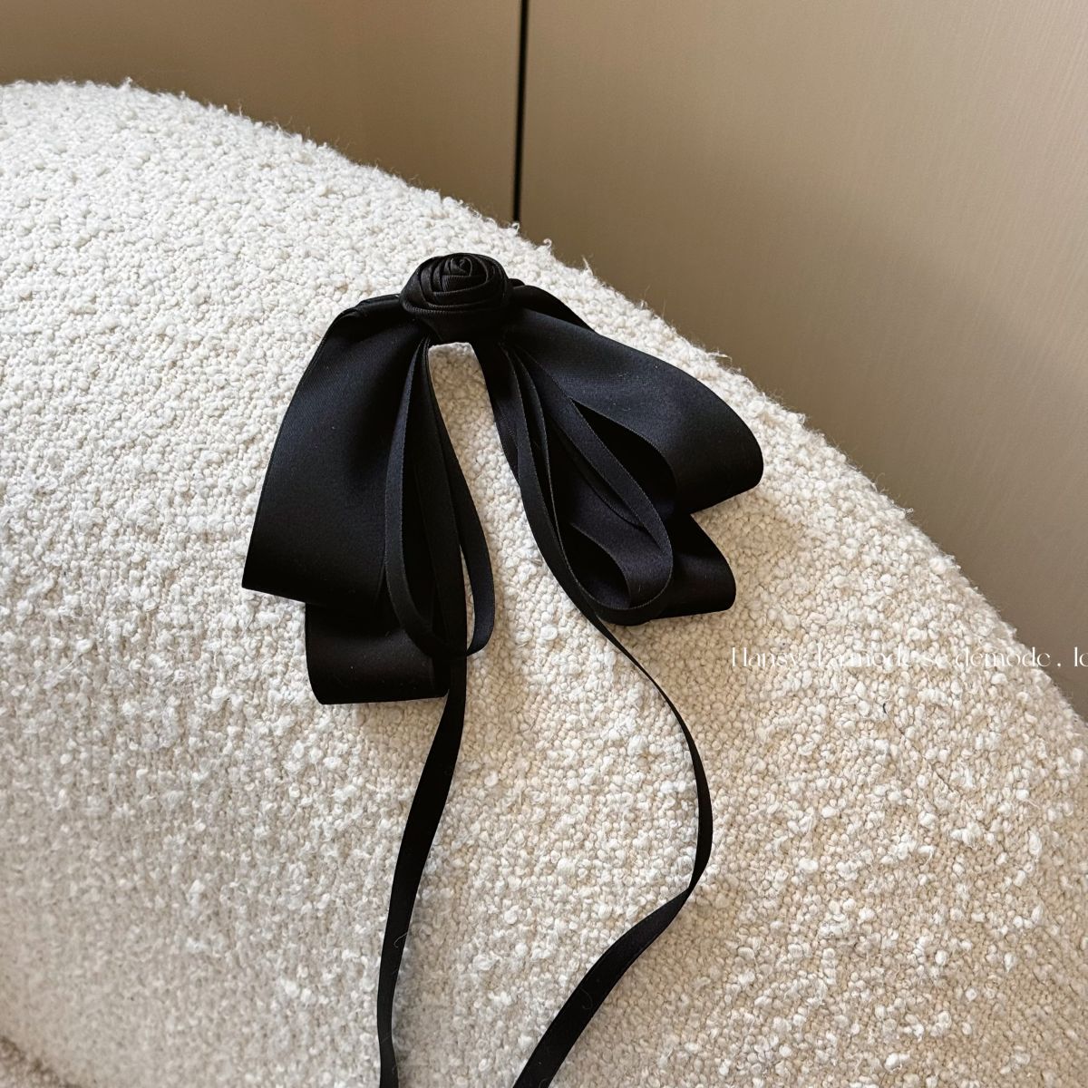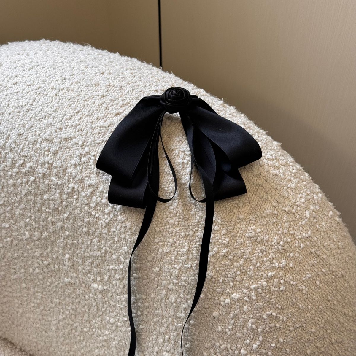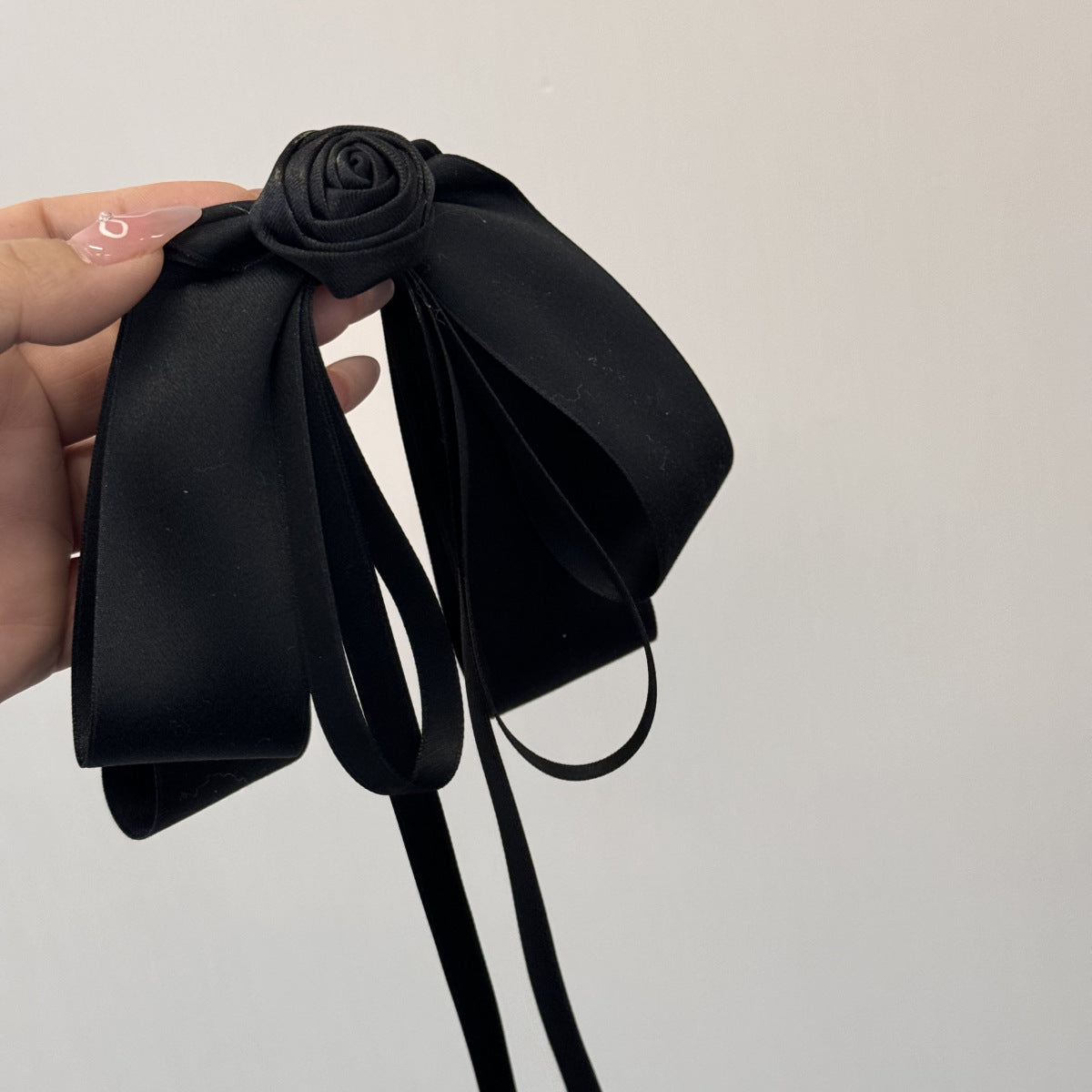 フェミニンで優雅な印象を与える、バラモチーフのブラックロングリボンヘアピン。