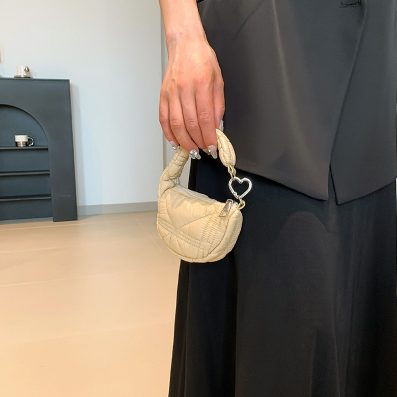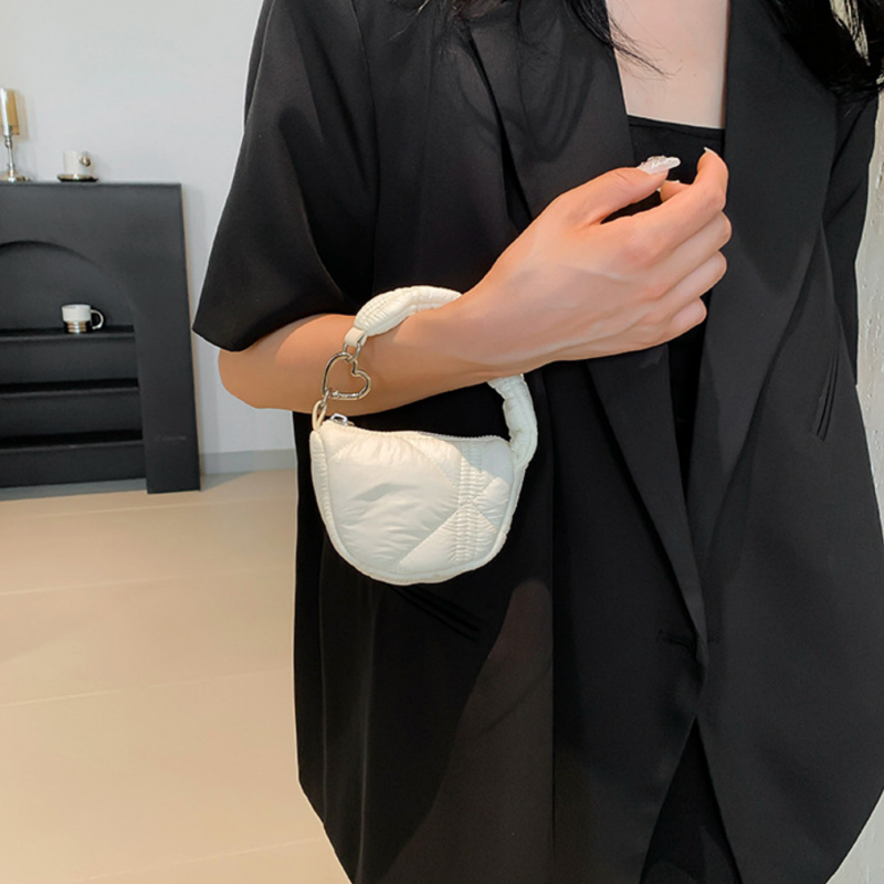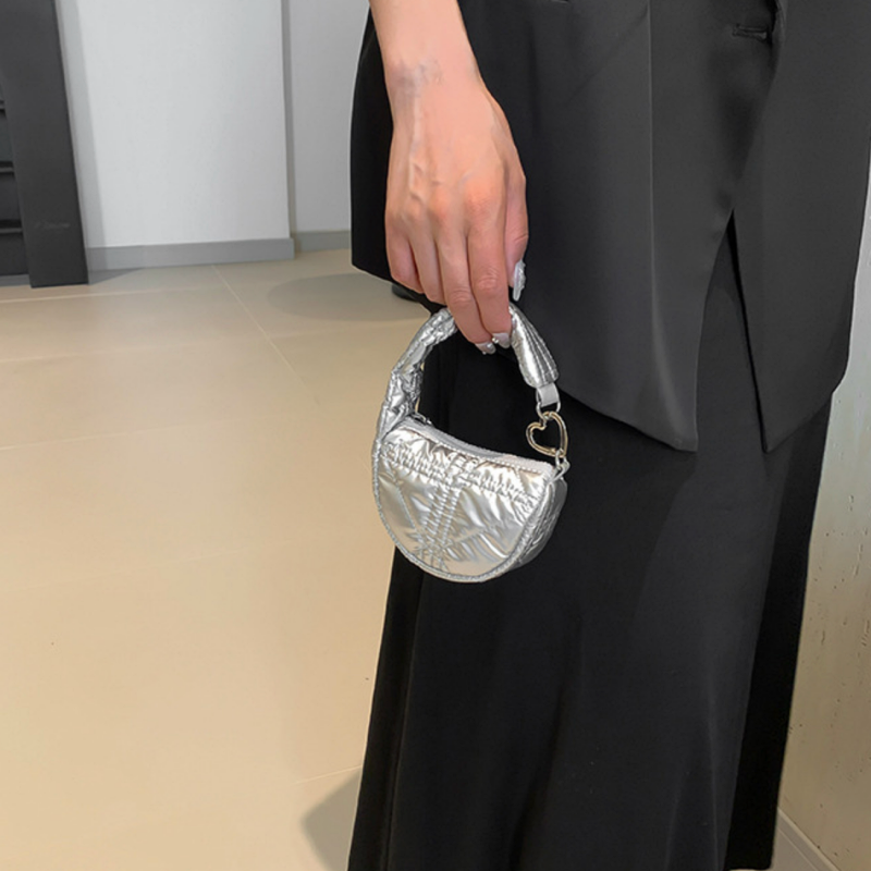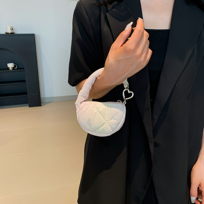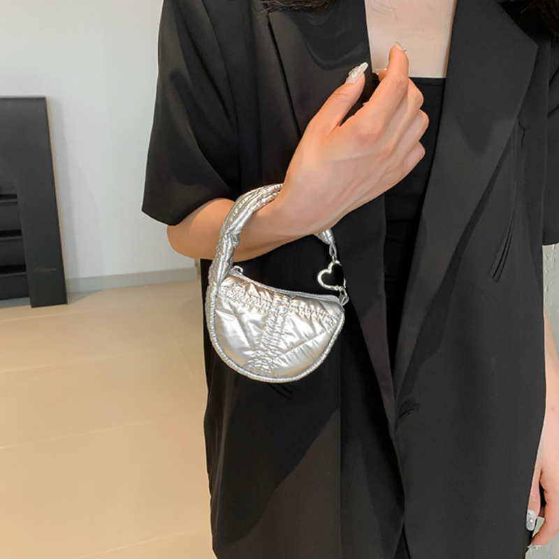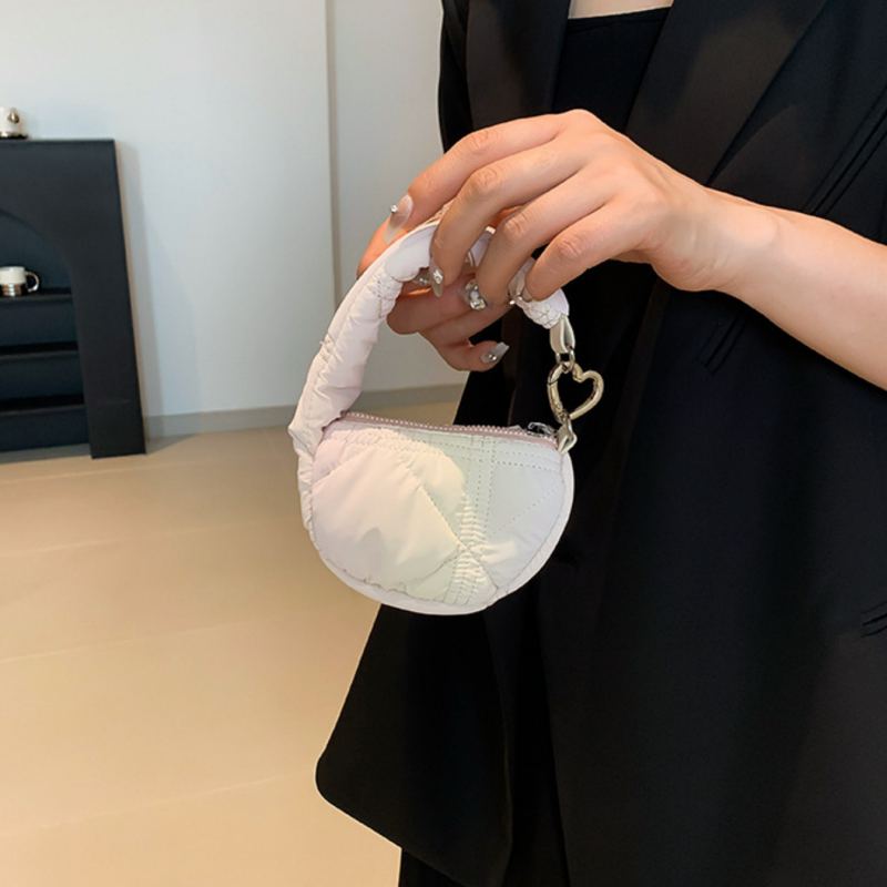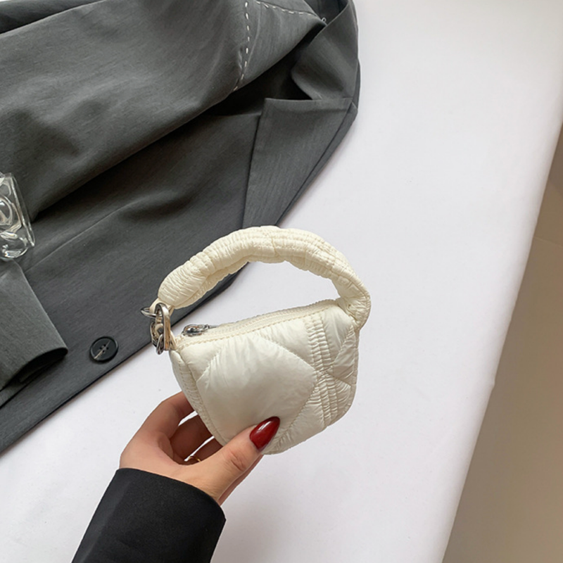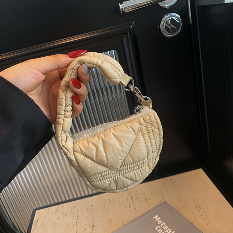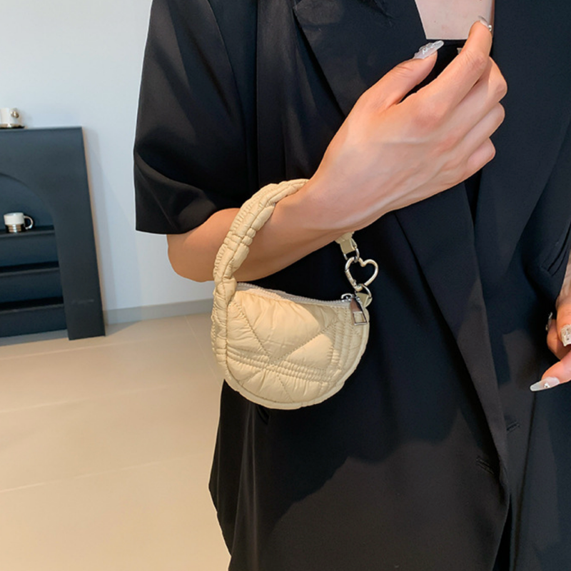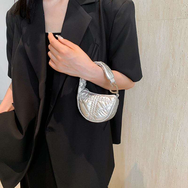 キルティングまたはソフトなプリーツ加工が施された雲形のミニバッグ。