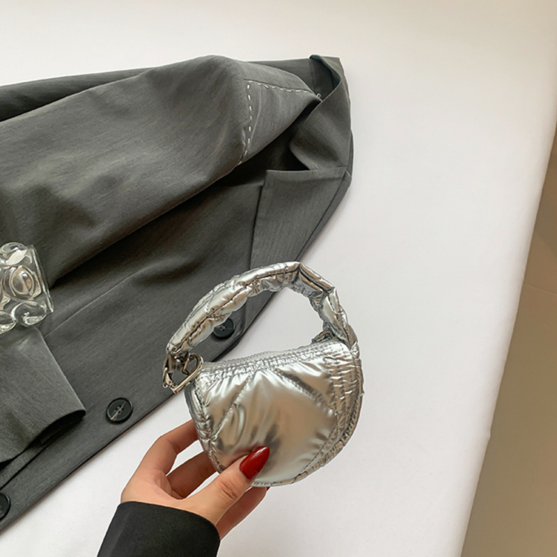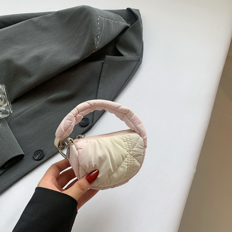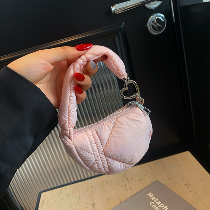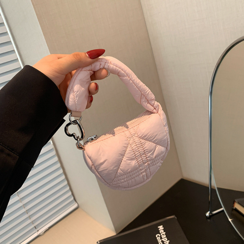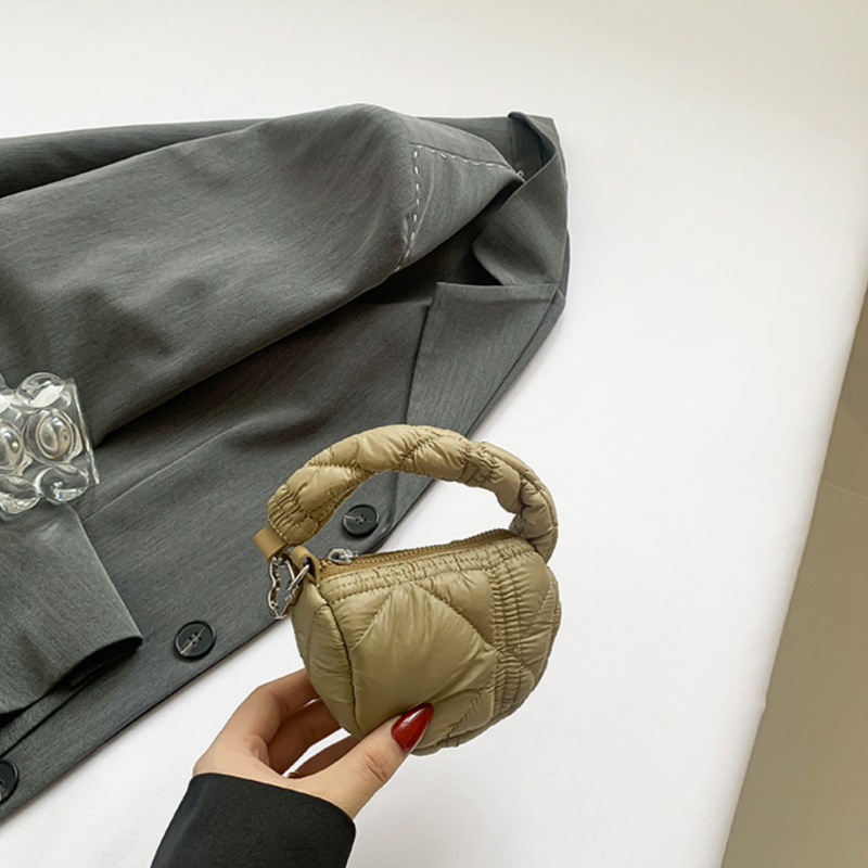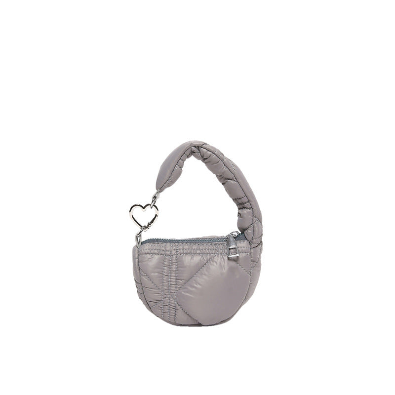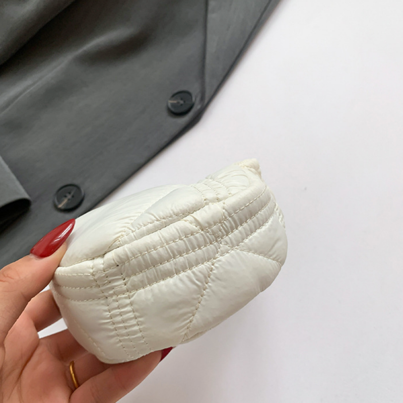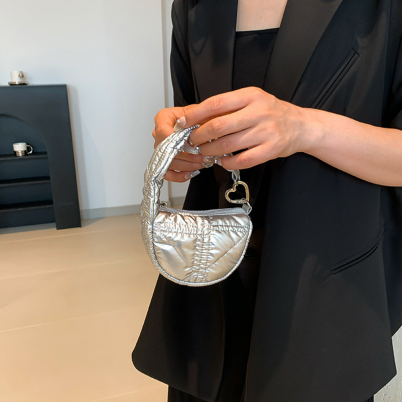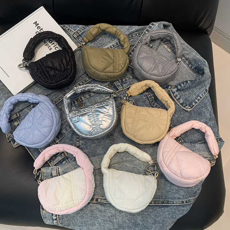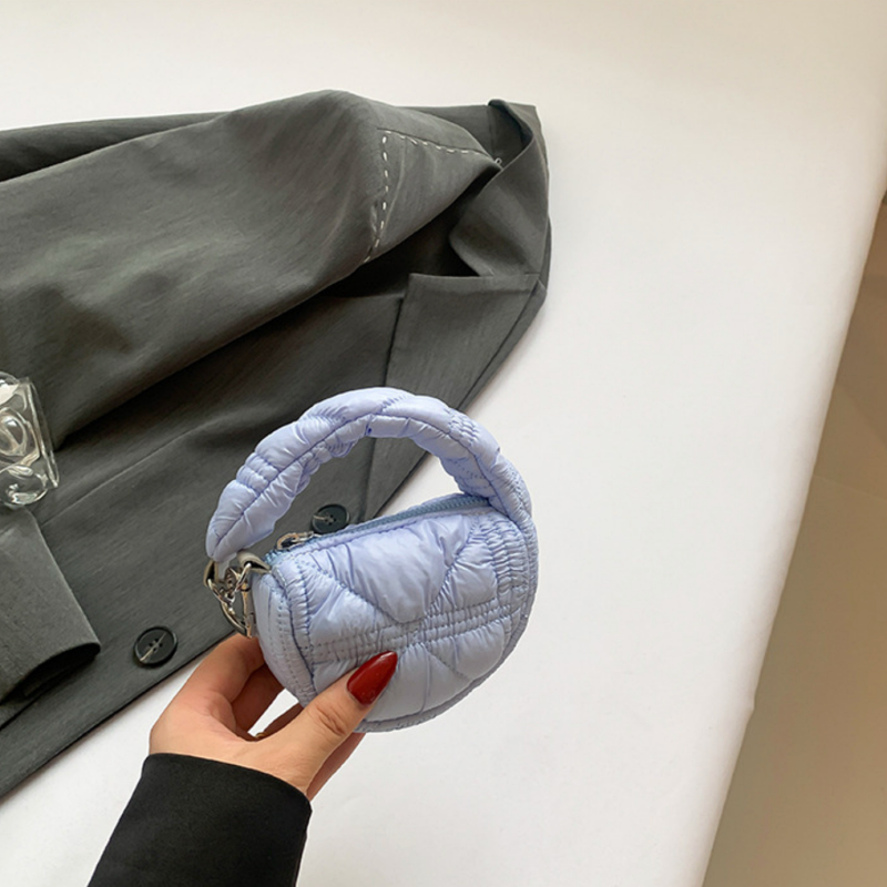 キルティングまたはソフトなプリーツ加工が施された雲形のミニバッグ。