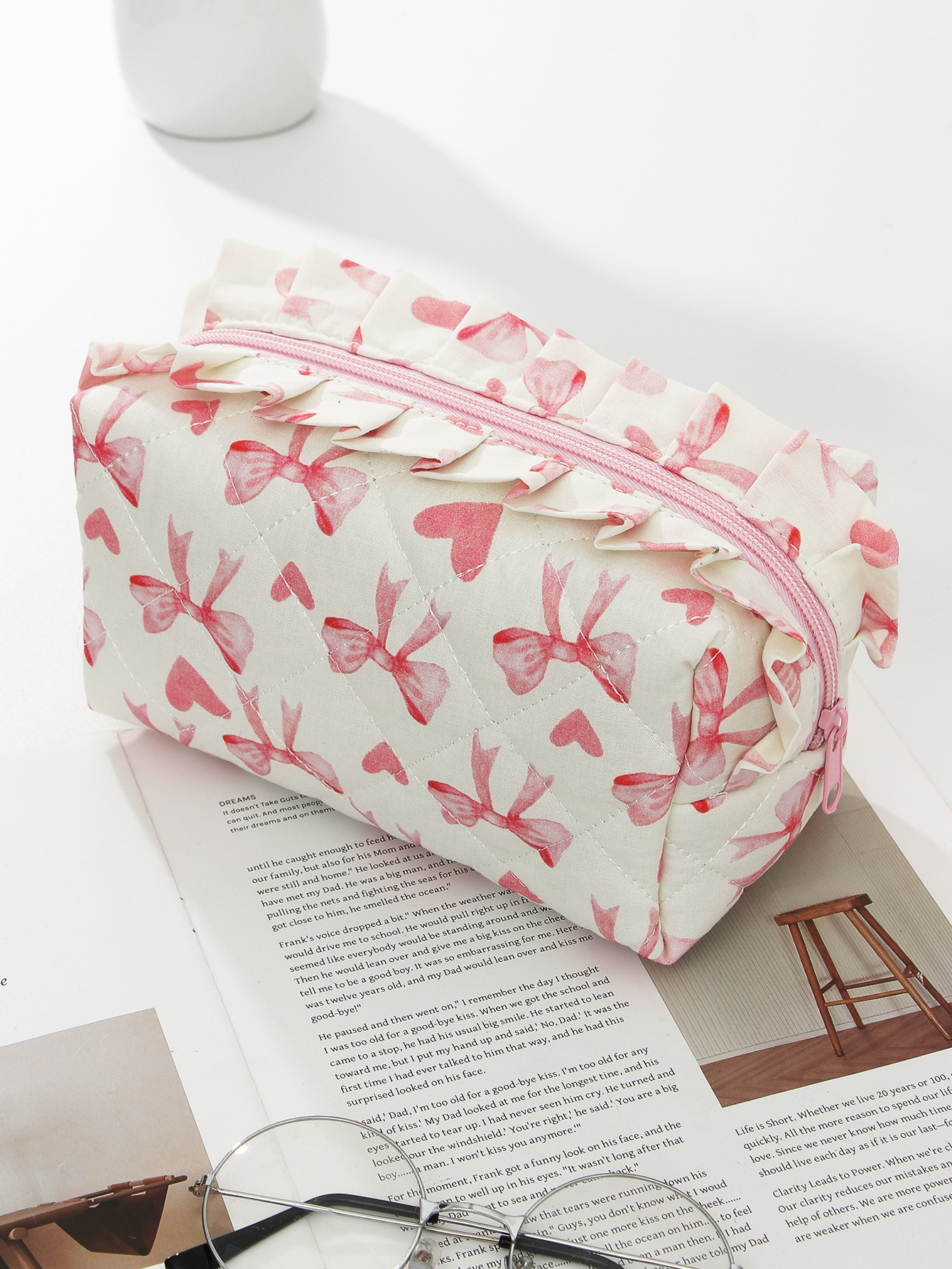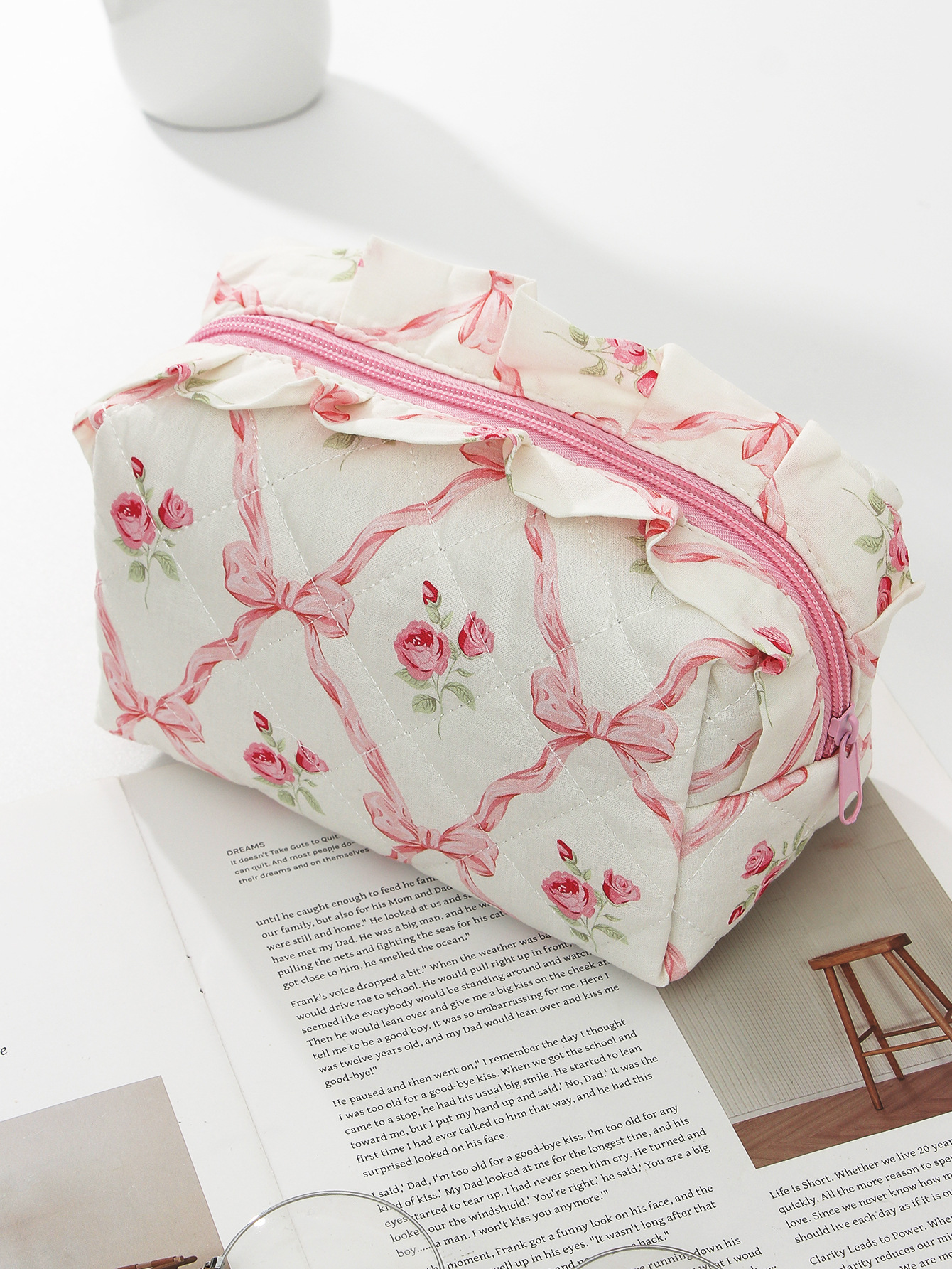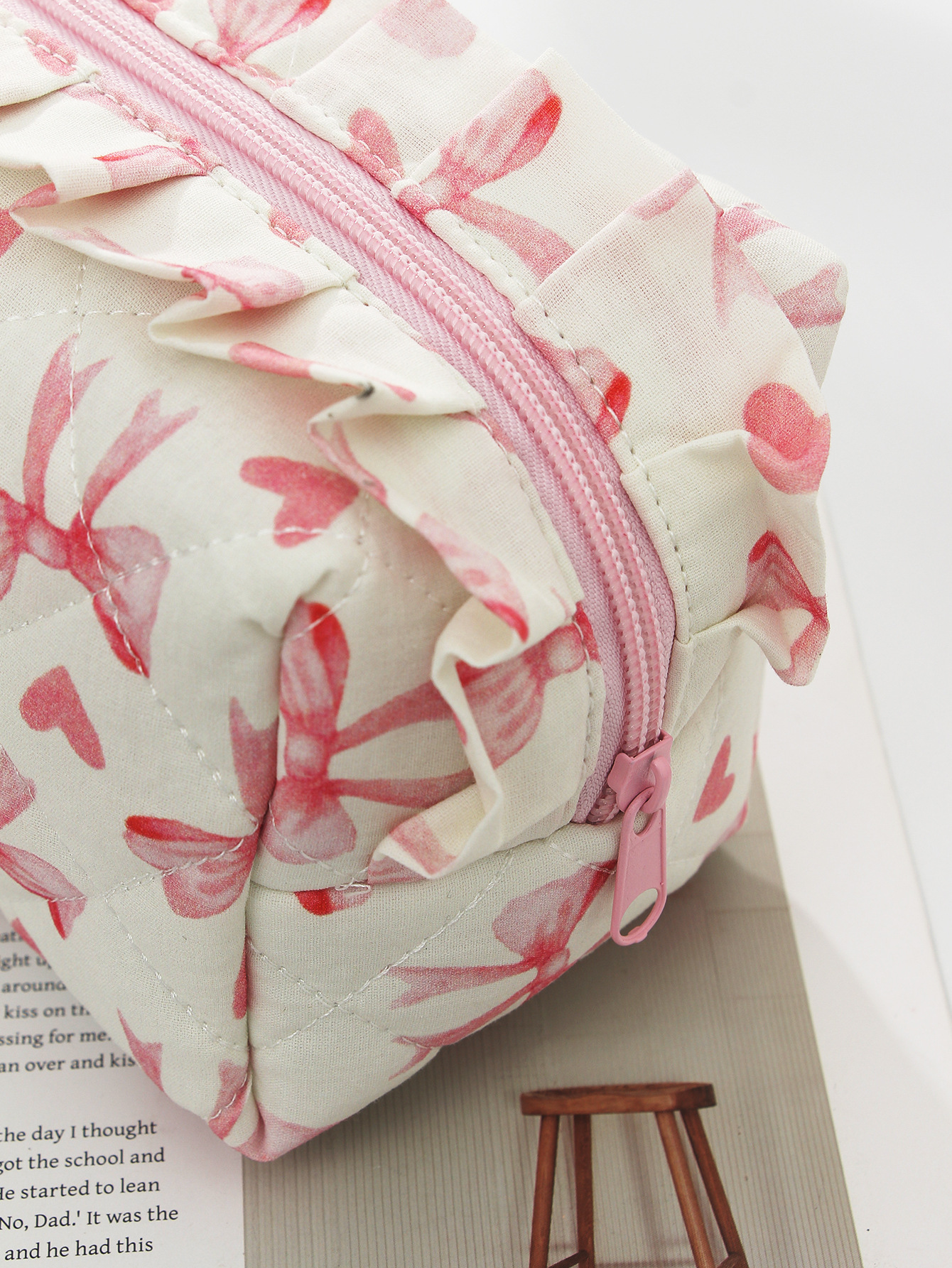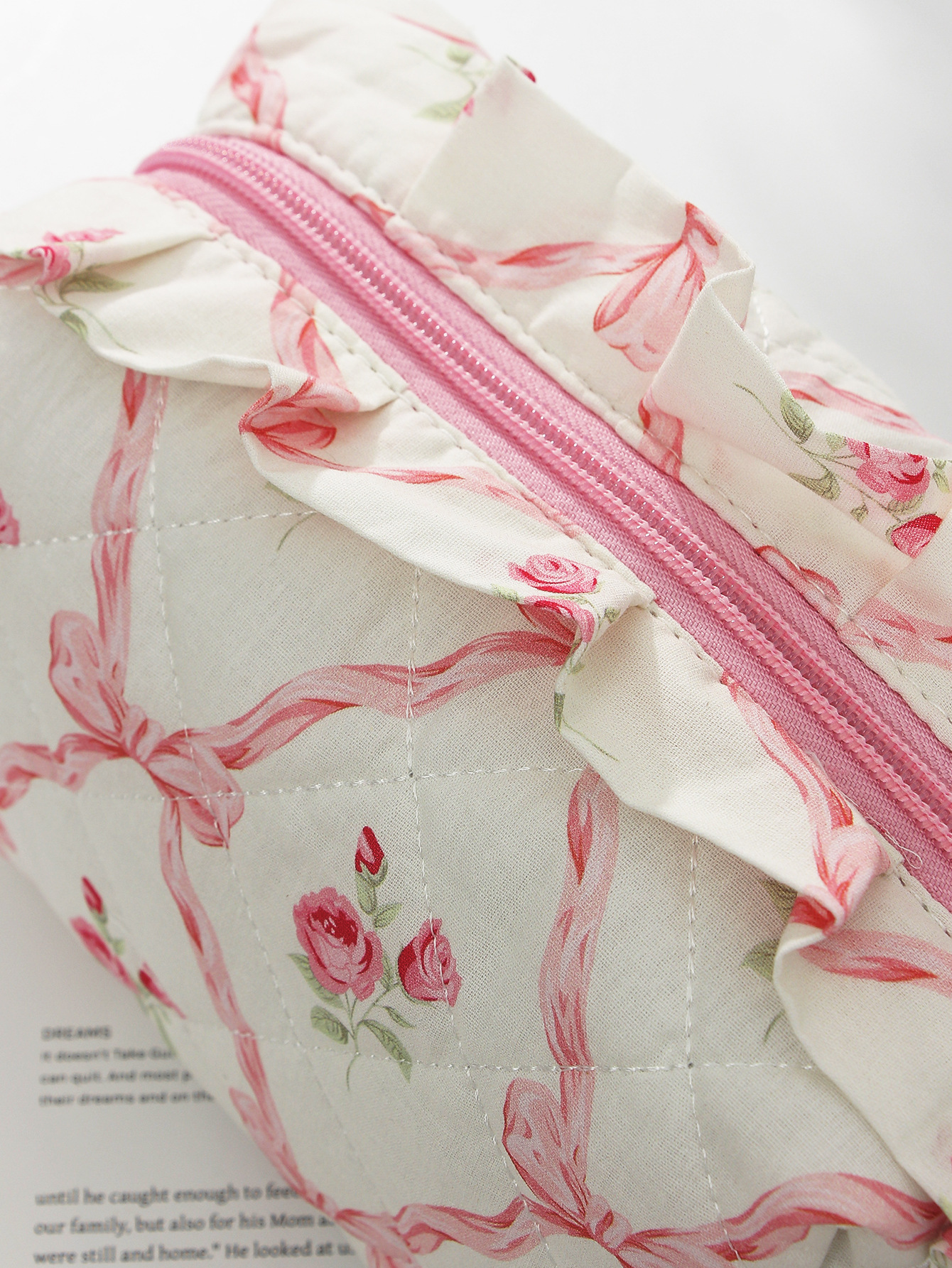 フリルデザインと可愛いリボン柄が特徴の韓国風キルティング化粧ポーチ。