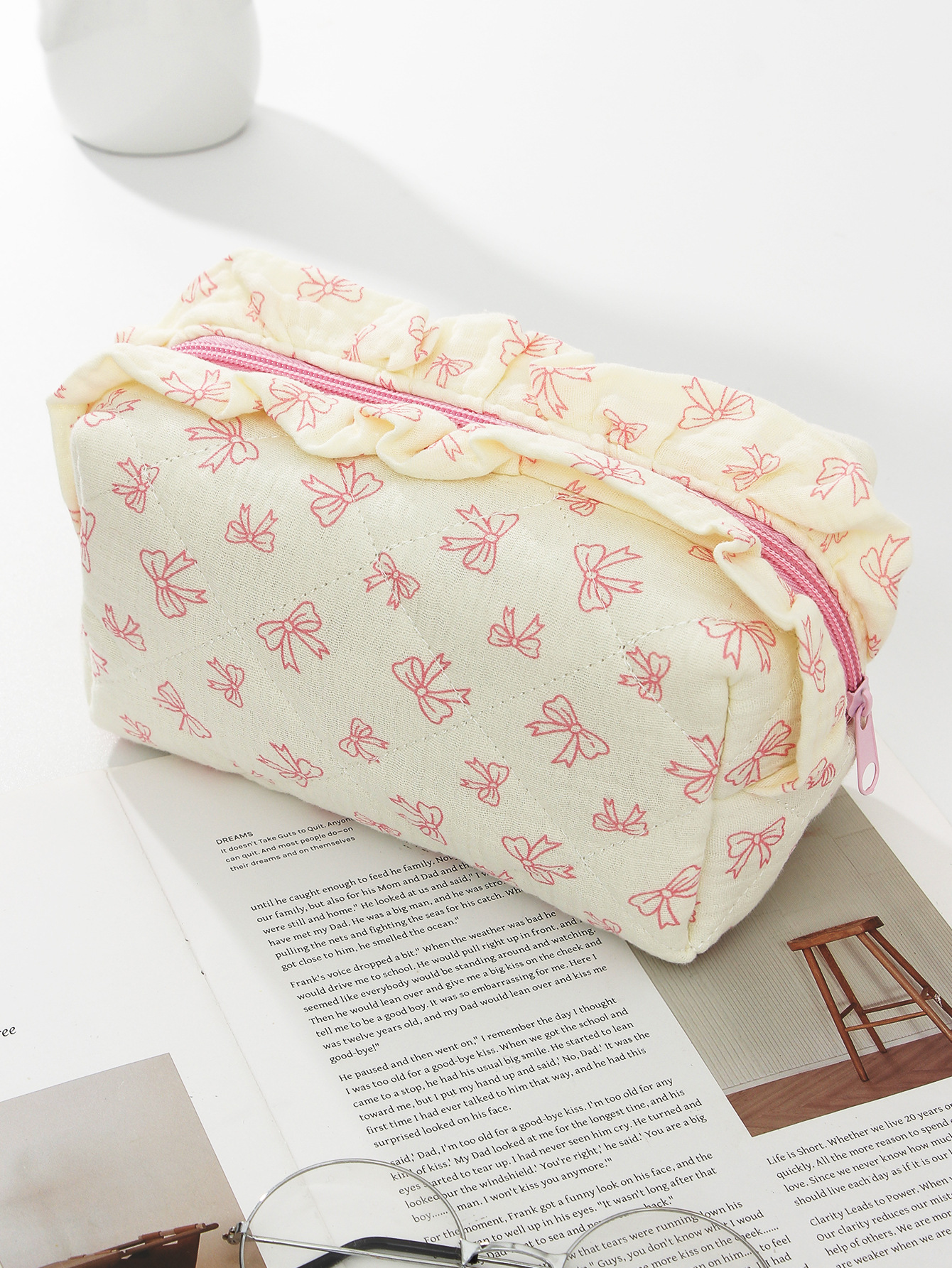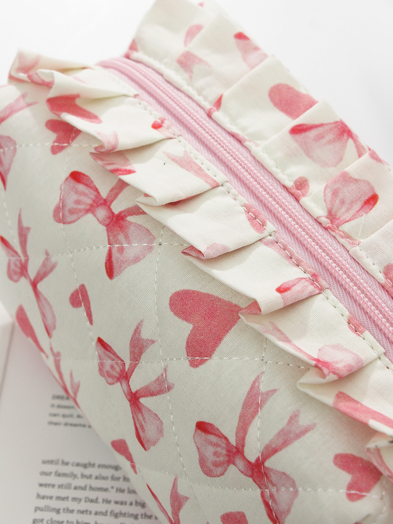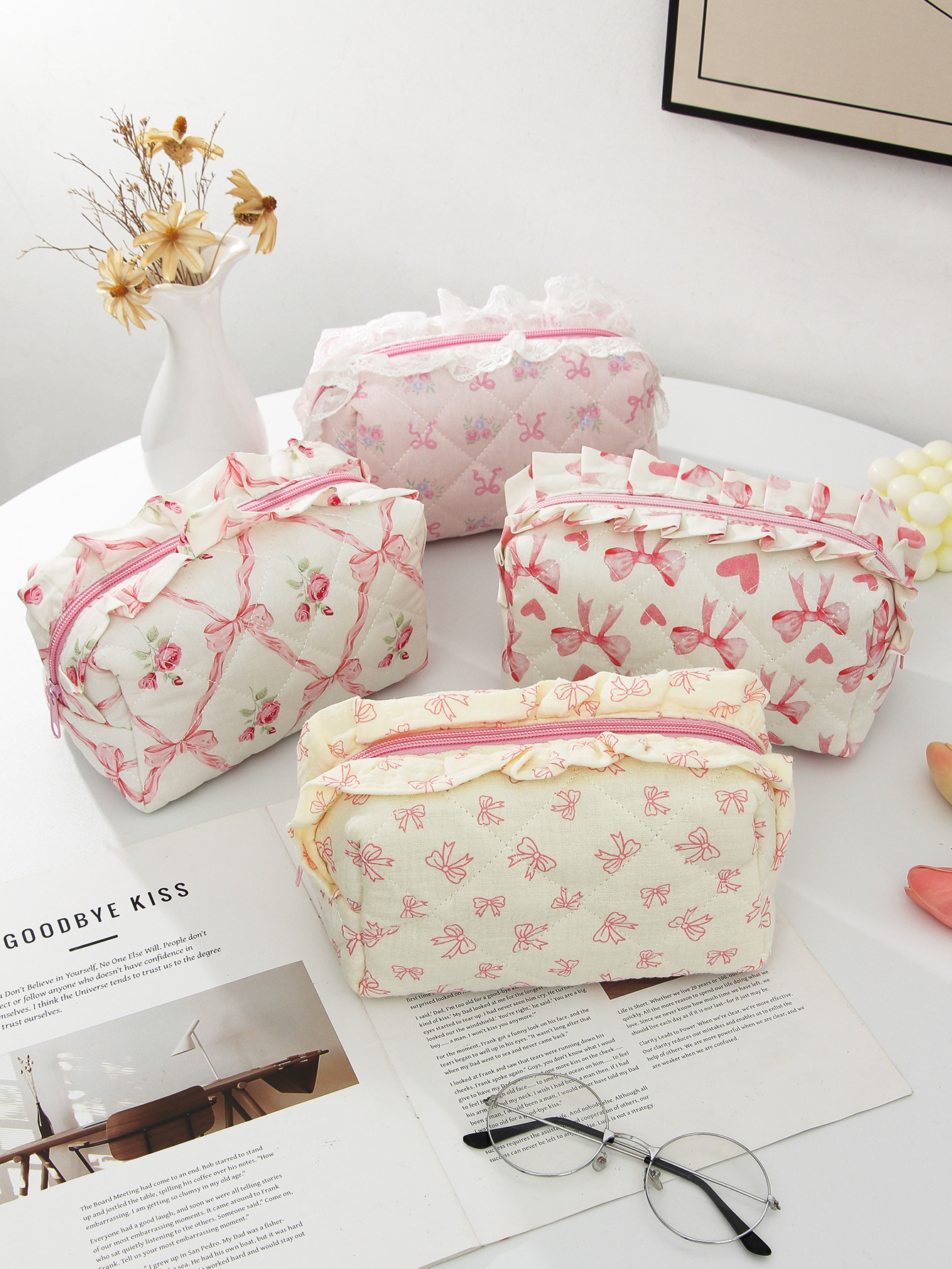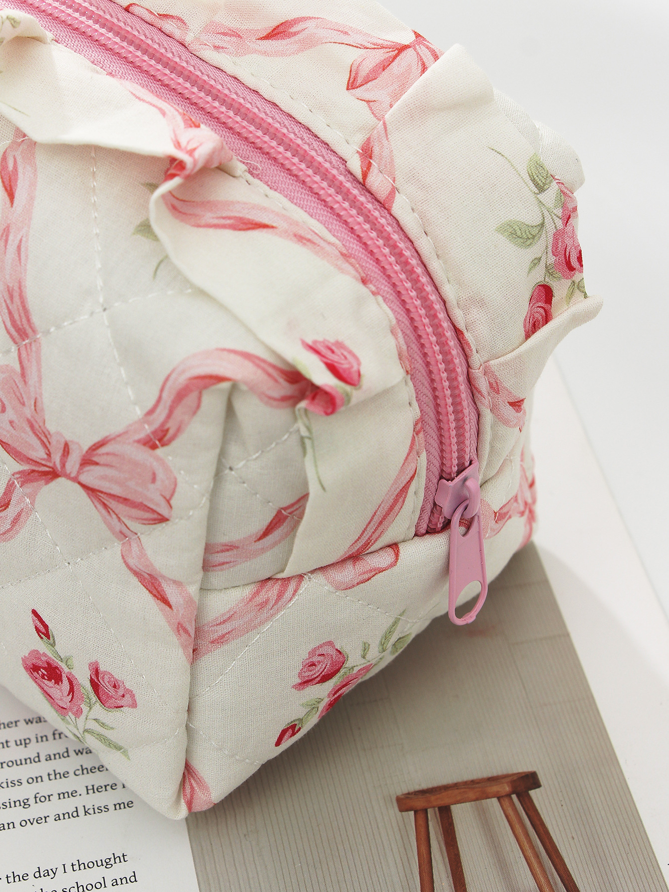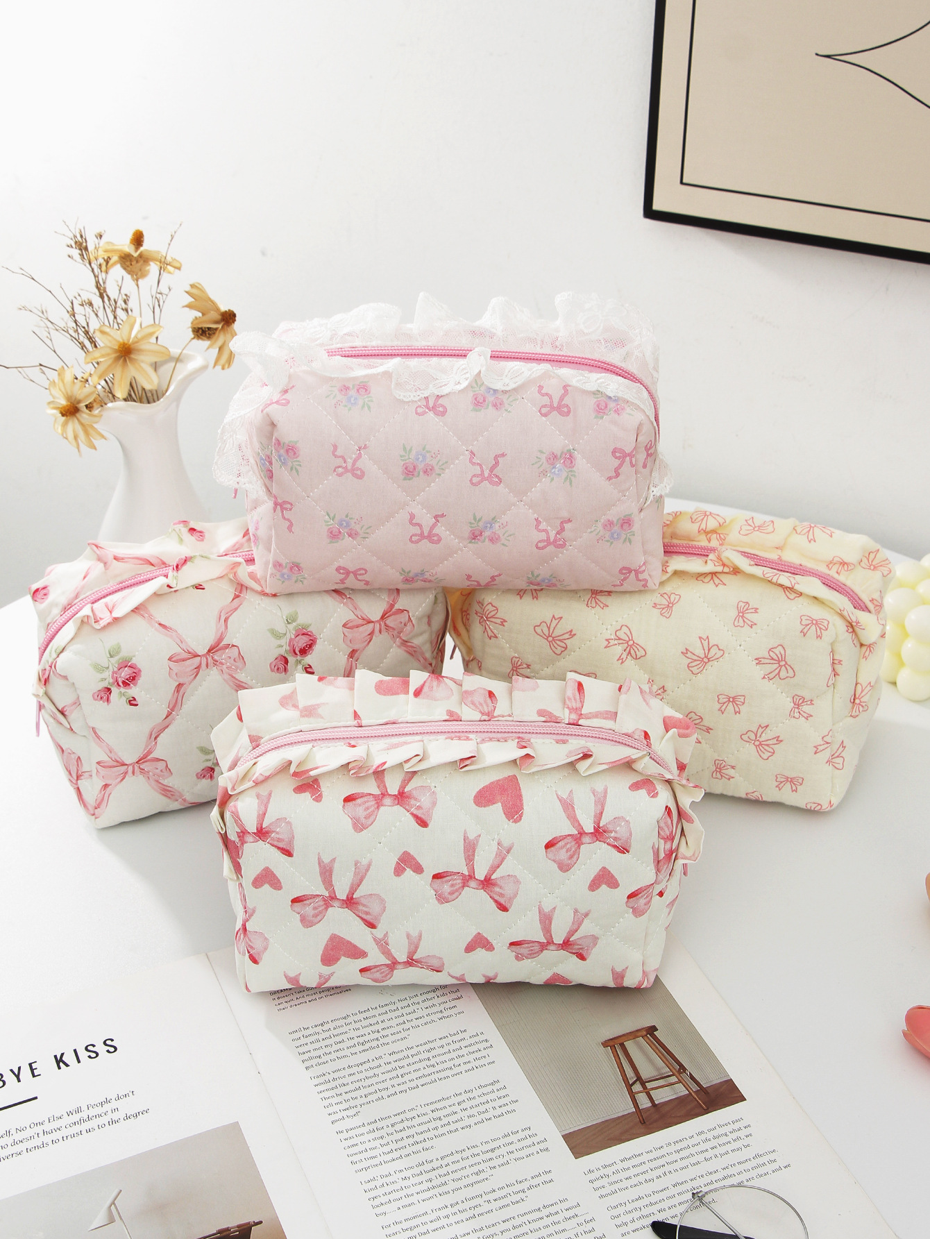 フリルデザインと可愛いリボン柄が特徴の韓国風キルティング化粧ポーチ。