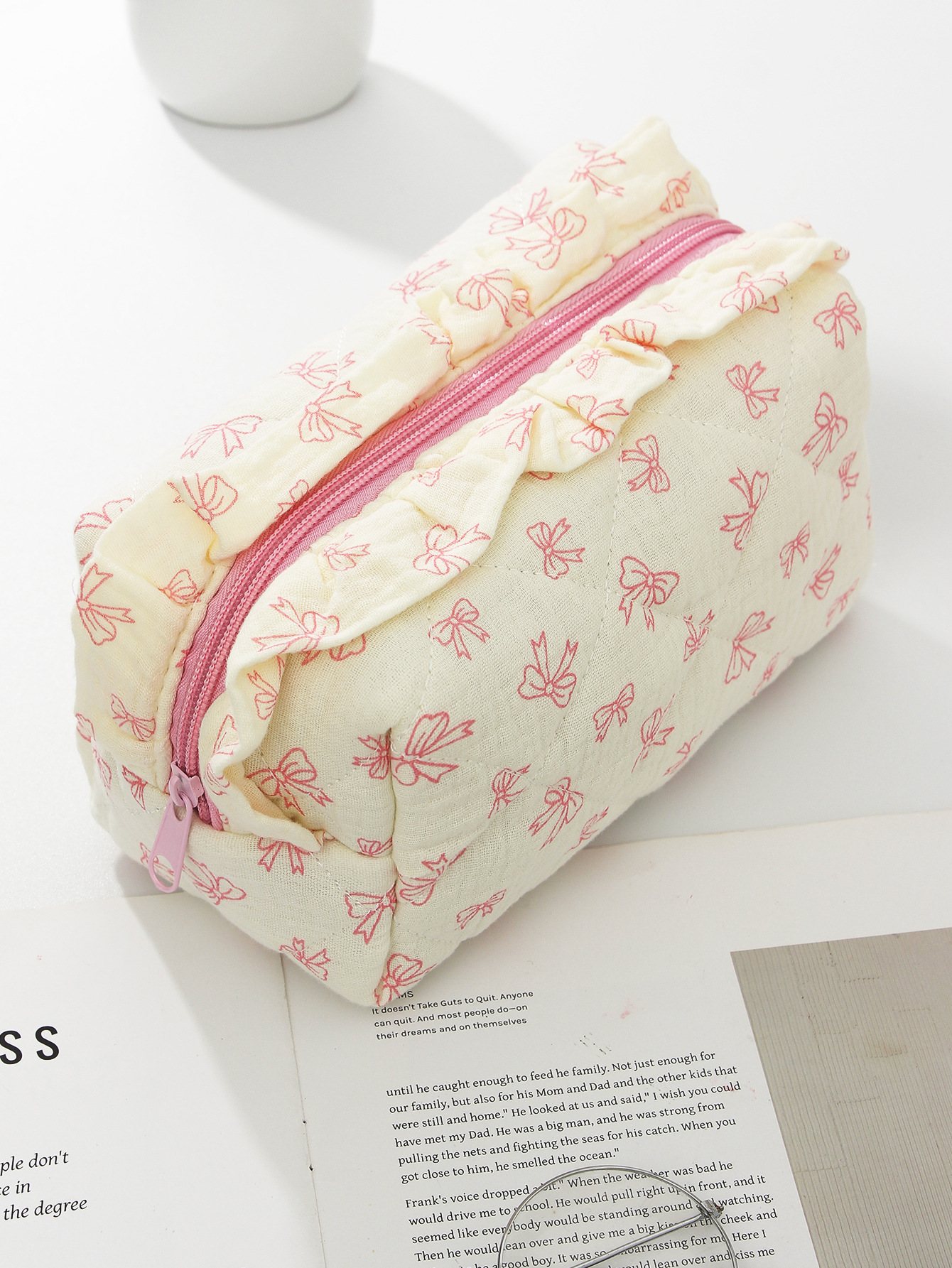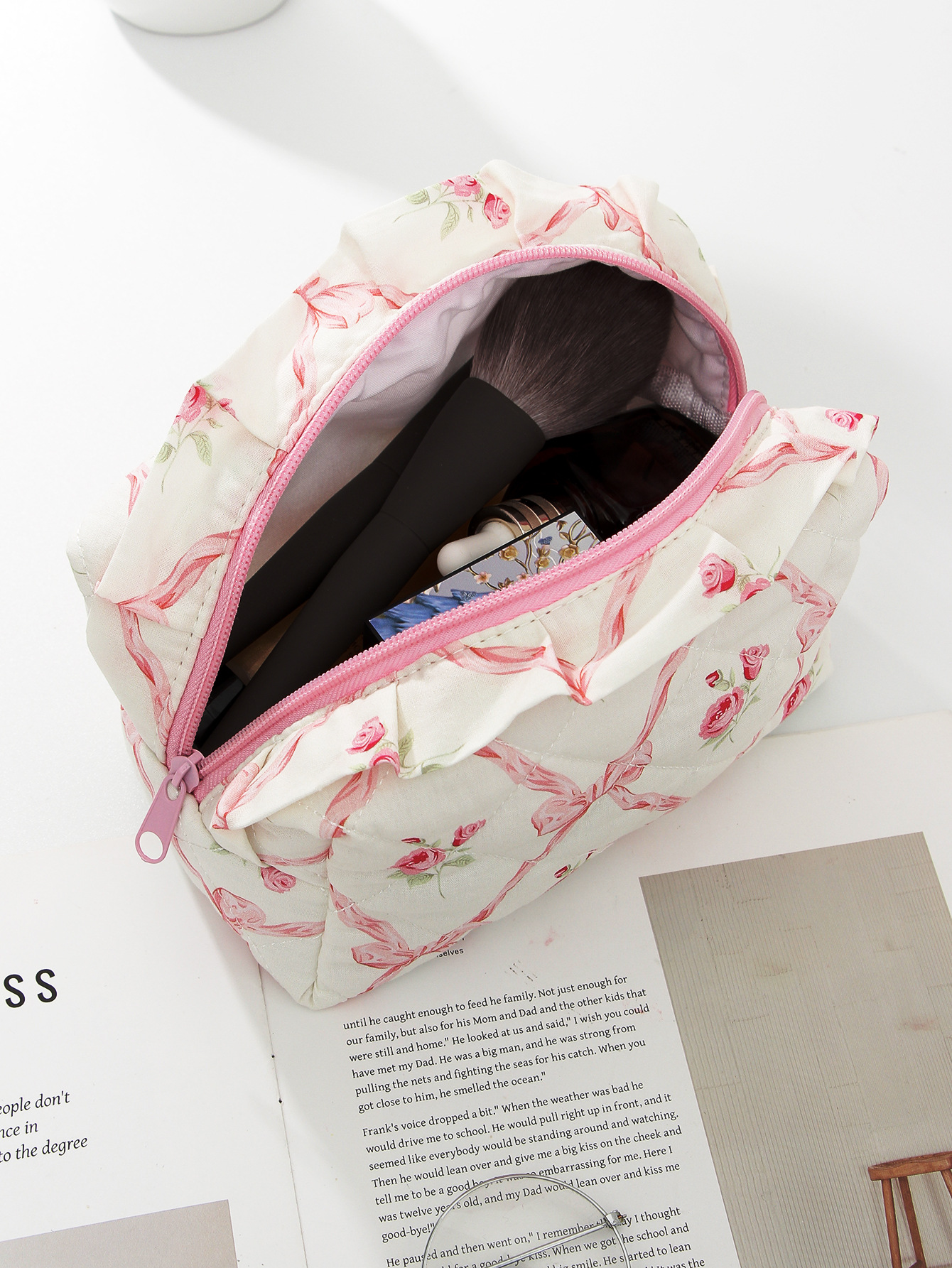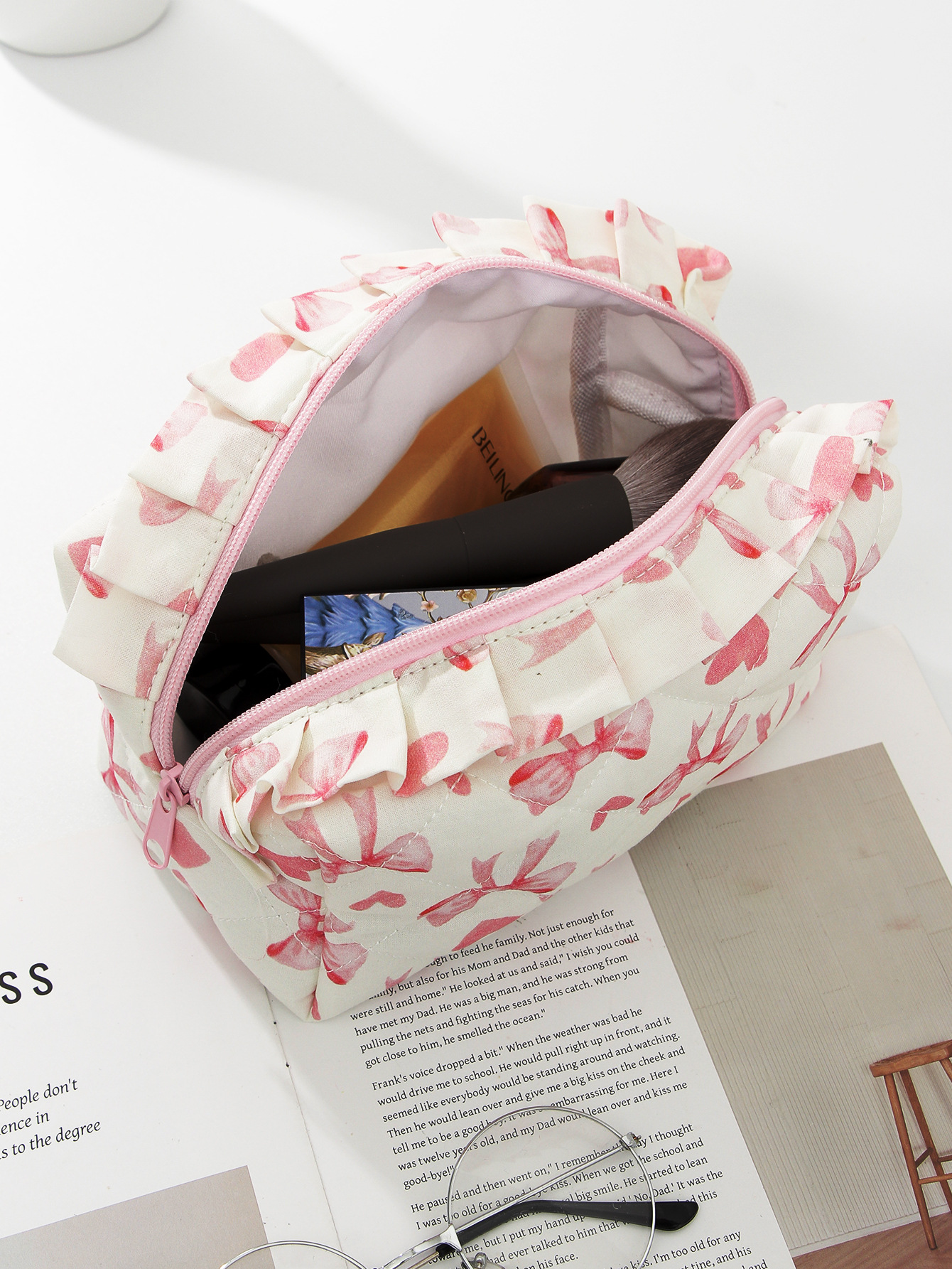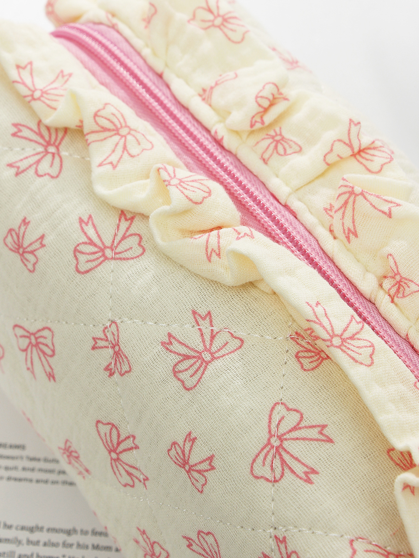 フリルデザインと可愛いリボン柄が特徴の韓国風キルティング化粧ポーチ。