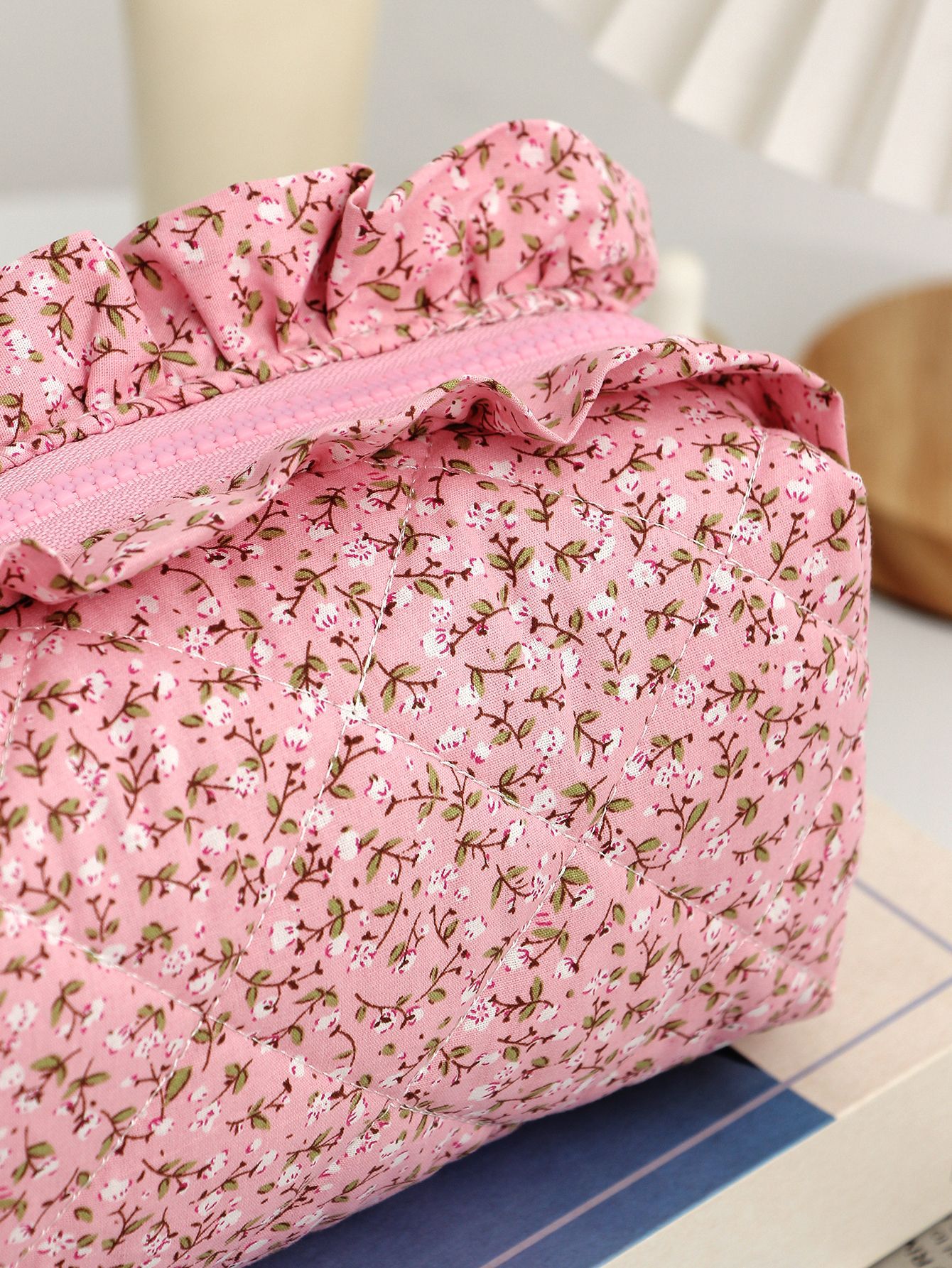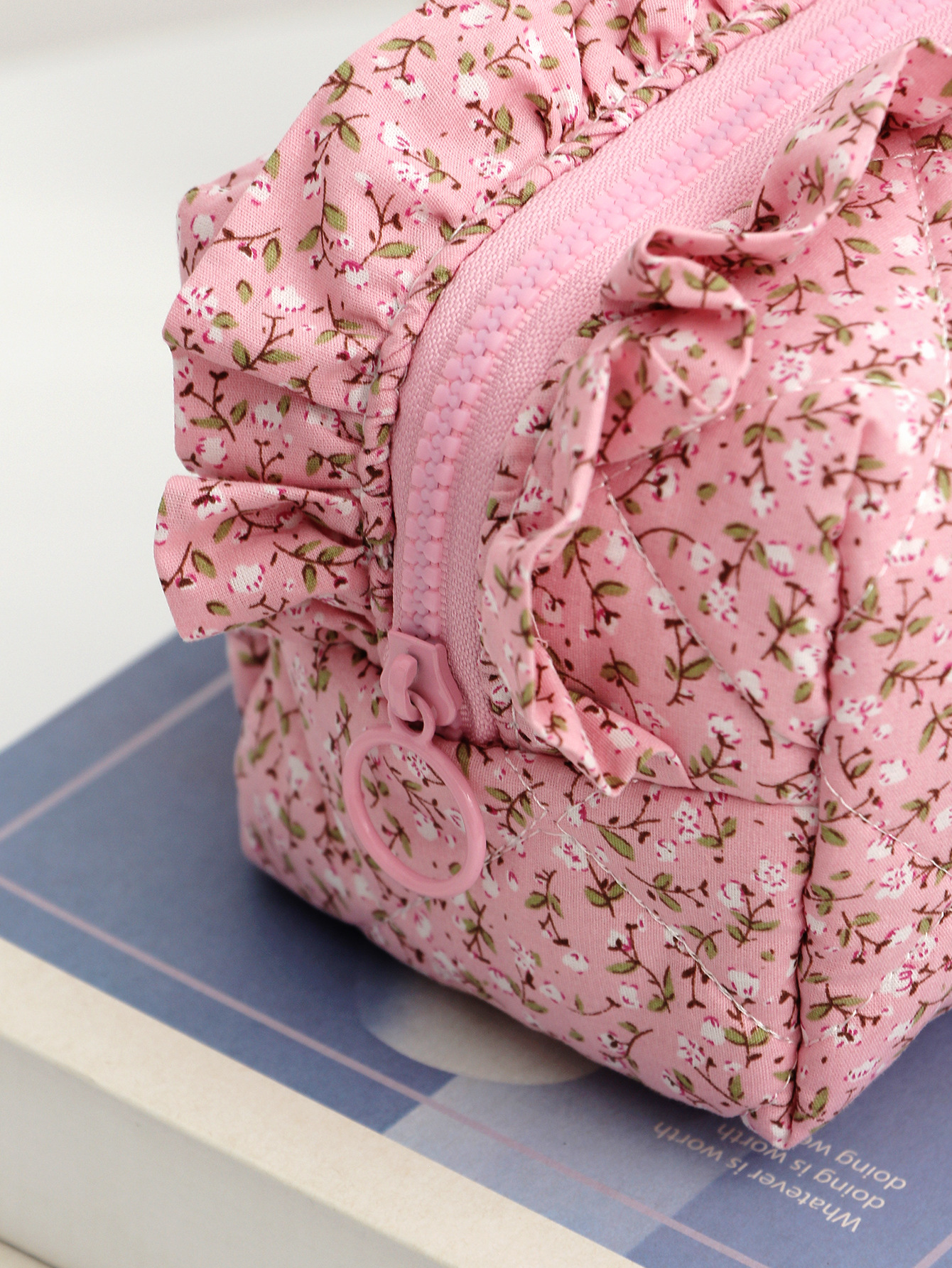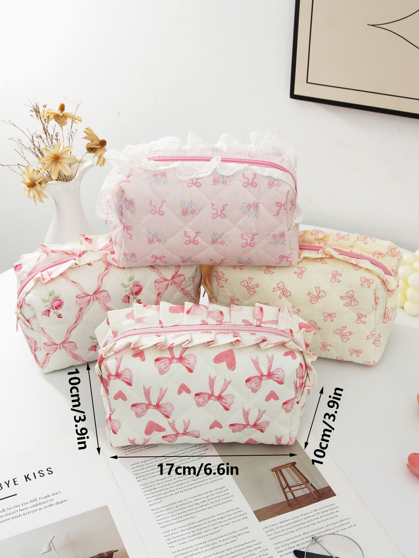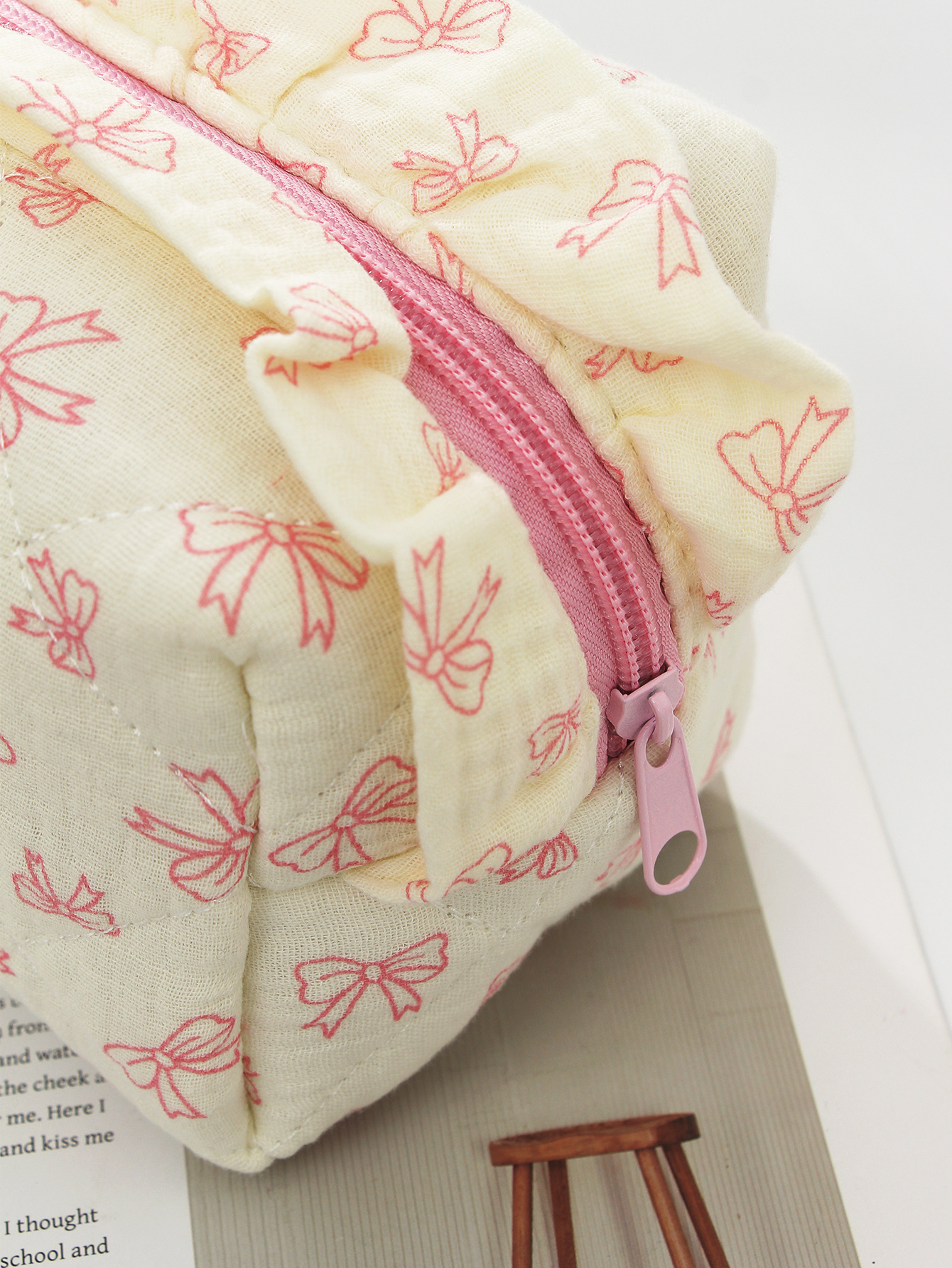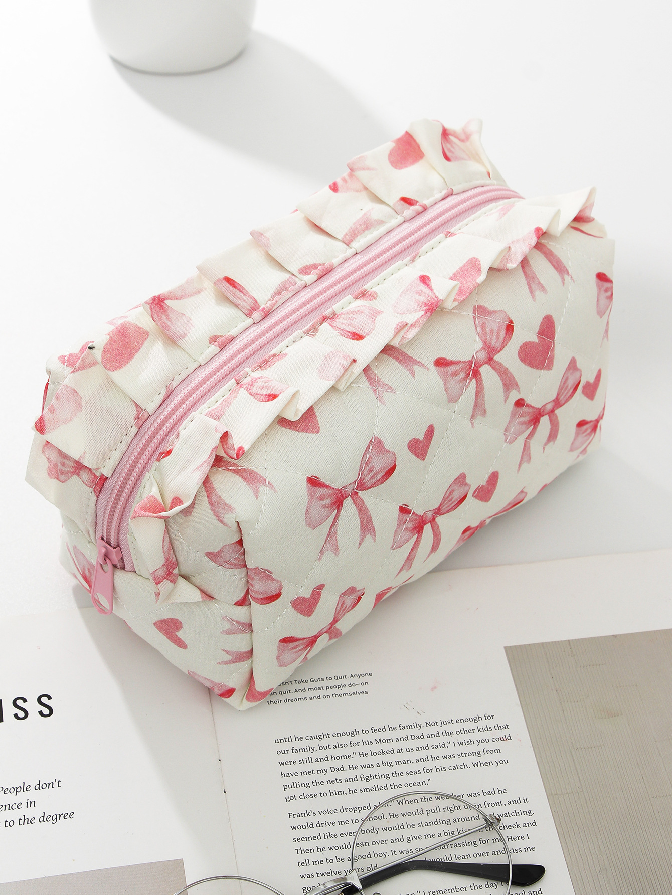 フリルデザインと可愛いリボン柄が特徴の韓国風キルティング化粧ポーチ。