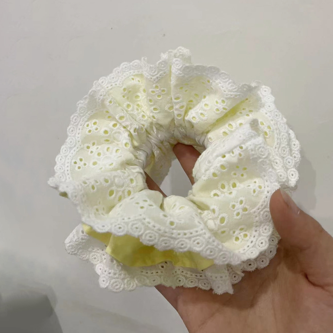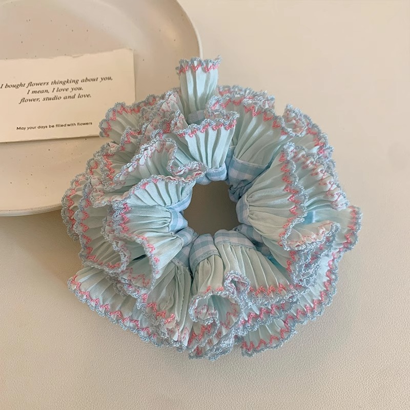 淡く爽やかなブルーのチェック柄生地をベースに、繊細なレースとプリーツを何層にも重ねたボリューム感あるシュシュ。