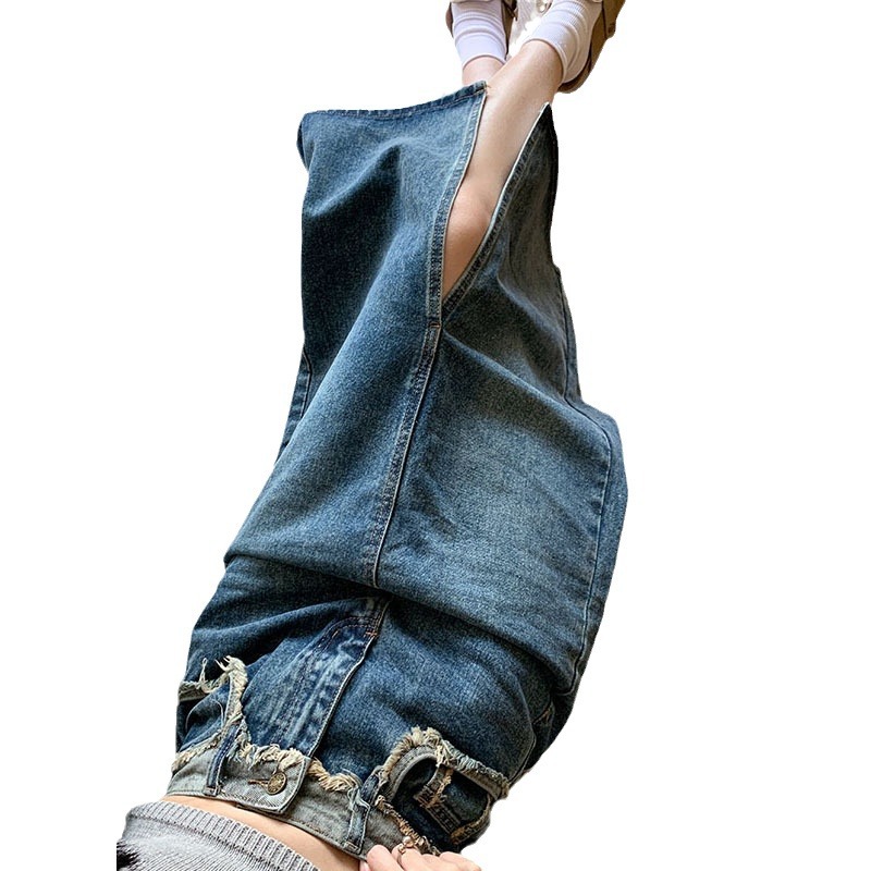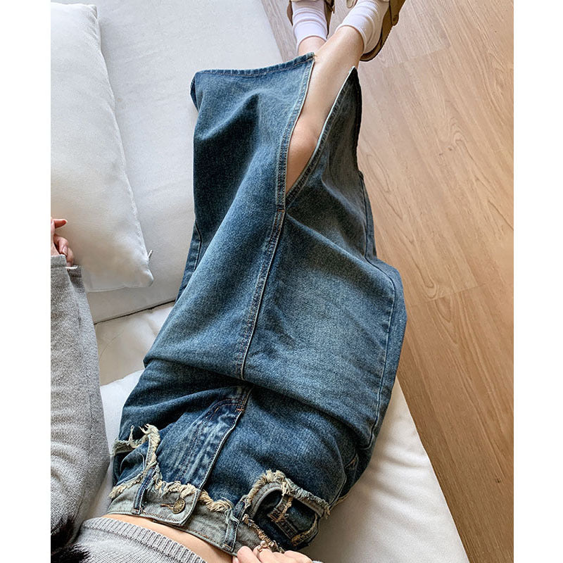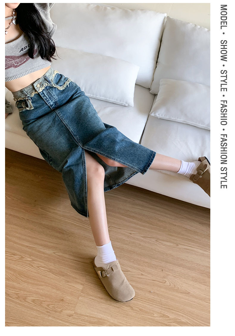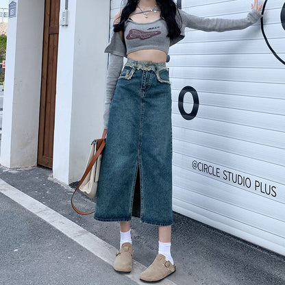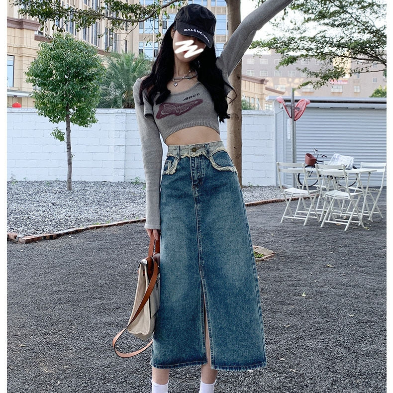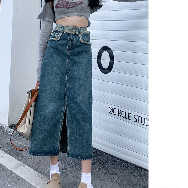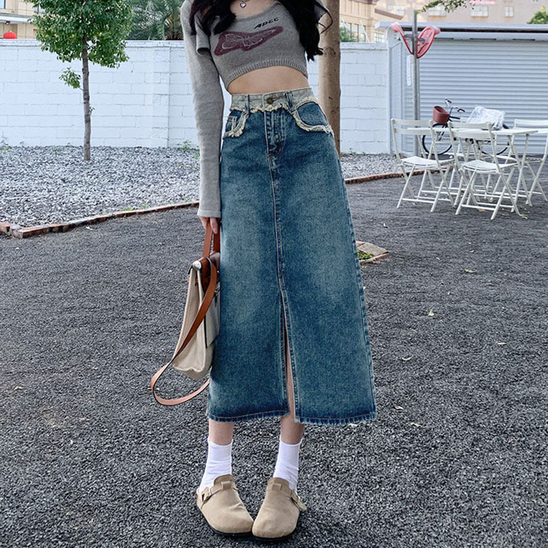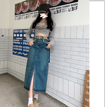 ハイウエストスリットデニムスカート|レトロAラインロングスカート レディース