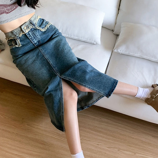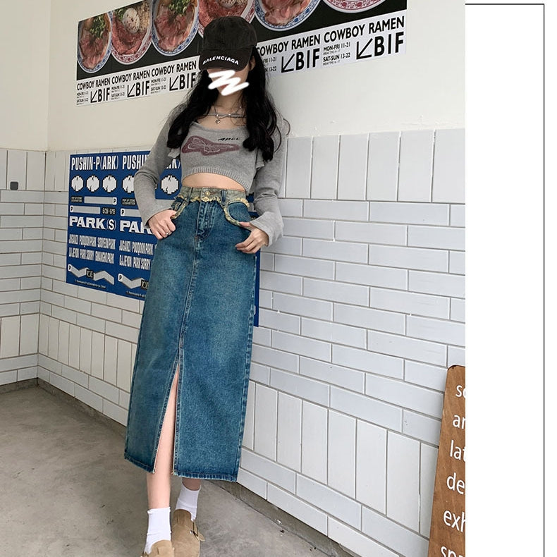 kawai-profileハイウエストスリットデニムスカート|レトロAラインロングスカート レディース