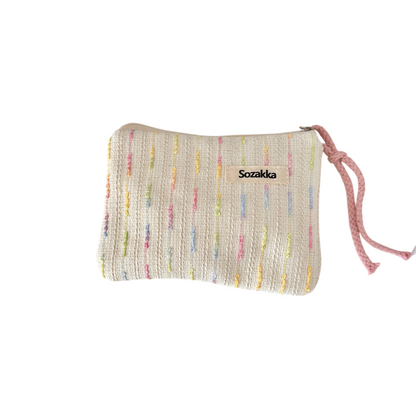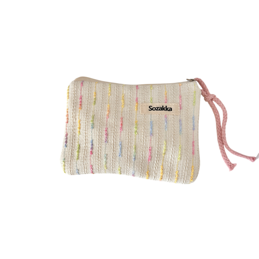 パステル調の刺繍が施された、ふんわりとしたコットン生地のミニポーチ。