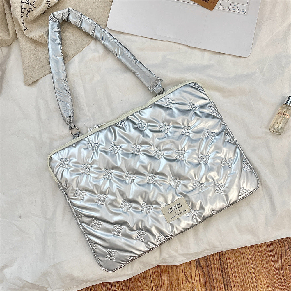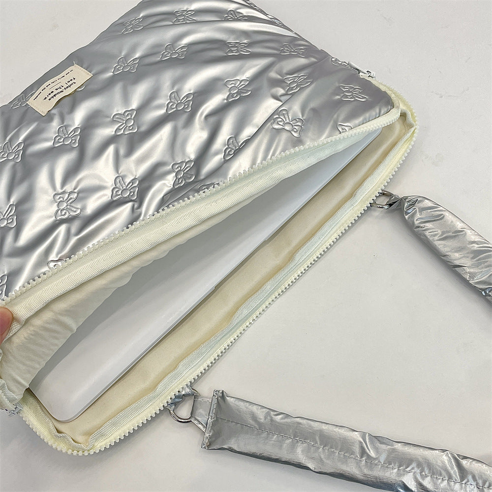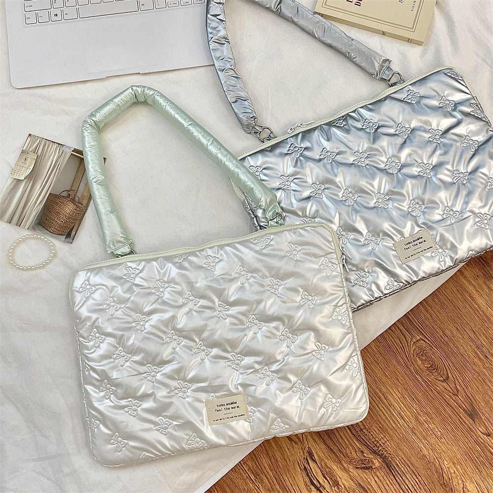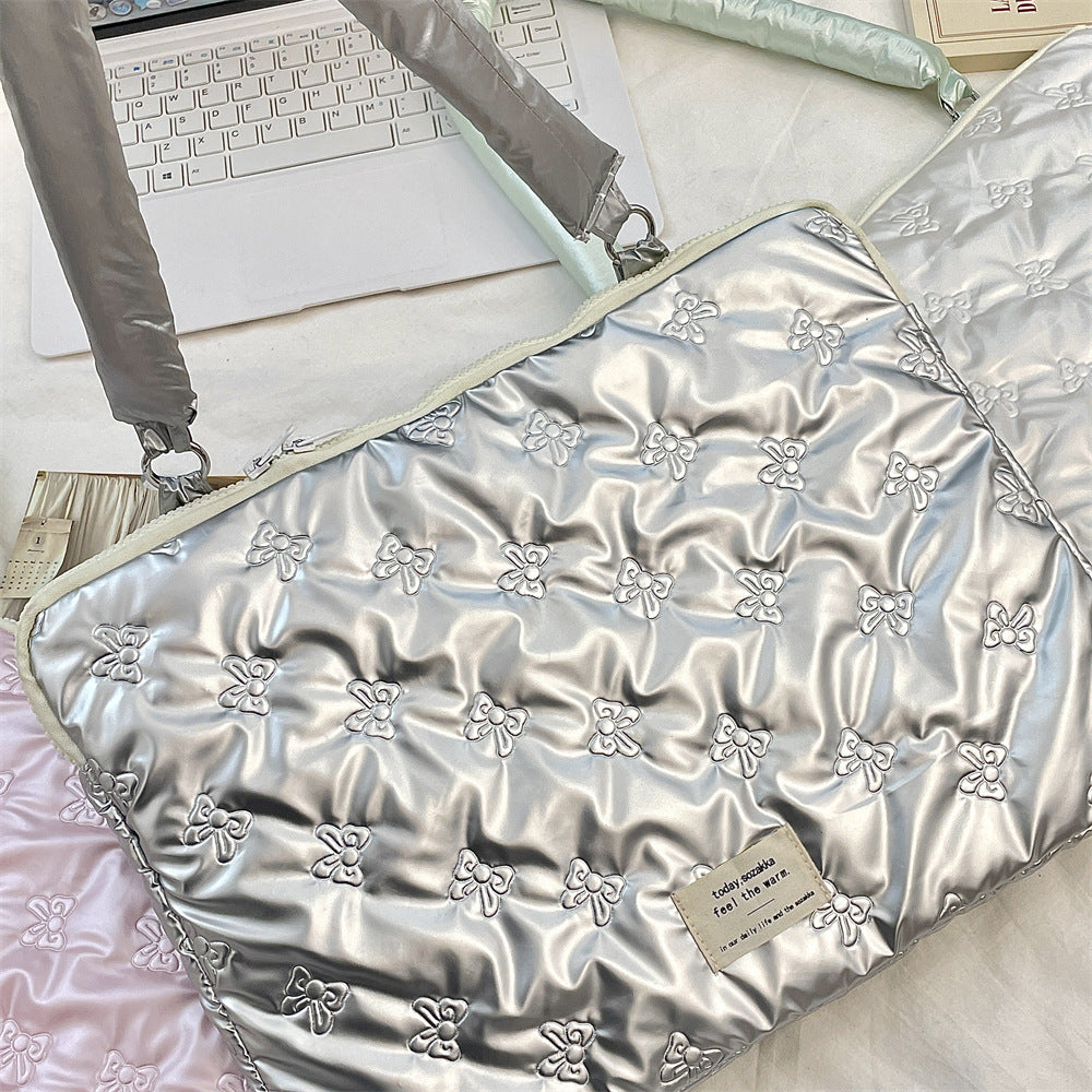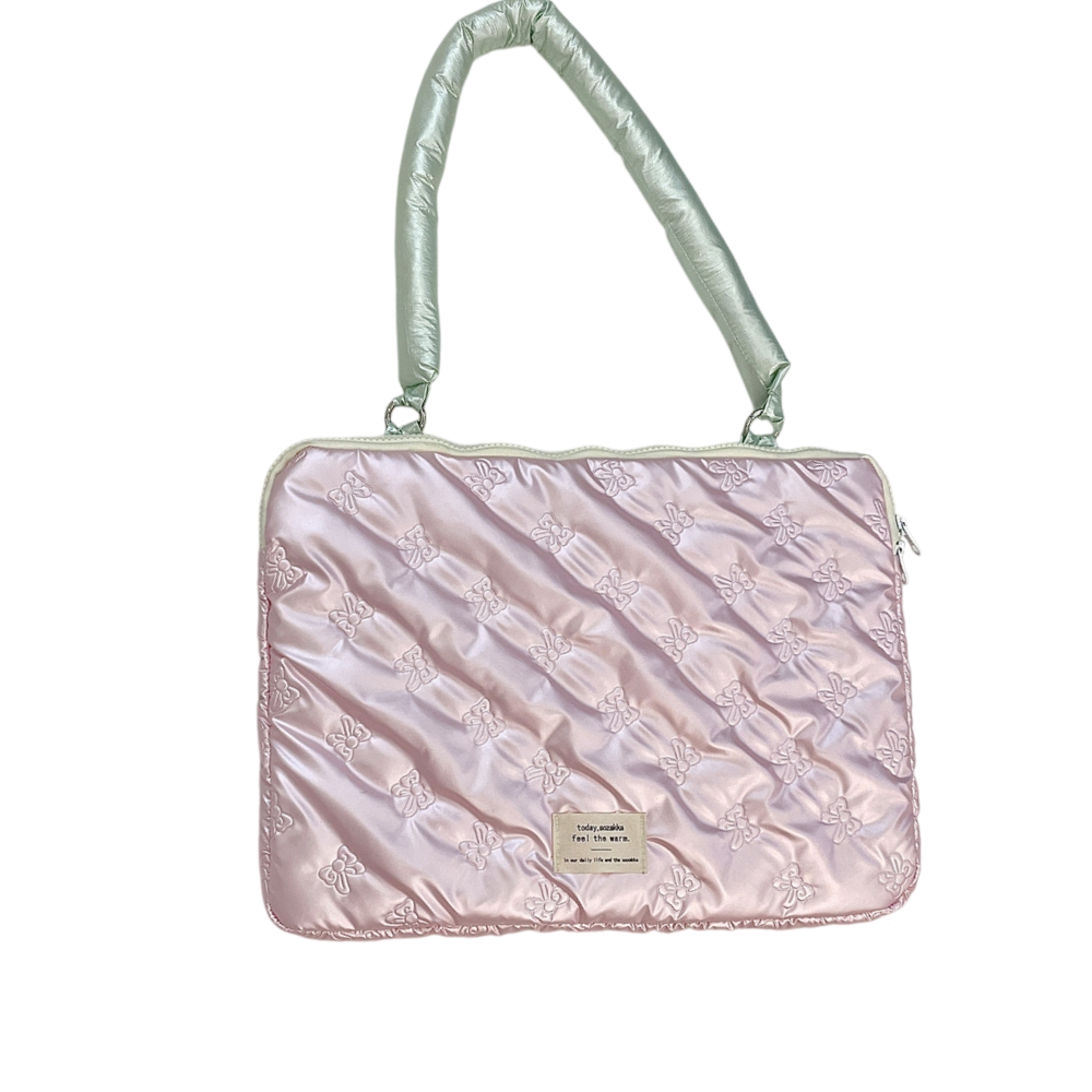 💼 可愛らしいリボン刺繍がちりばめられた、ふんわりキルティング加工のスリーブ&ショルダーバッグです。