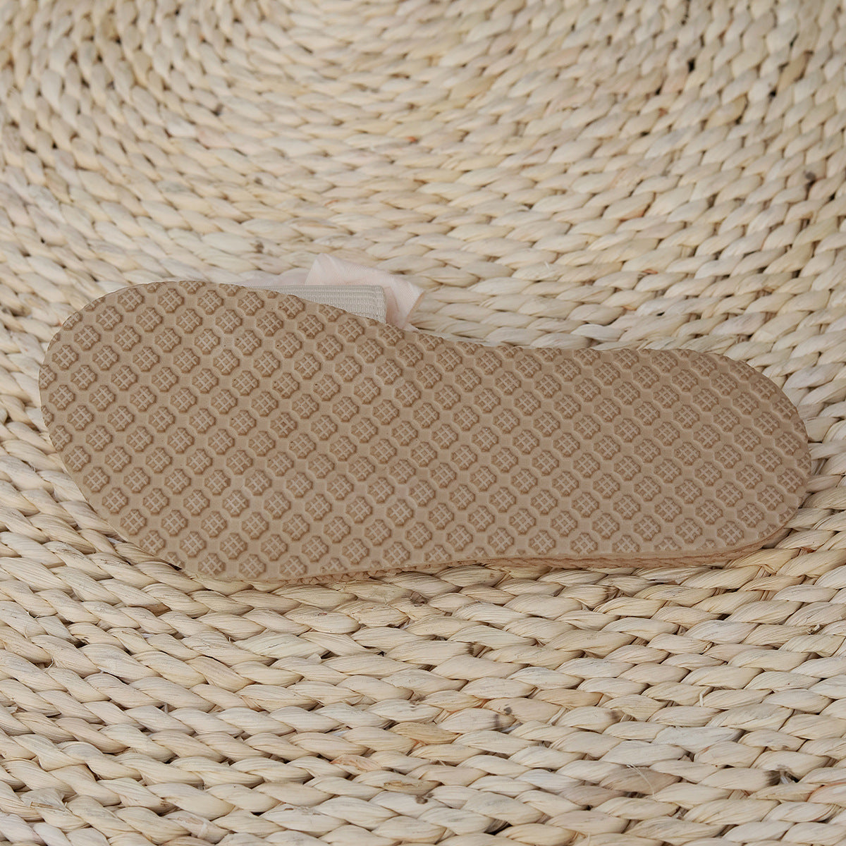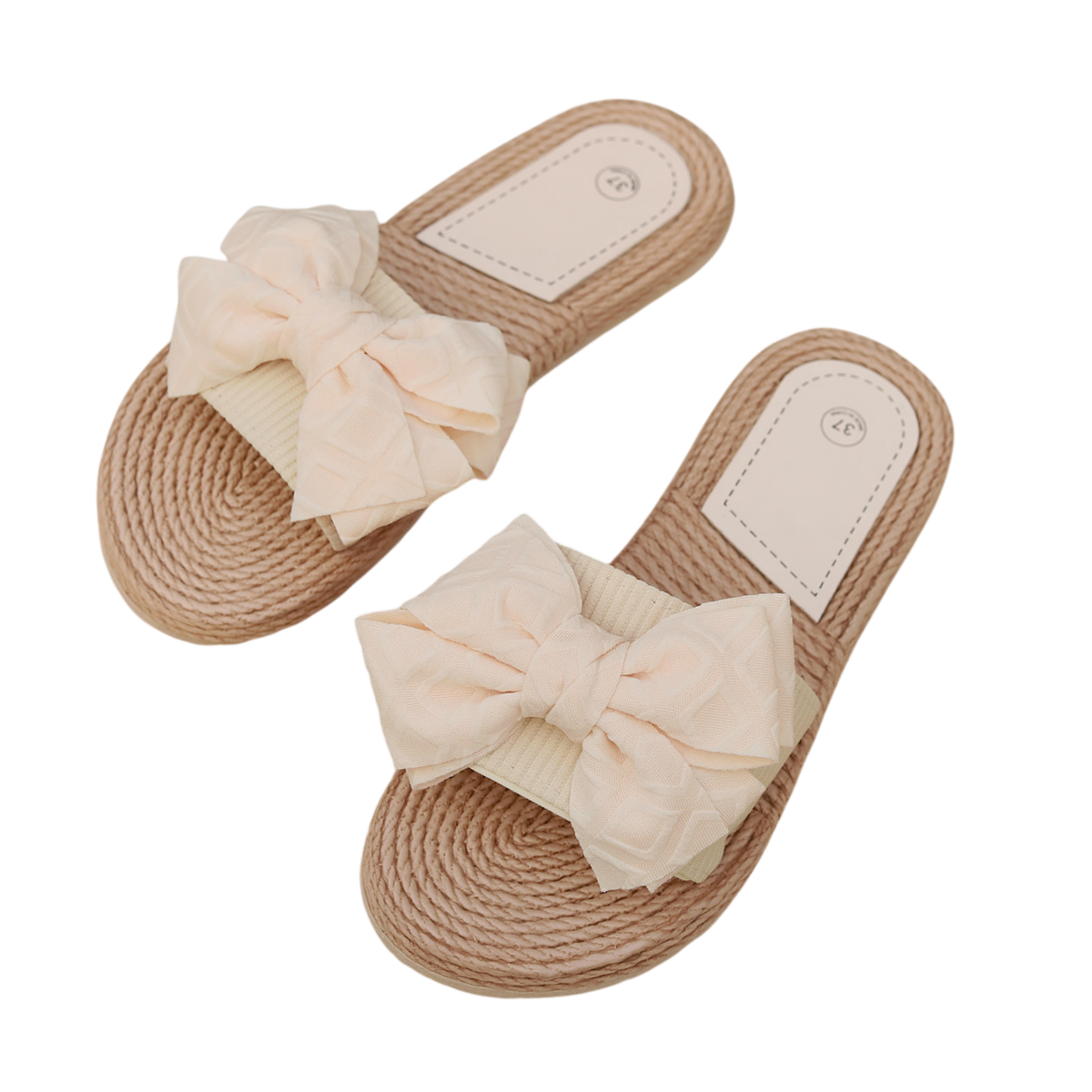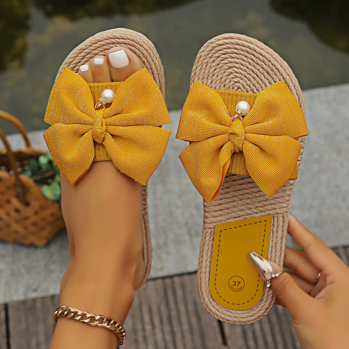 夏の履きに最適な、黄麻布素材のリボン付きフリップフロップスリッパ。